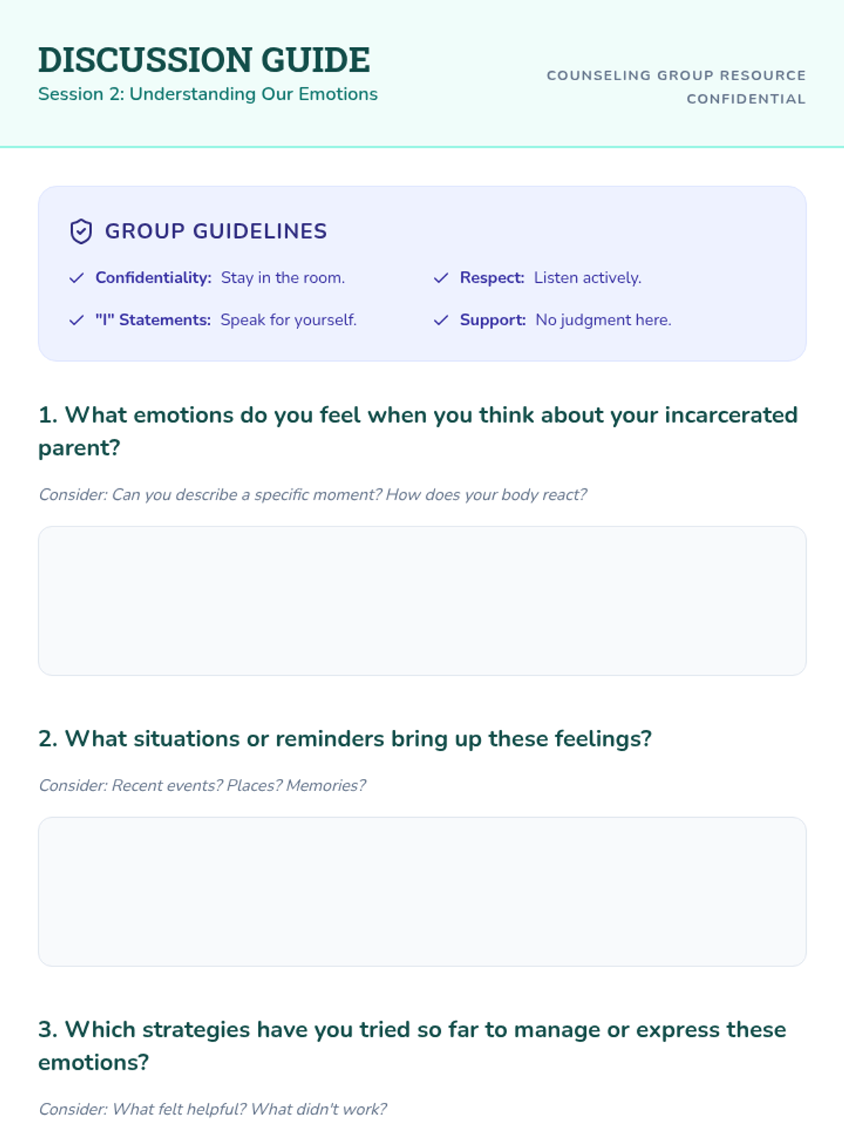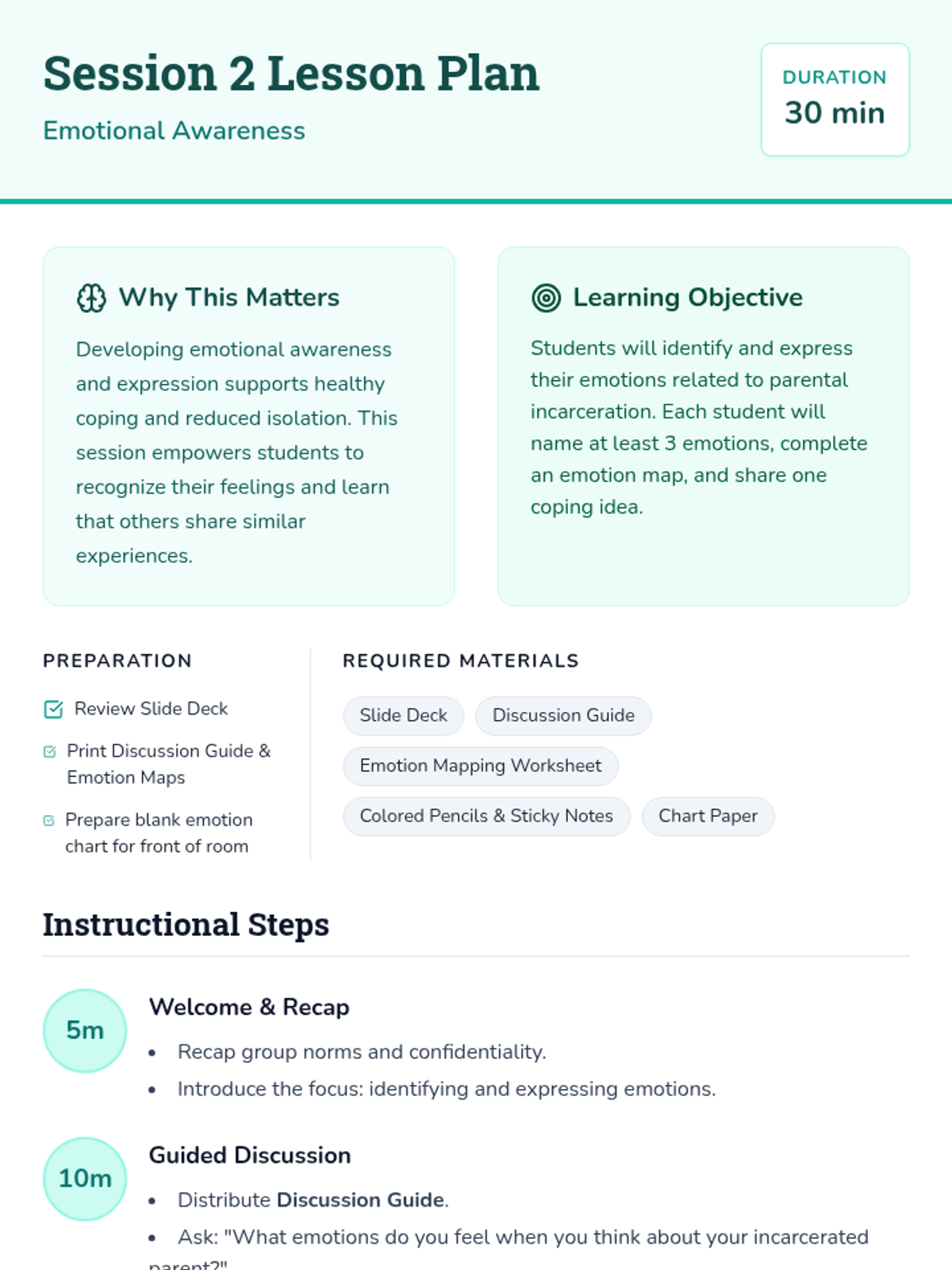 A 4-session small group counseling sequence for middle school students navigating the challenges of parental incarceration, focusing on emotional awareness, coping skills, and resilience.