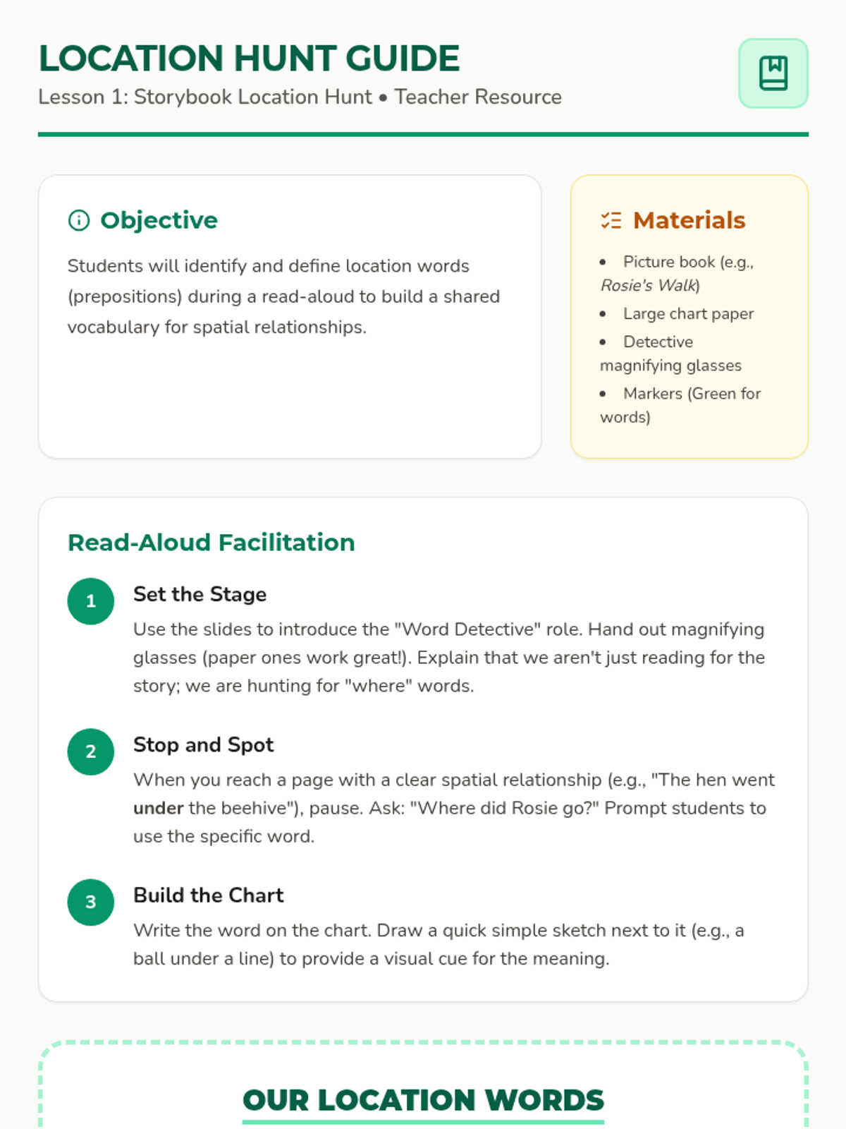 This Kindergarten sequence introduces students to location words through literature, games, and creative projects. Students move from identifying spatial relationships in storybooks to authoring their own descriptive pages for a class book.
