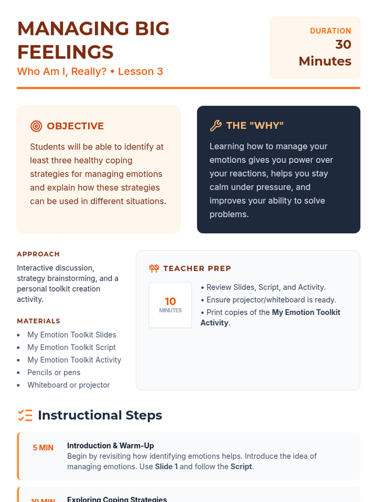 A multi-session unit for 6th-grade students to explore self-awareness, identify emotions, manage reactions through personal toolkits, and develop empathy and goal-setting skills.