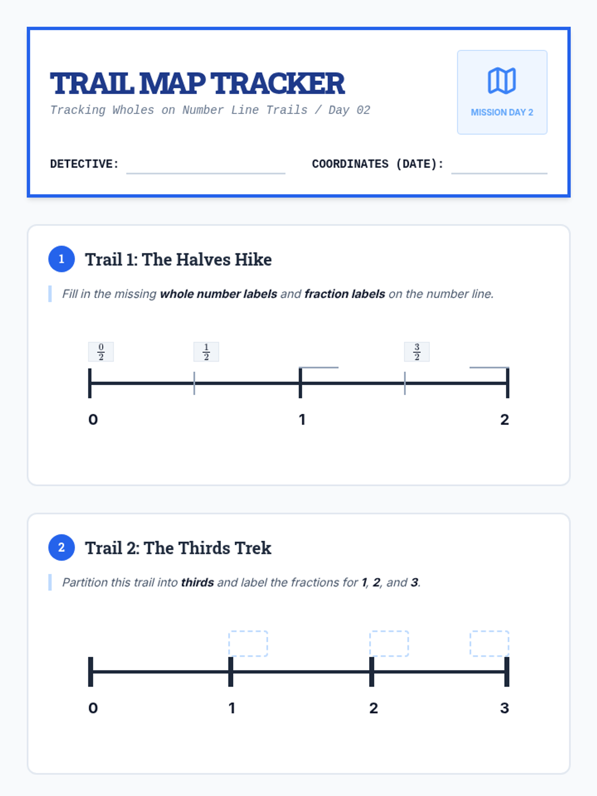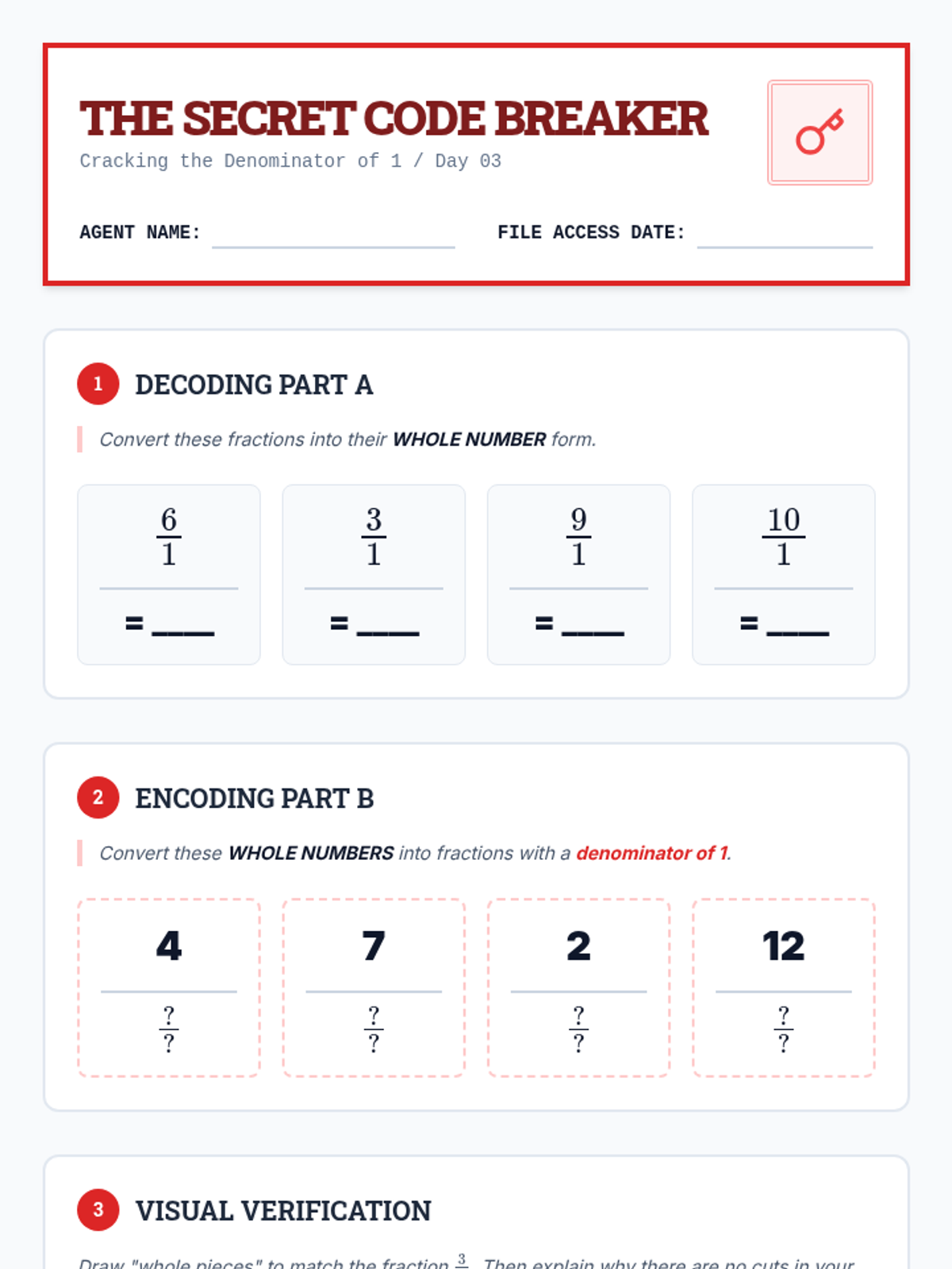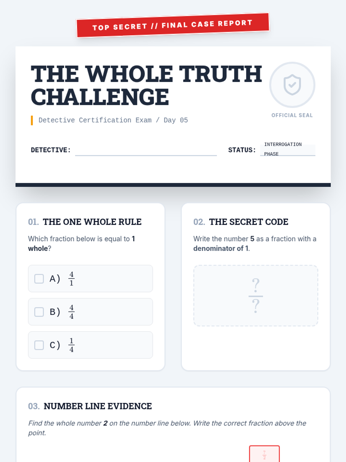 A 5-day small group intervention sequence designed to help 3rd-grade students master expressing whole numbers as fractions and recognizing equivalent whole number fractions through a "Fraction Detective" theme.
