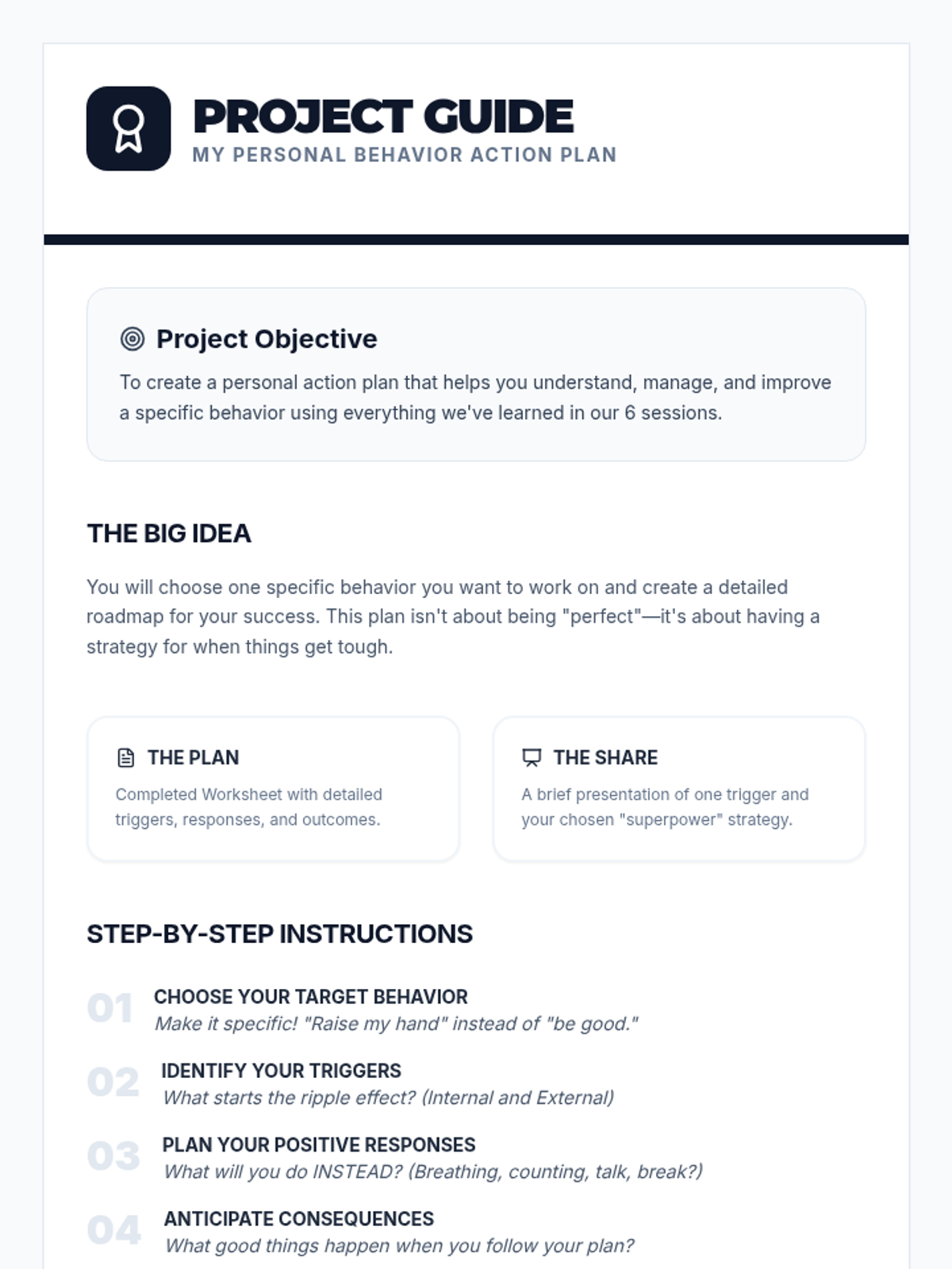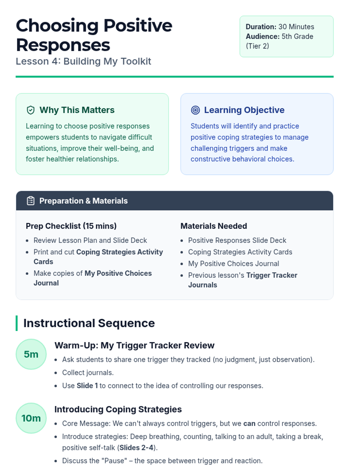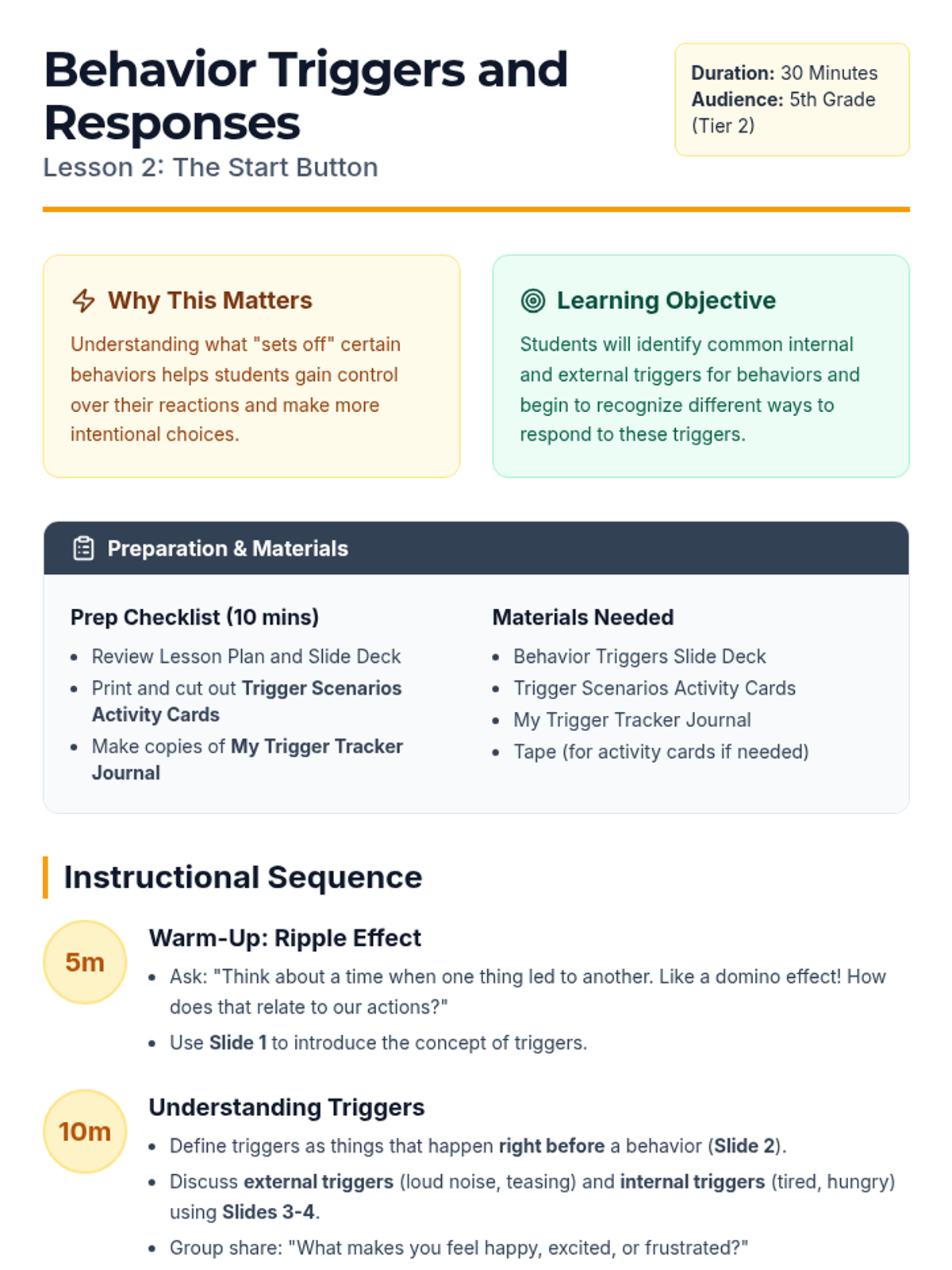 A 6-session Tier 2 small group intervention for 5th graders designed to build self-awareness, identify behavioral triggers, understand consequences, and develop personal action plans for positive behavior.