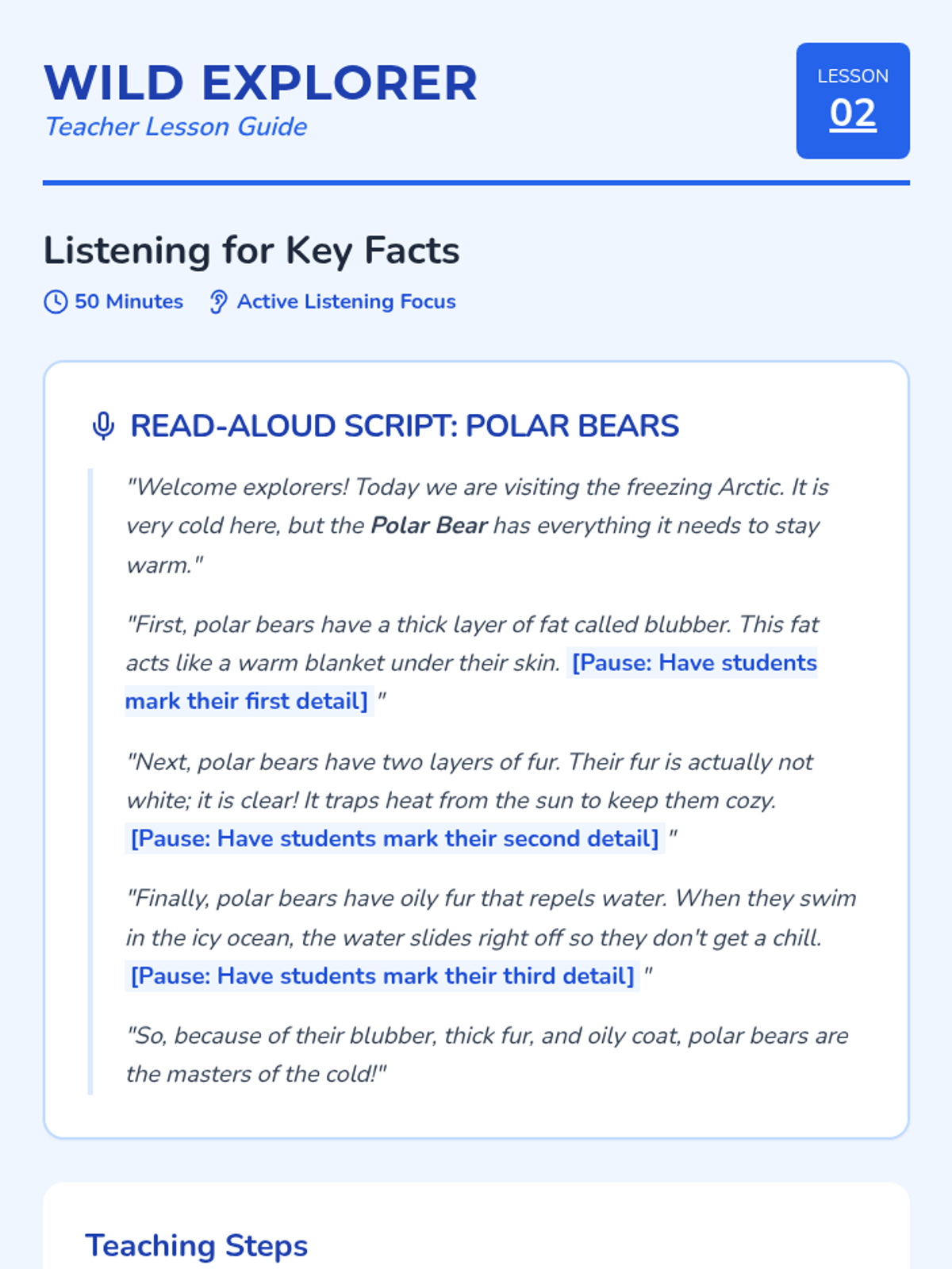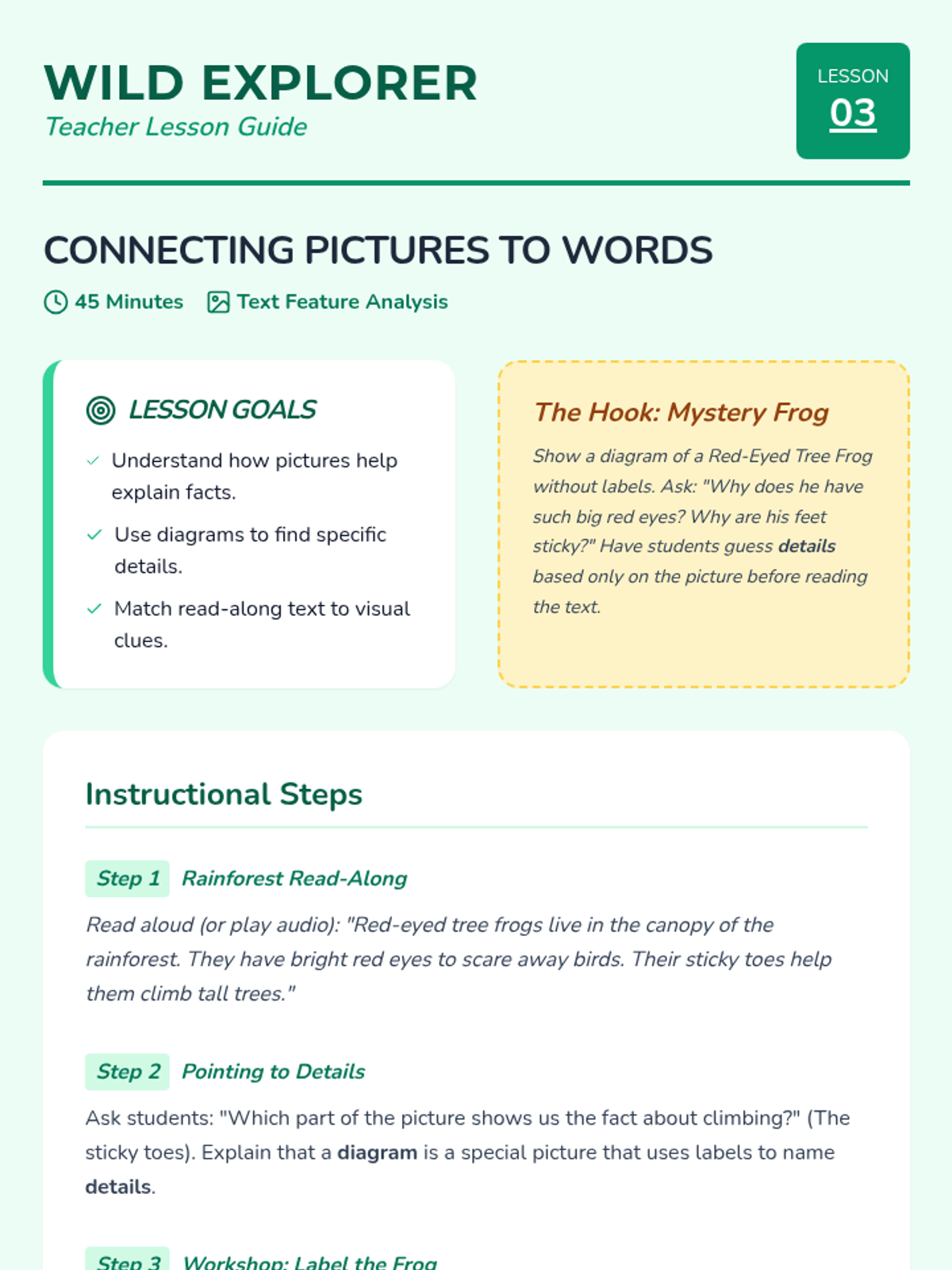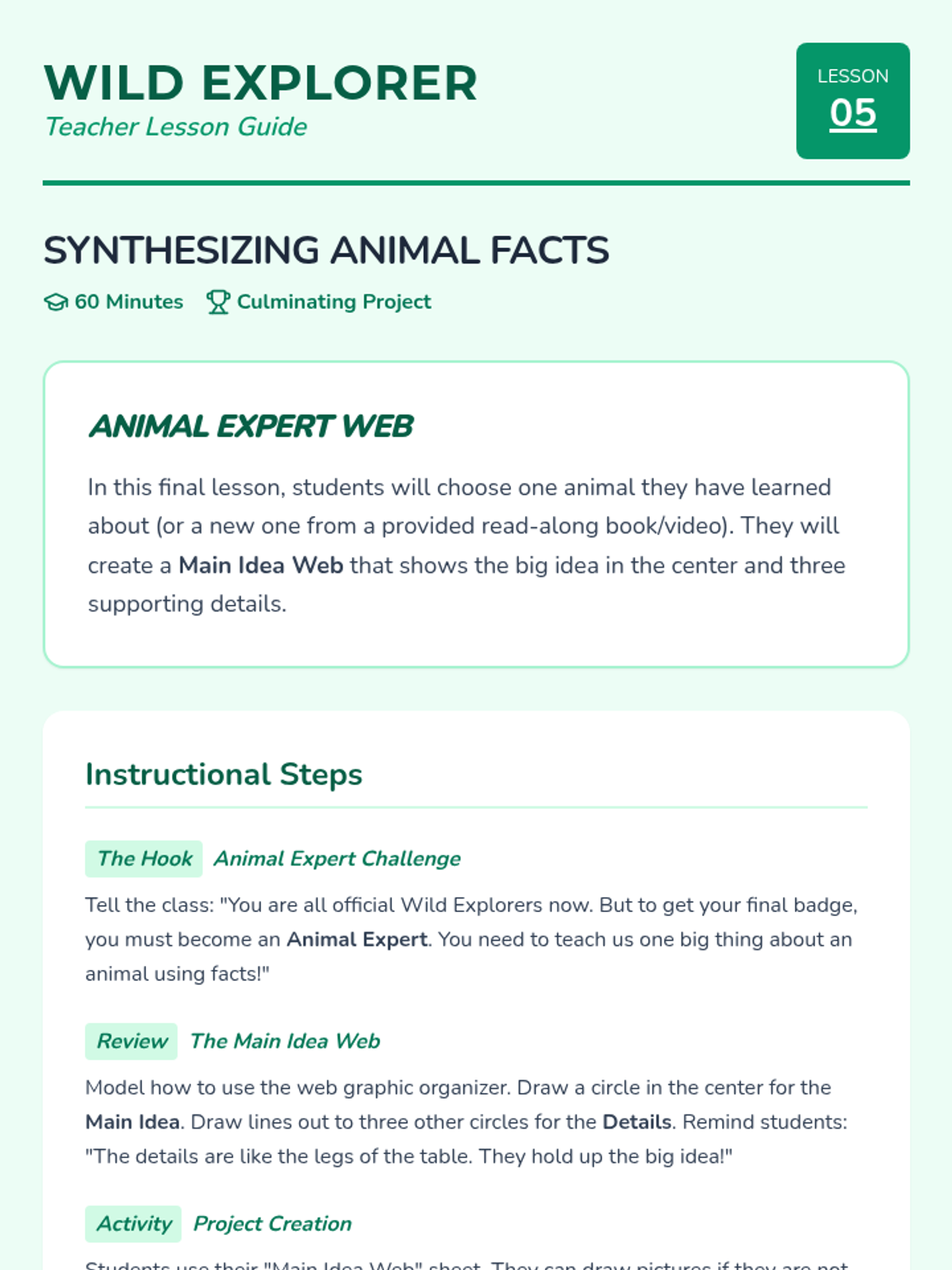 A 1st-grade ELA sequence focused on identifying main ideas and supporting details through animal-themed informational texts. Students move from visual analysis to active listening and synthesizing facts in a 'Wild Explorer' themed curriculum.
