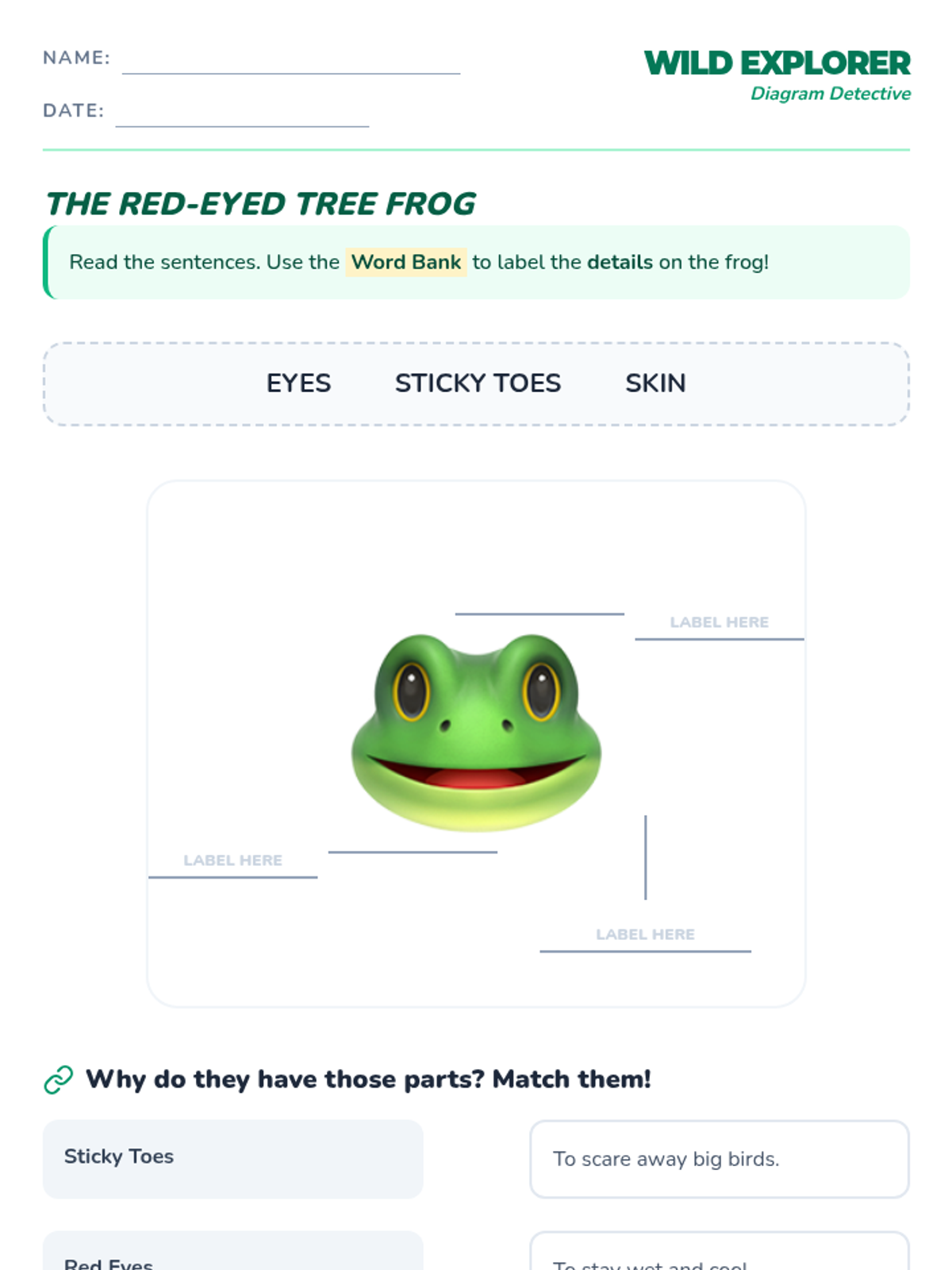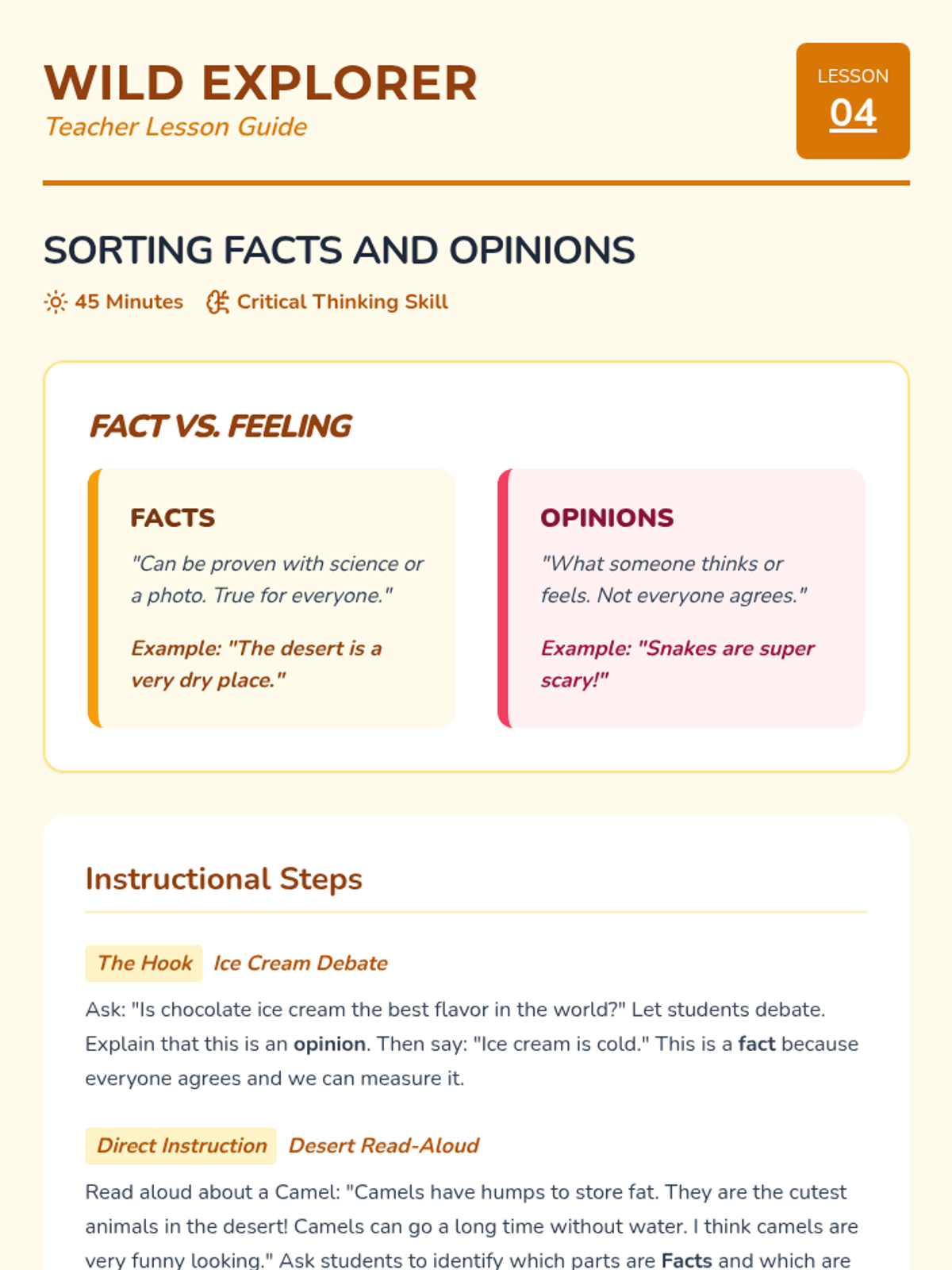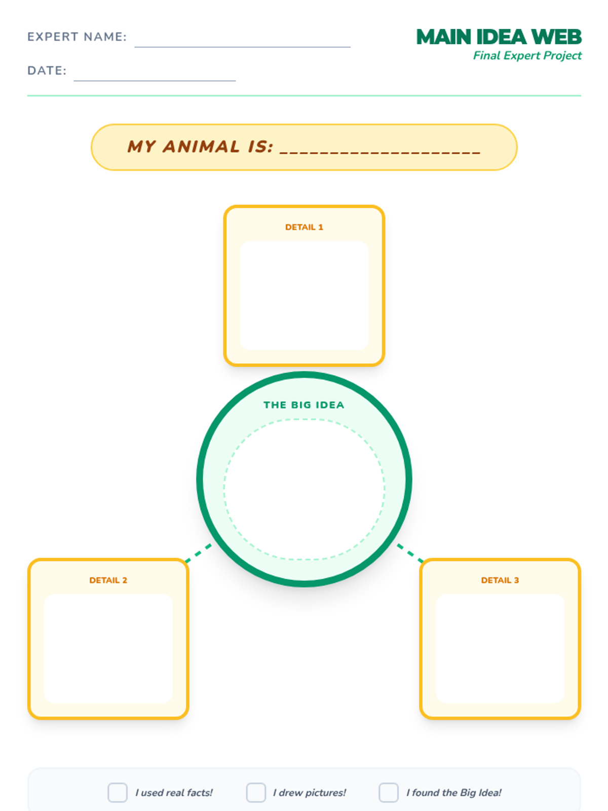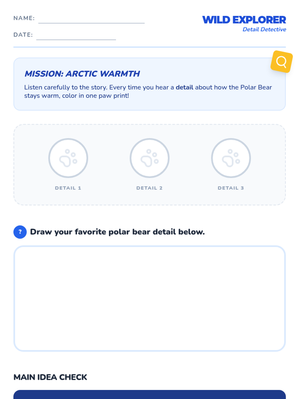 A 1st-grade ELA sequence focused on identifying main ideas and supporting details through animal-themed informational texts. Students move from visual analysis to active listening and synthesizing facts in a 'Wild Explorer' themed curriculum.