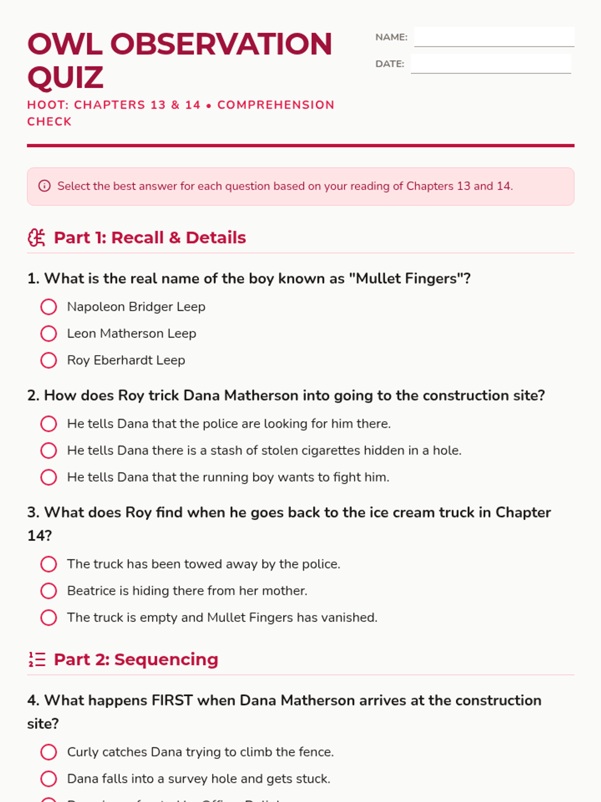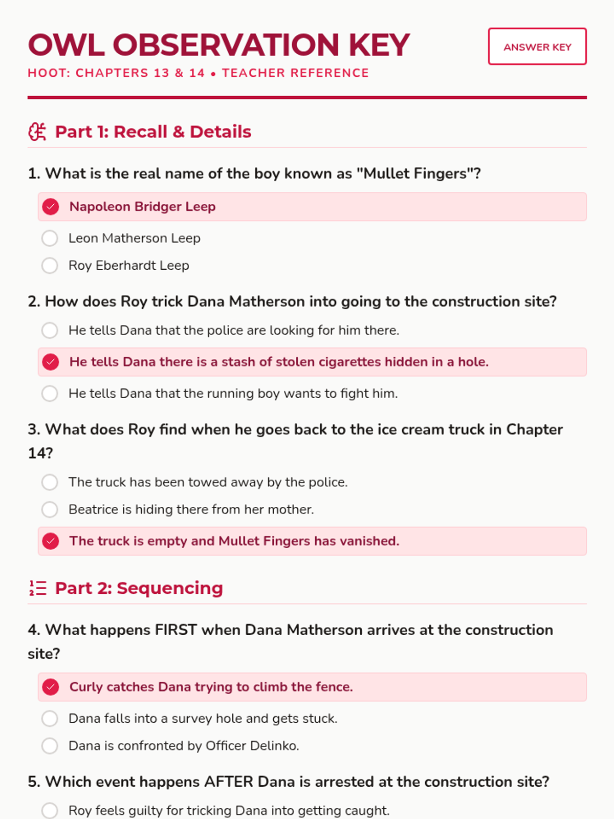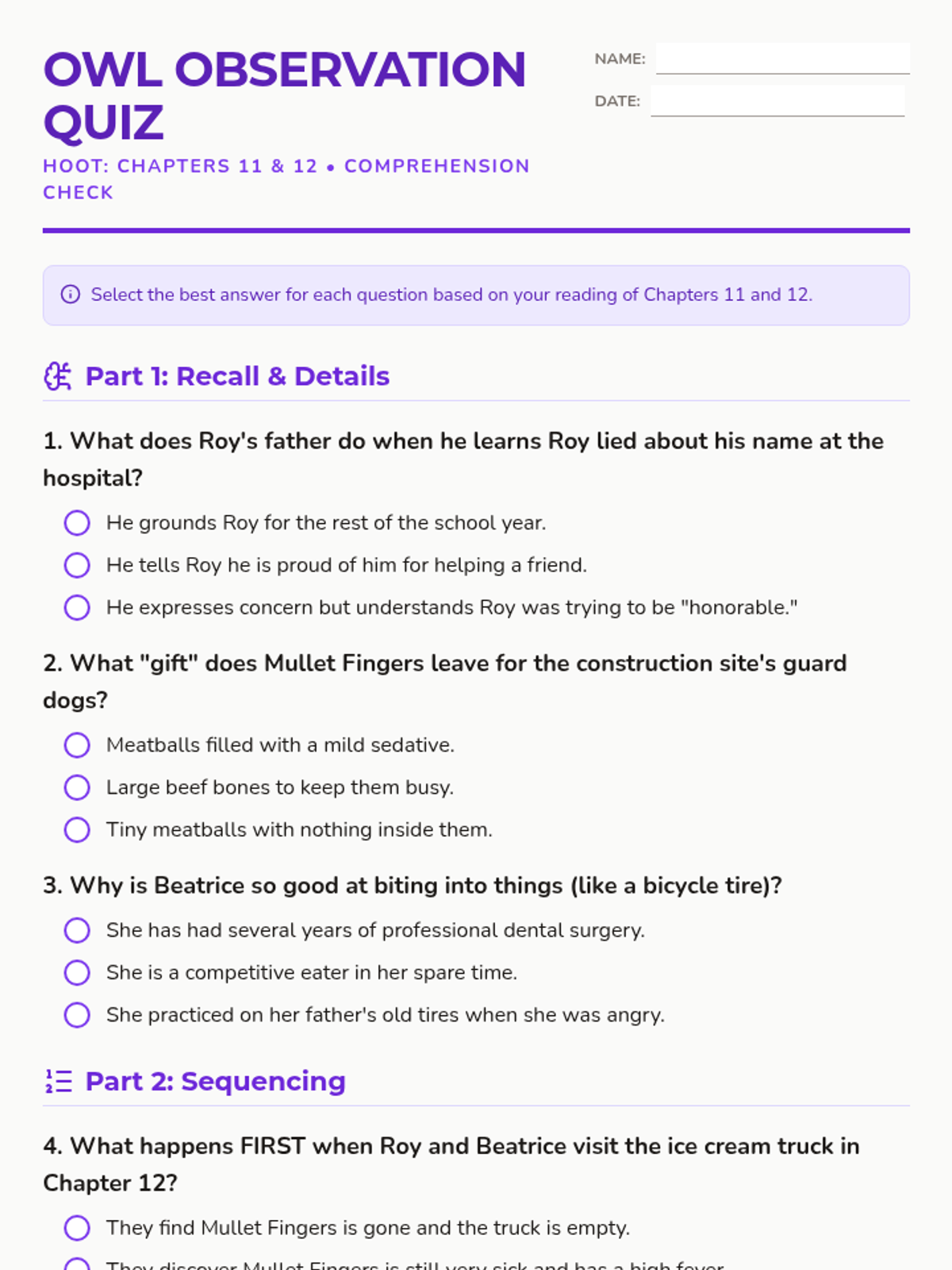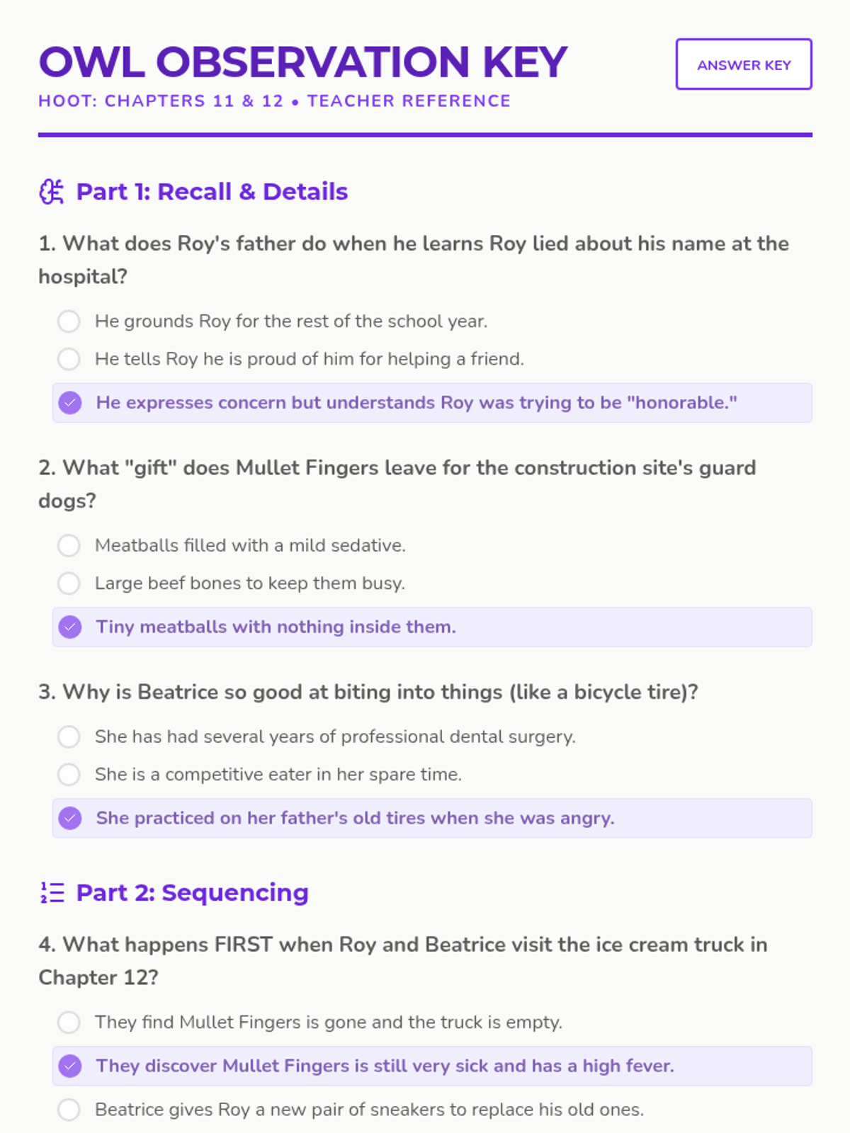 A comprehensive unit for Carl Hiaasen's Hoot, featuring chapter-by-chapter comprehension quizzes, teacher keys, and interactive slide decks.
