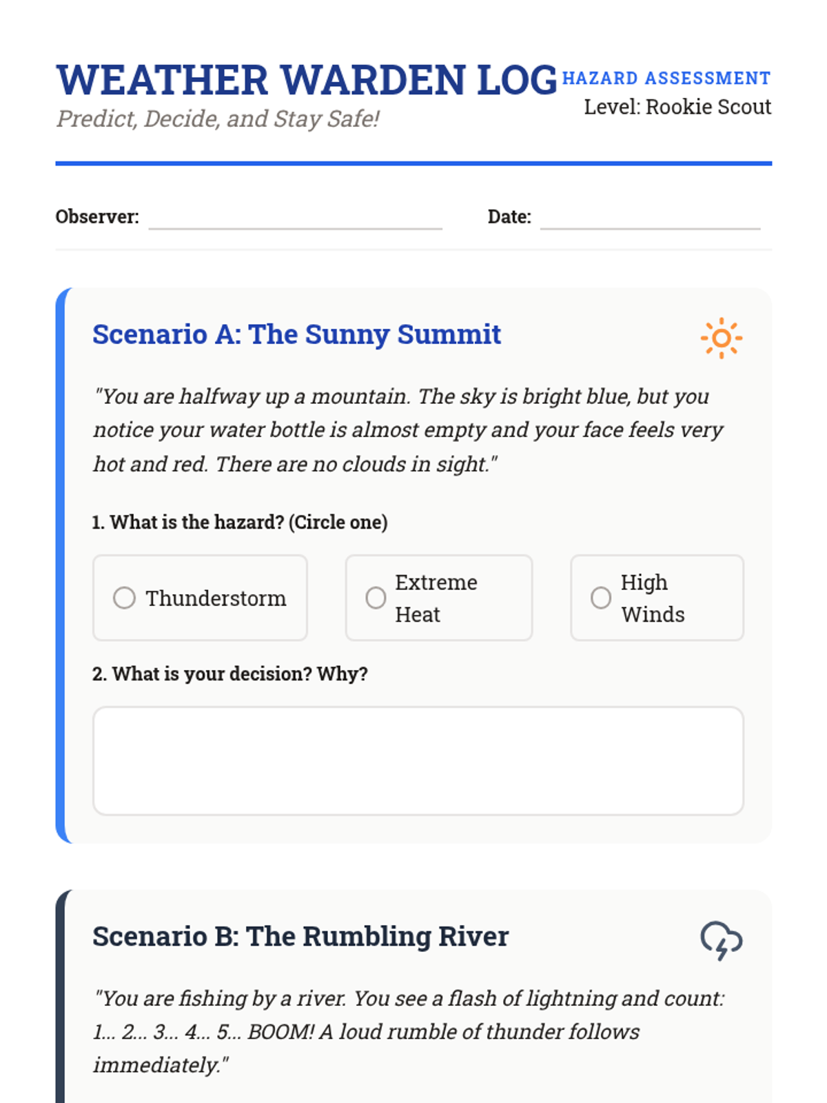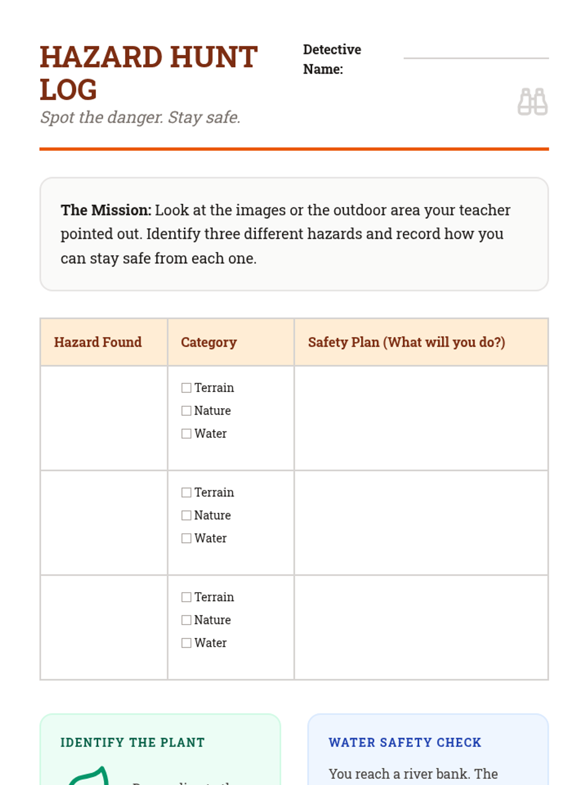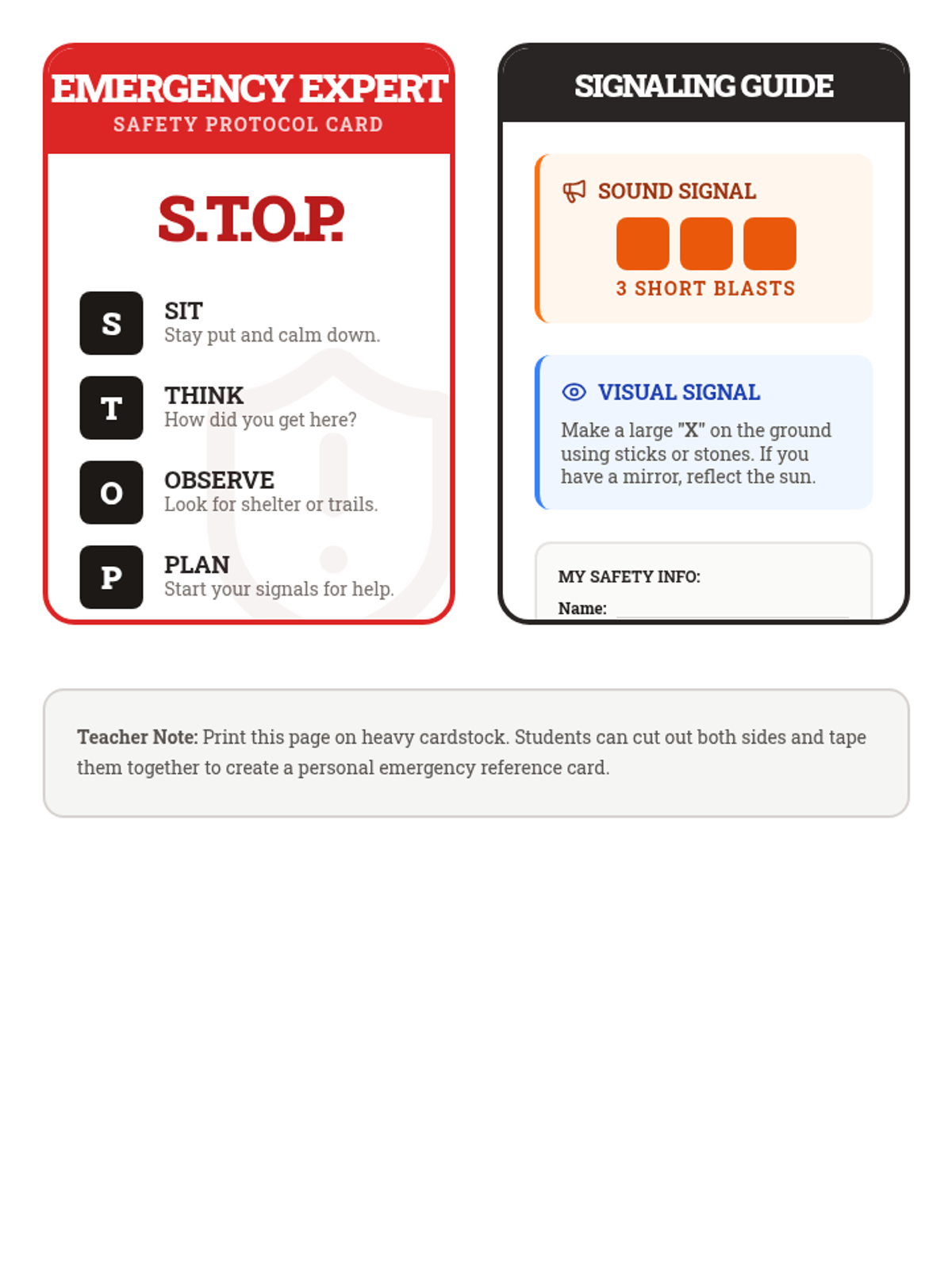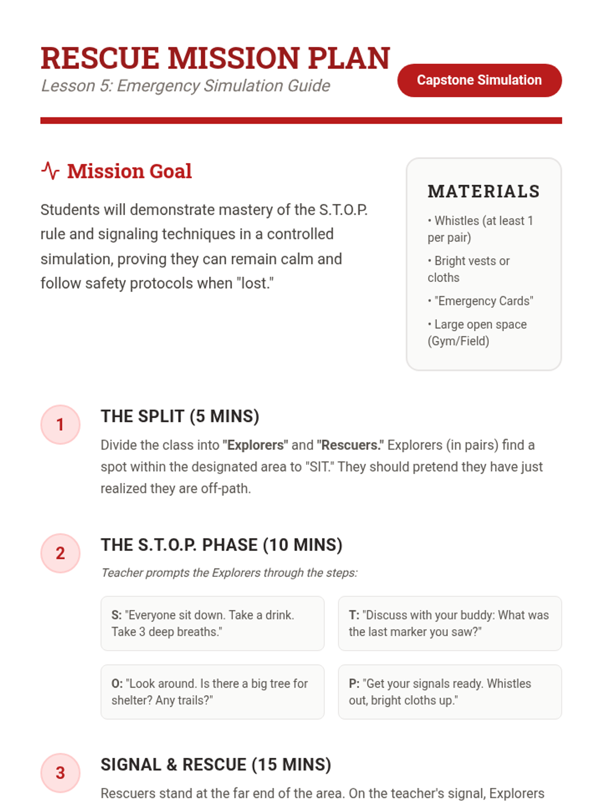 A comprehensive 5-lesson sequence for 3rd graders on outdoor safety, covering essential gear, weather hazards, navigation, risk assessment, and emergency signaling using the S.T.O.P. rule. Students engage in practical workshops and simulations to build confidence in the wilderness.
