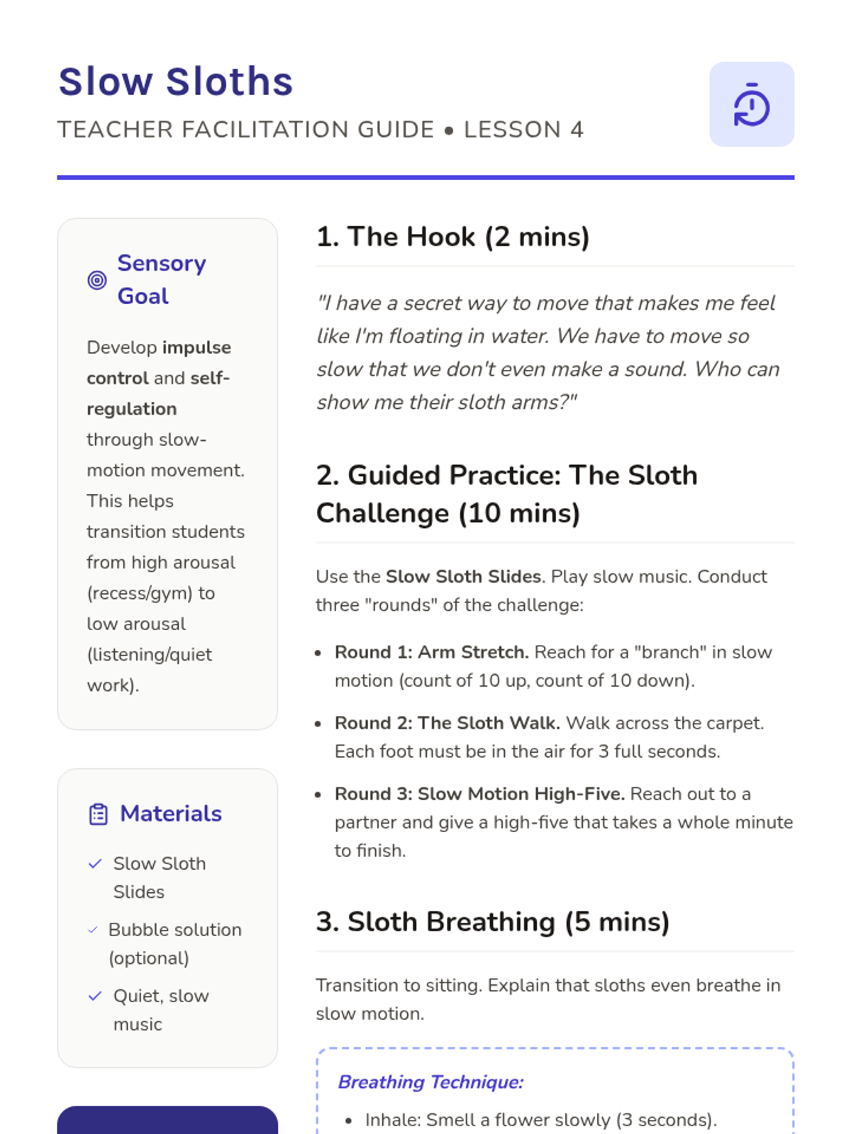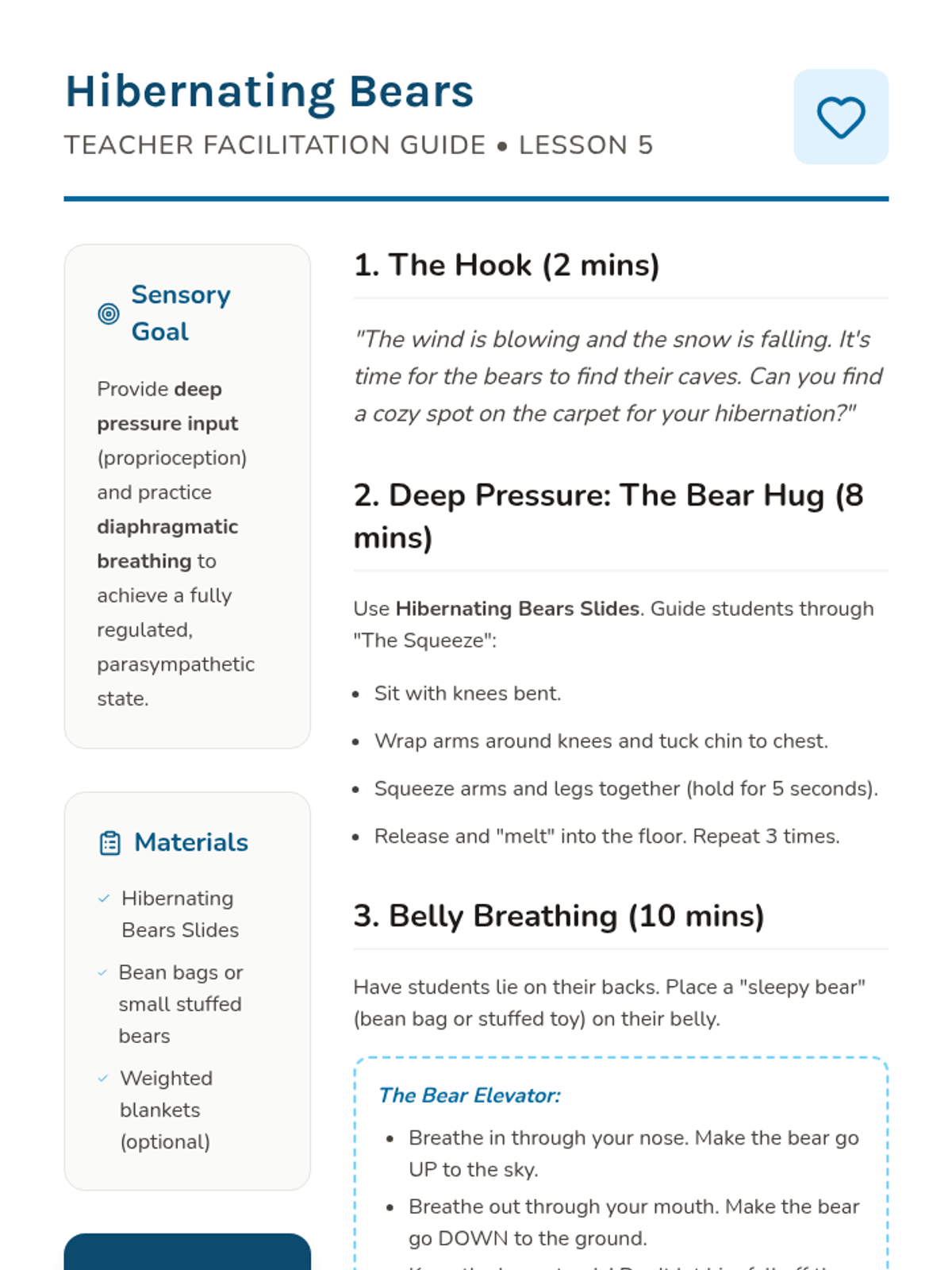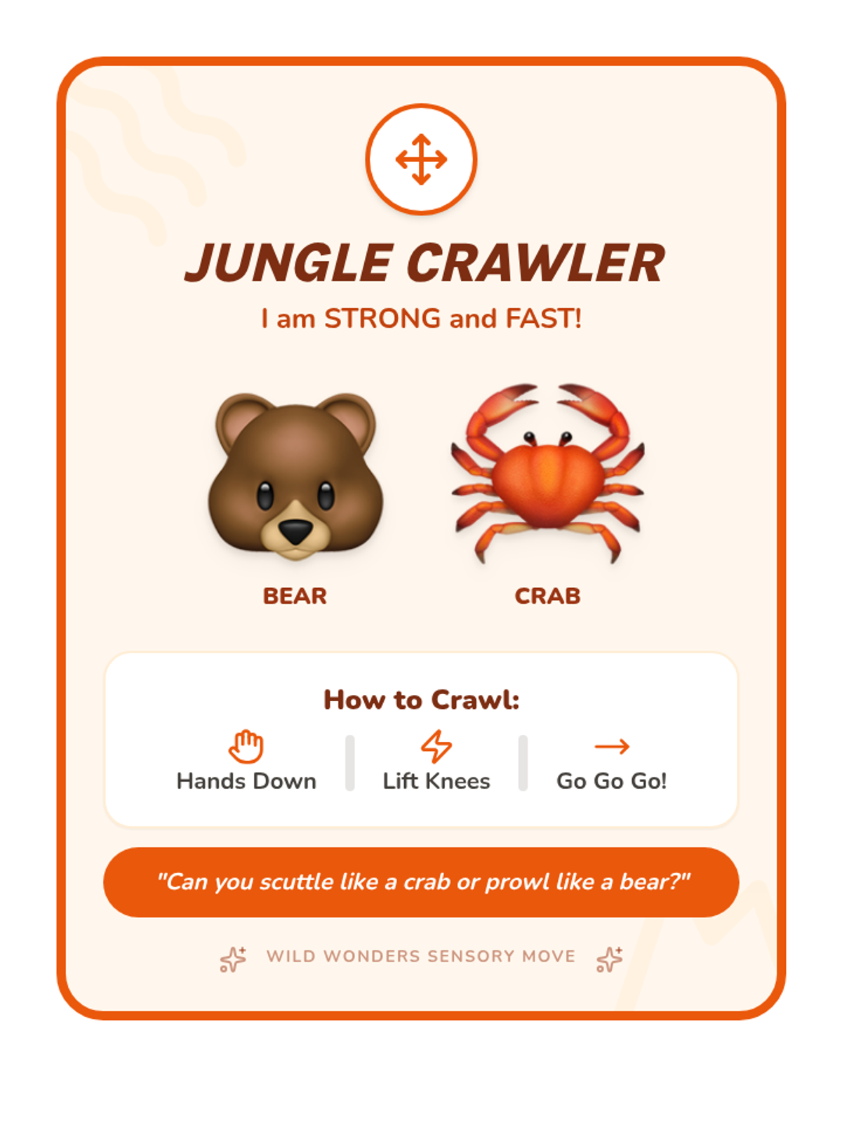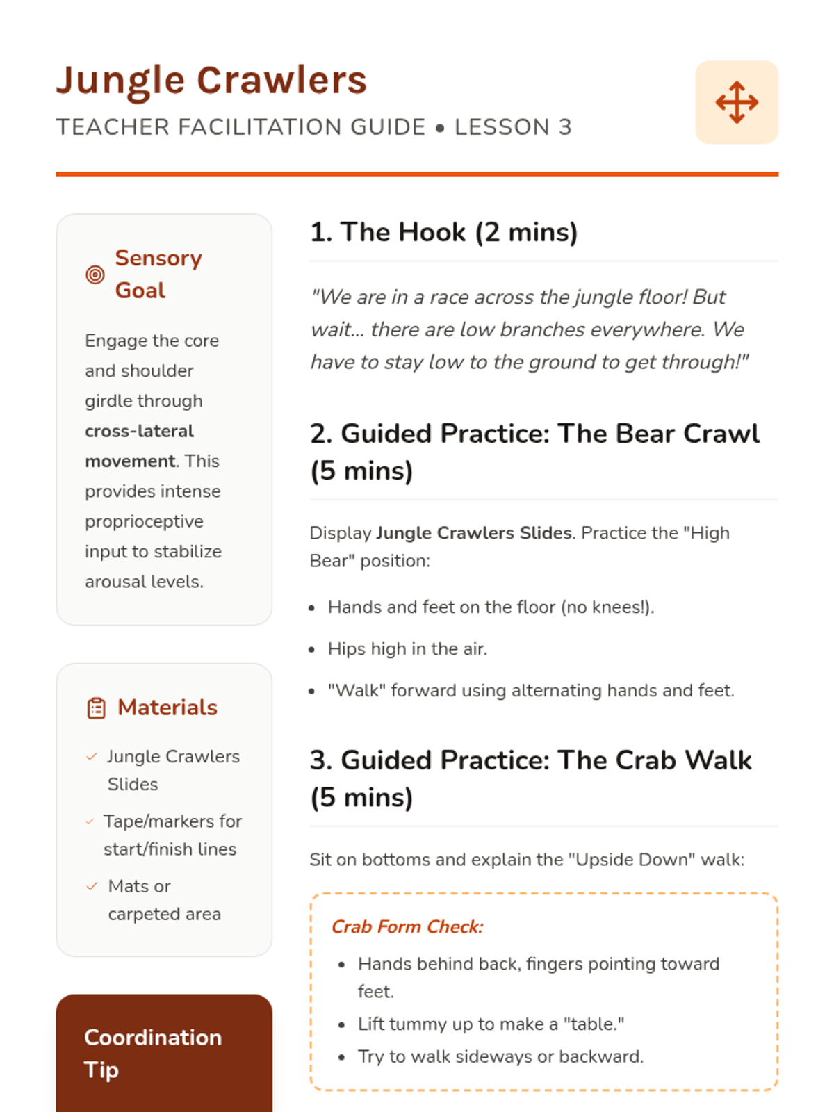A sensory regulation sequence for Pre-K students using animal-themed movements to provide proprioceptive, vestibular, and deep pressure input. Students learn to identify and use specific 'animal moves' to help their bodies stay calm, focused, and ready to learn.