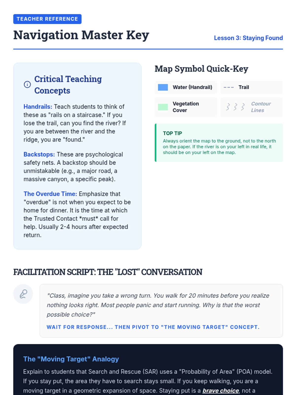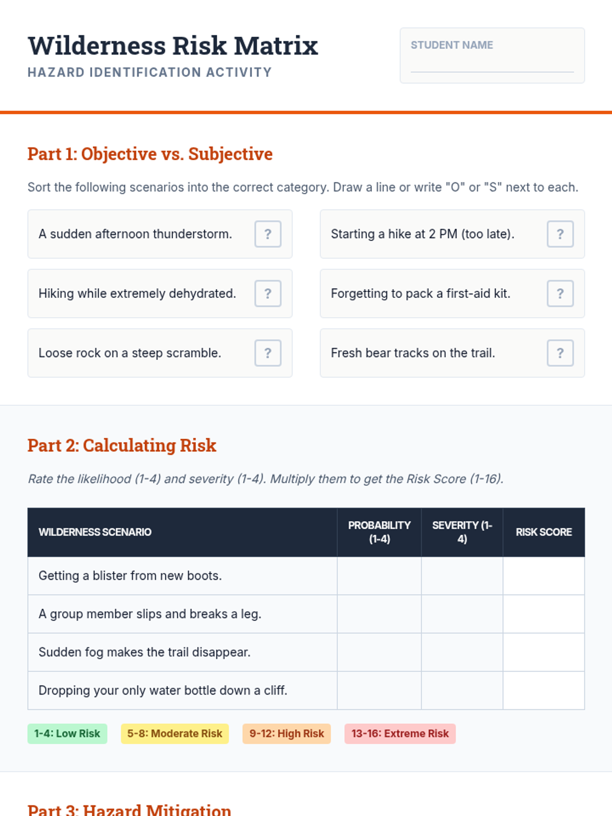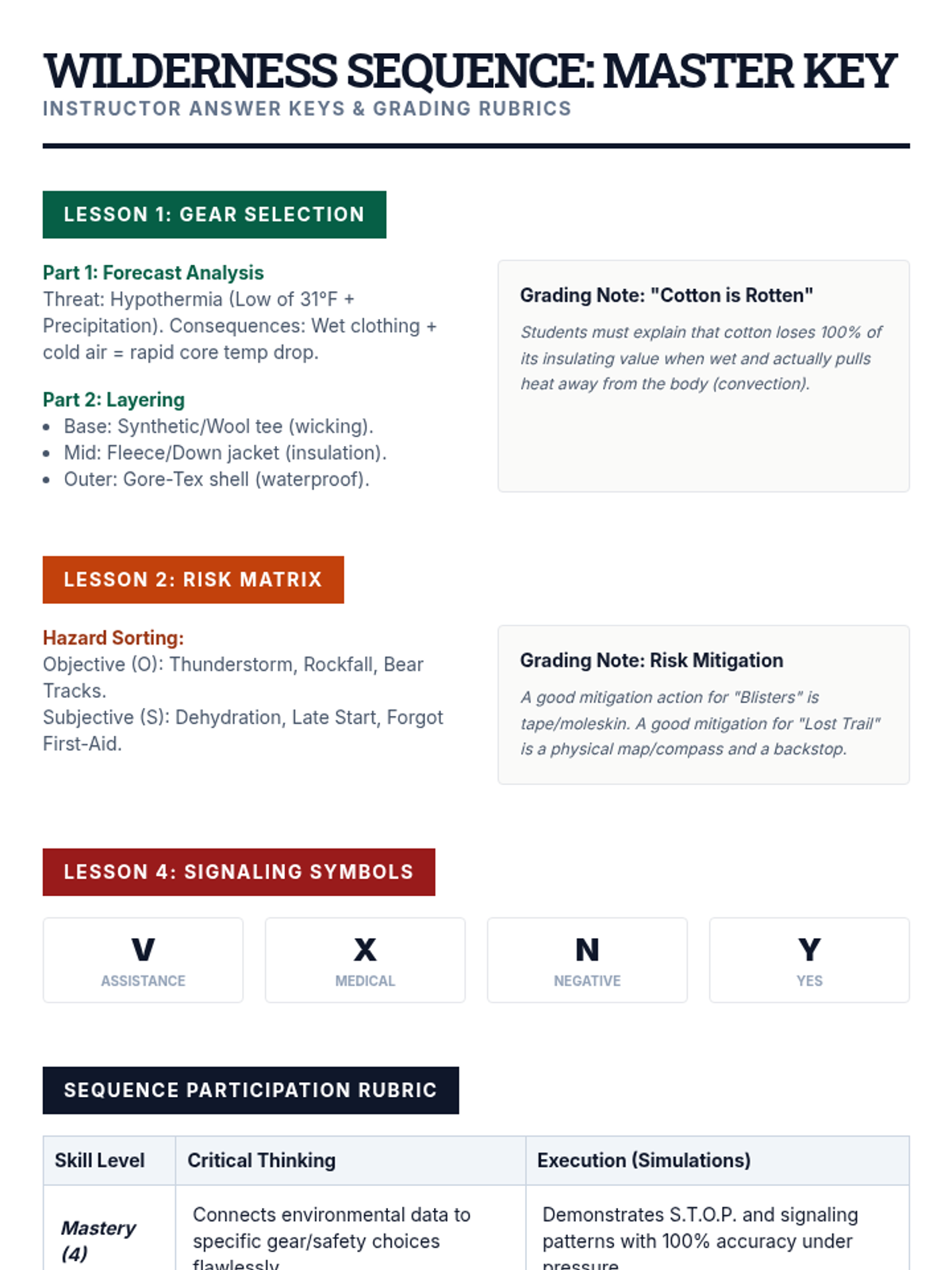 A comprehensive 7th-grade unit on wilderness risk management, covering gear selection, hazard identification, navigation safety, emergency signaling, and survival psychology. Students move from pre-trip planning to active emergency response simulations.