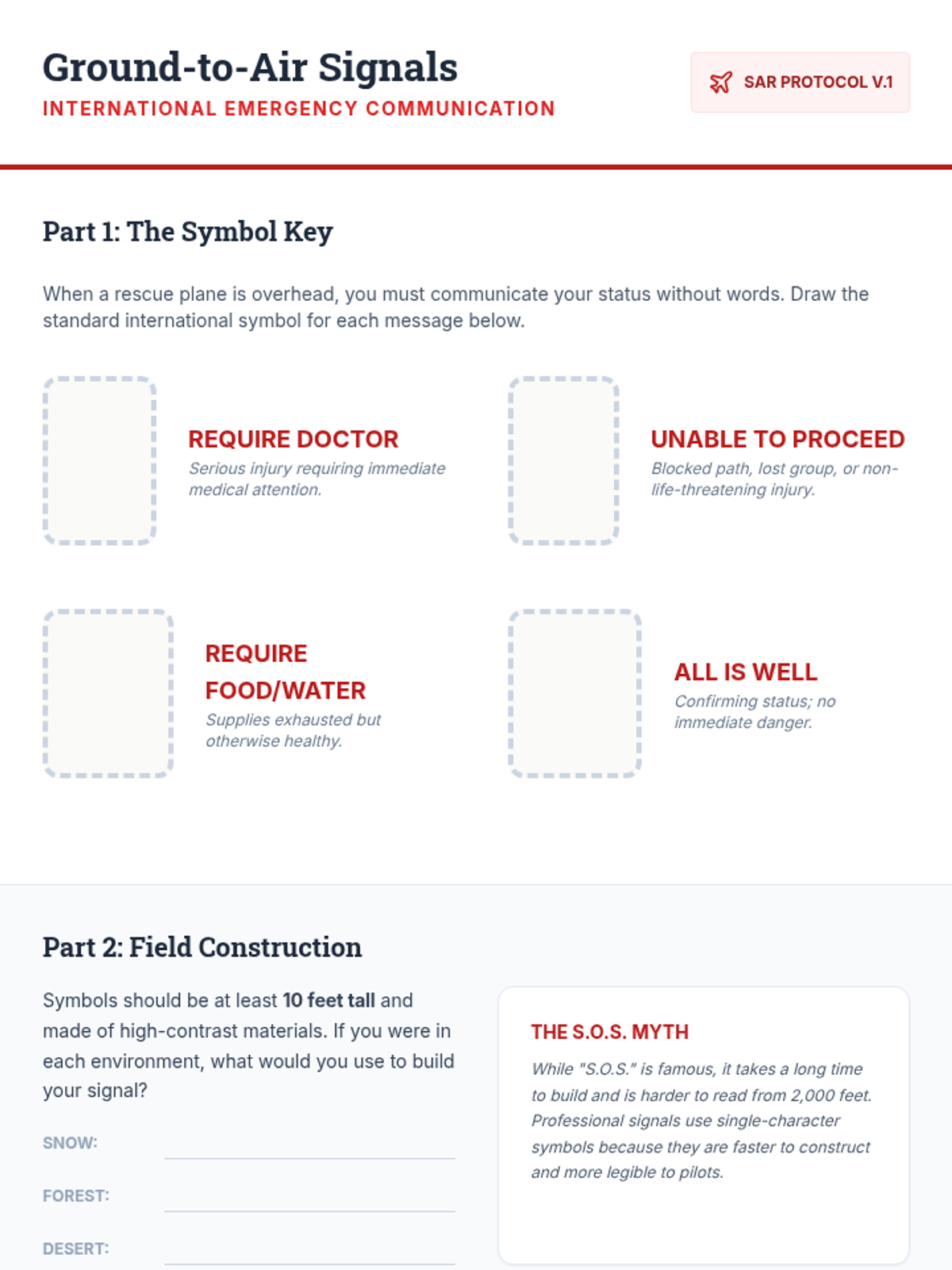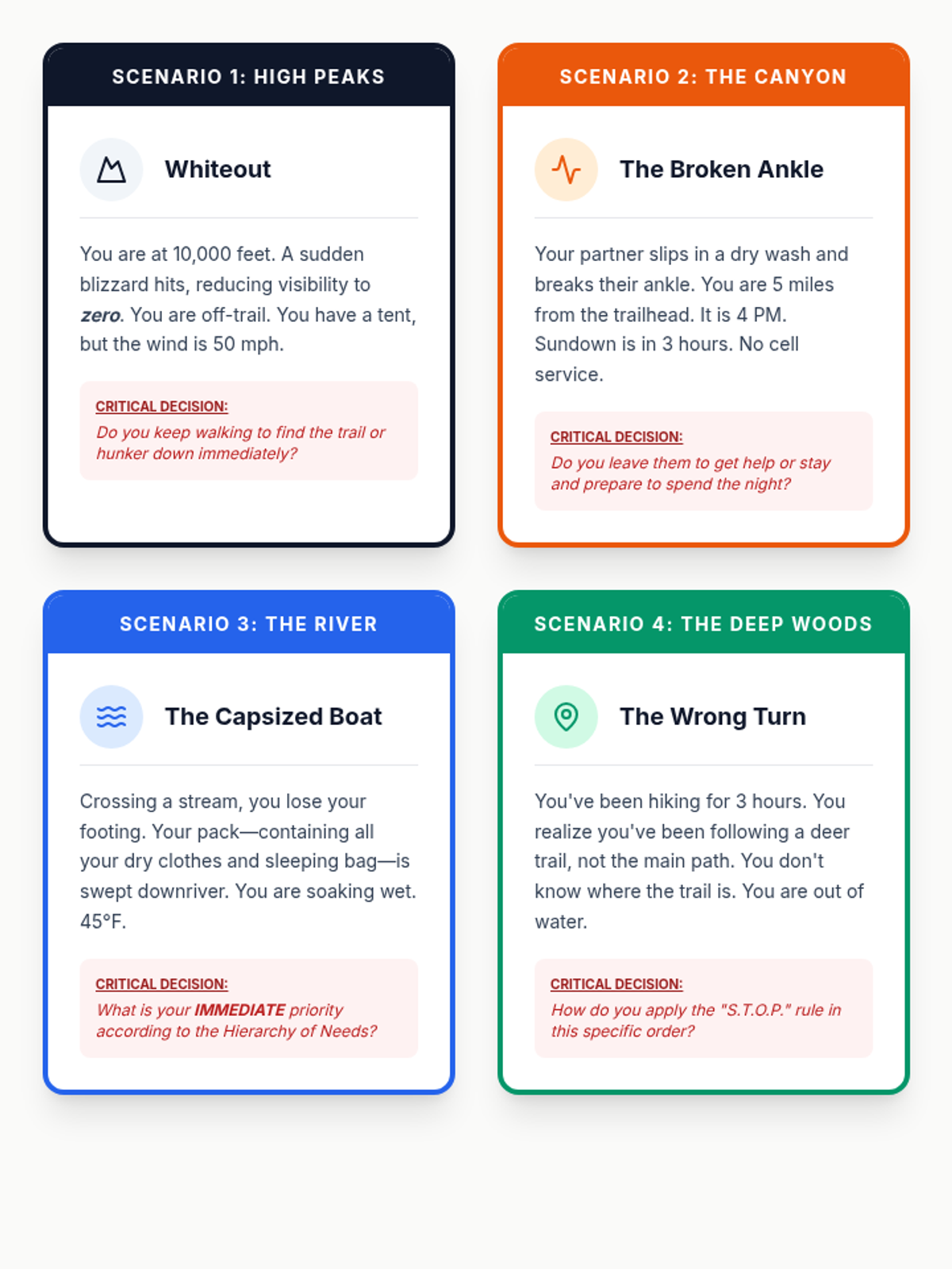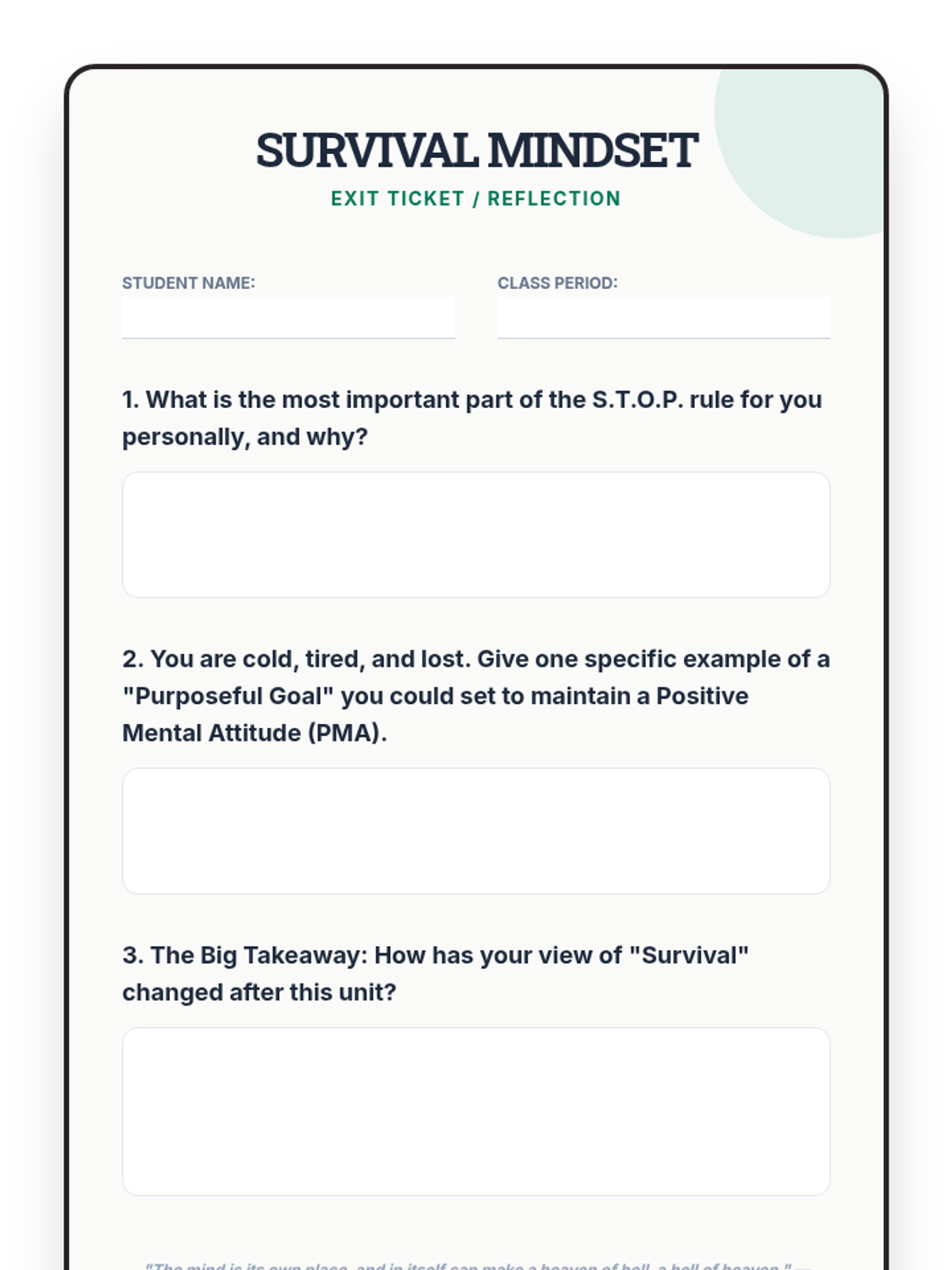 A comprehensive 7th-grade unit on wilderness risk management, covering gear selection, hazard identification, navigation safety, emergency signaling, and survival psychology. Students move from pre-trip planning to active emergency response simulations.