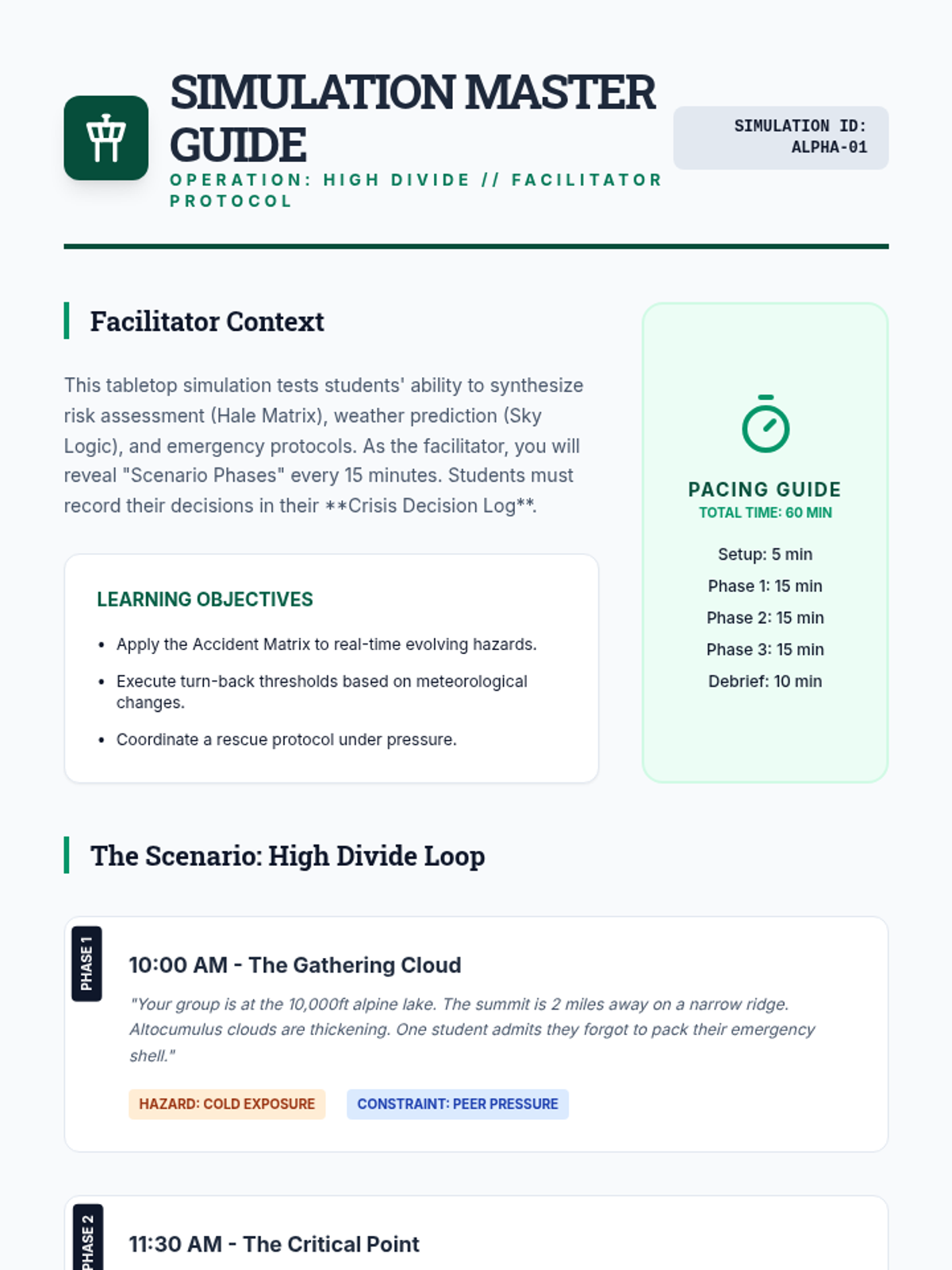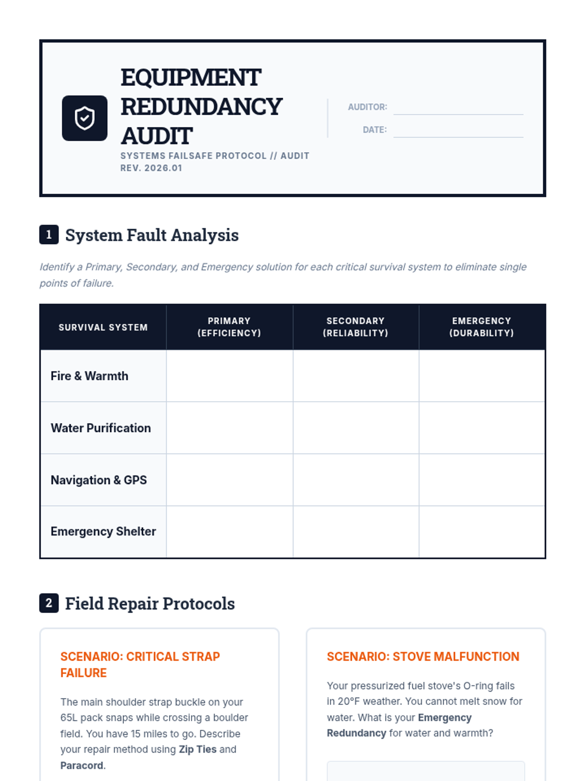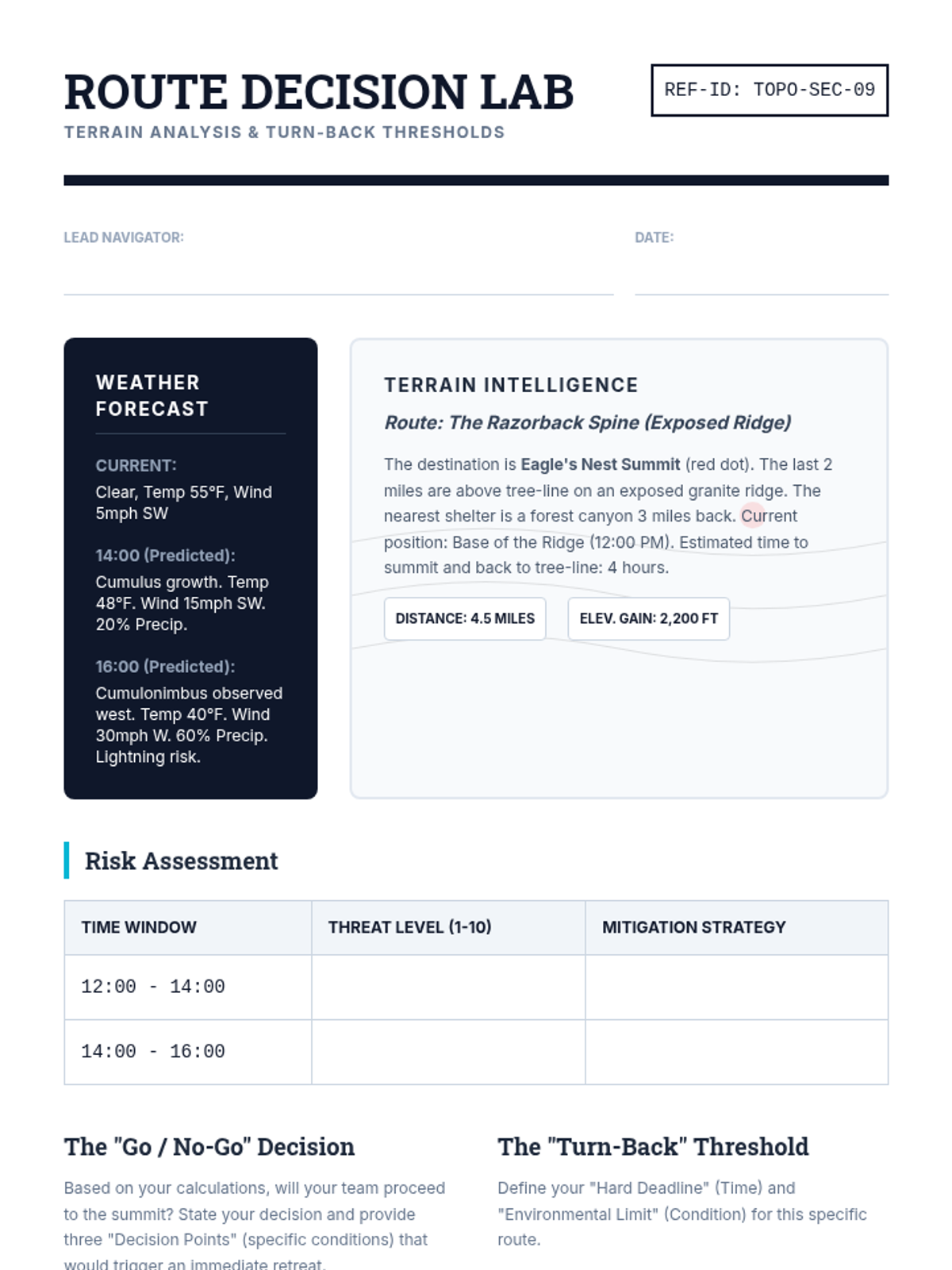A comprehensive 12th-grade sequence focused on wilderness risk management, meteorology, gear redundancy, emergency signaling, and crisis decision-making in outdoor environments.