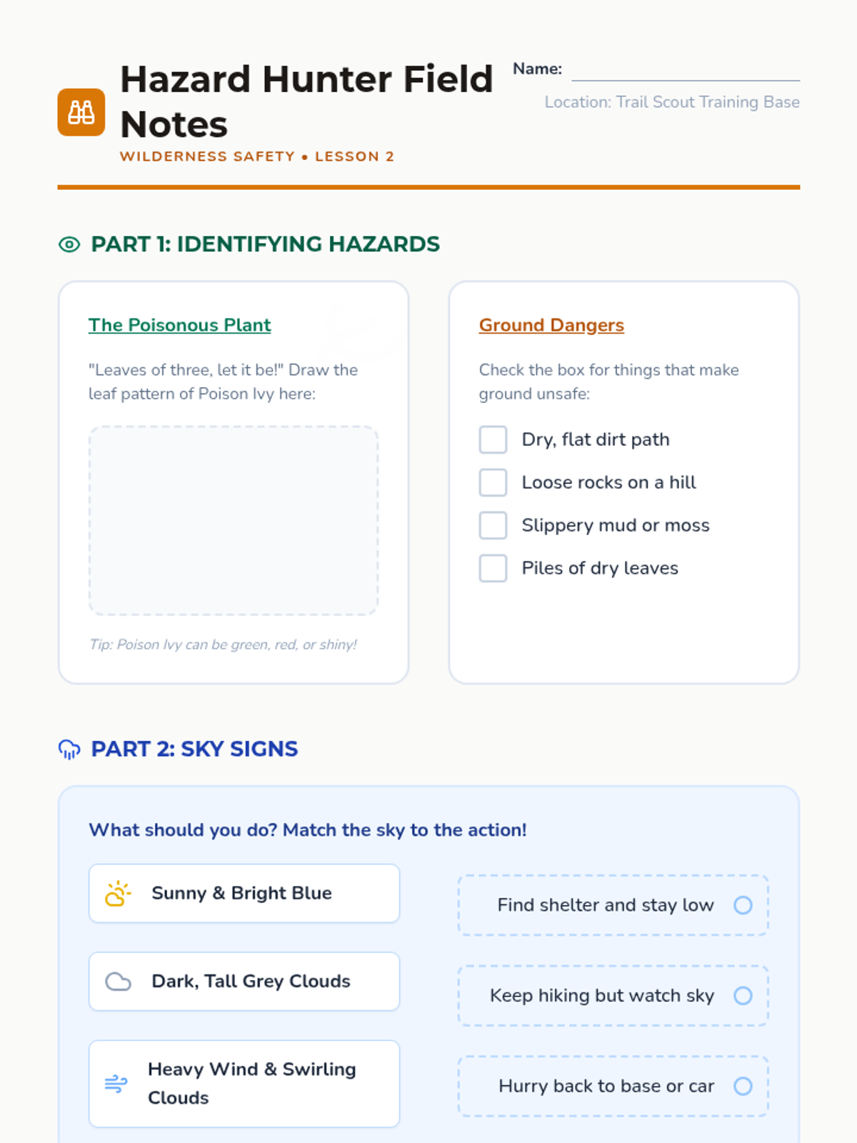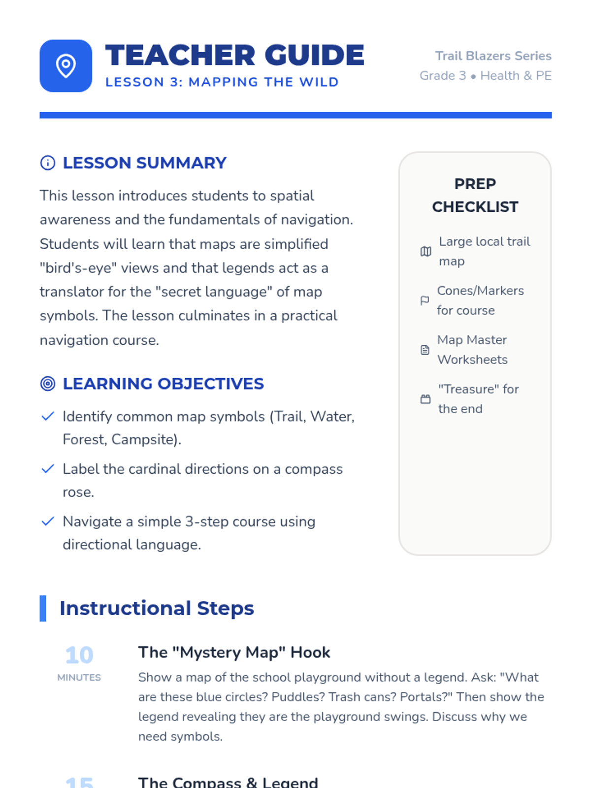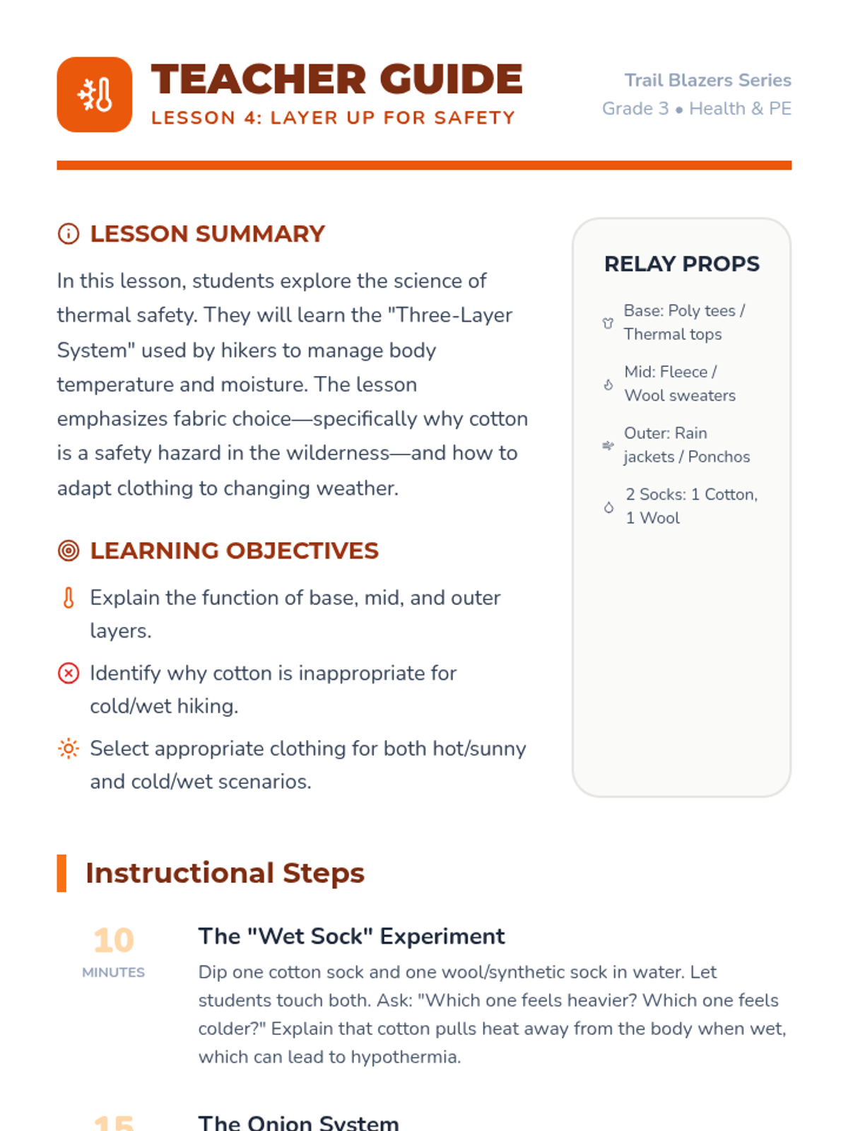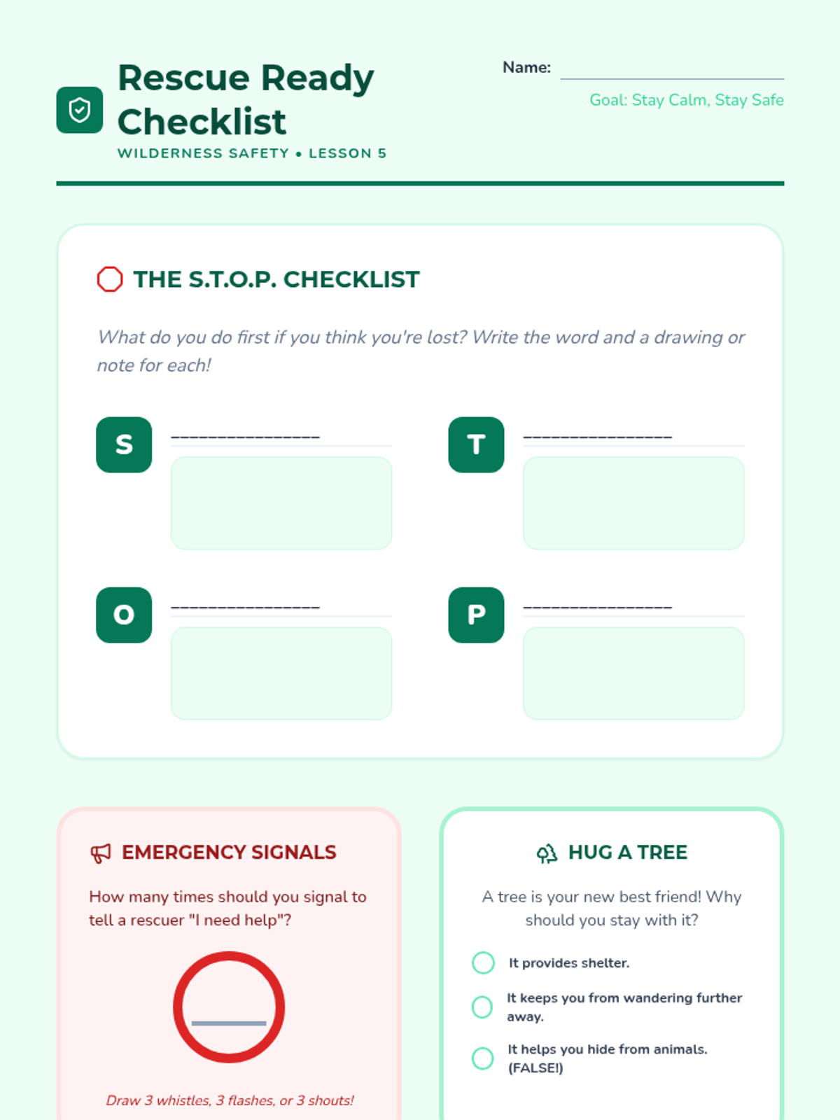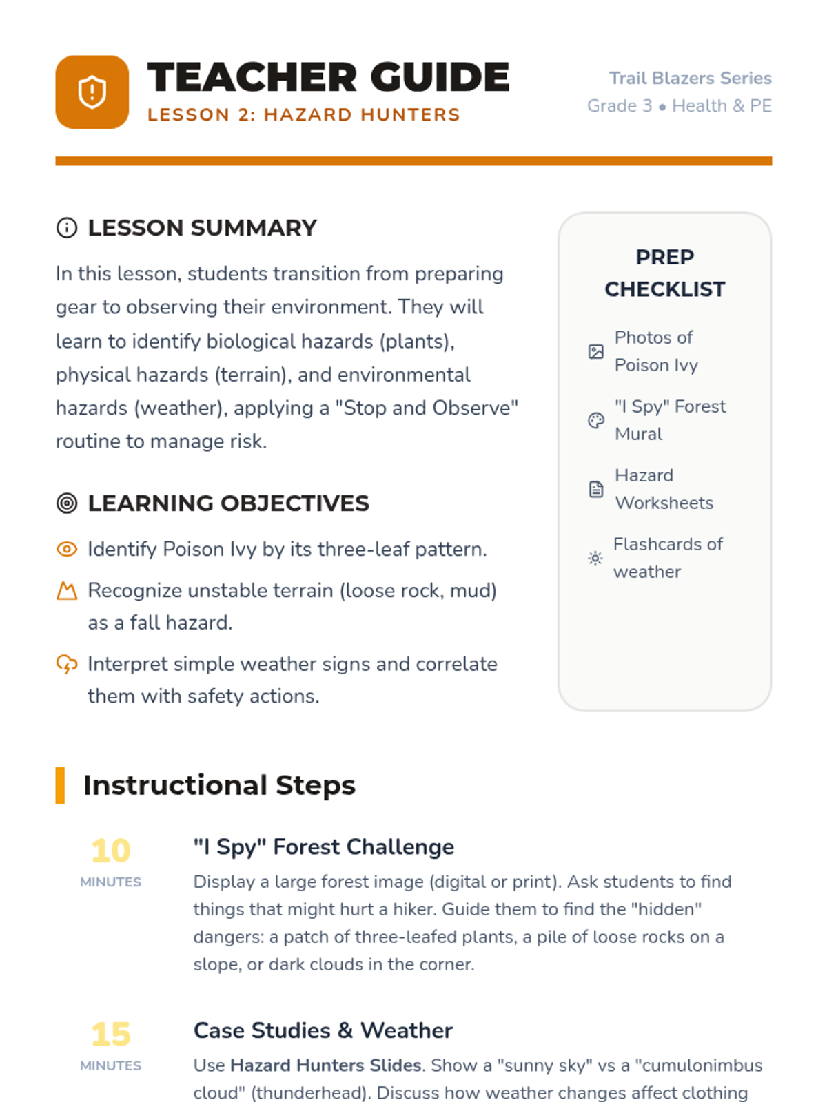 This 5-lesson unit introduces 3rd-grade students to the essentials of outdoor safety. Students will learn how to pack effectively, identify environmental hazards, read basic trail maps, dress for varying weather conditions, and follow emergency protocols if lost in the wilderness.