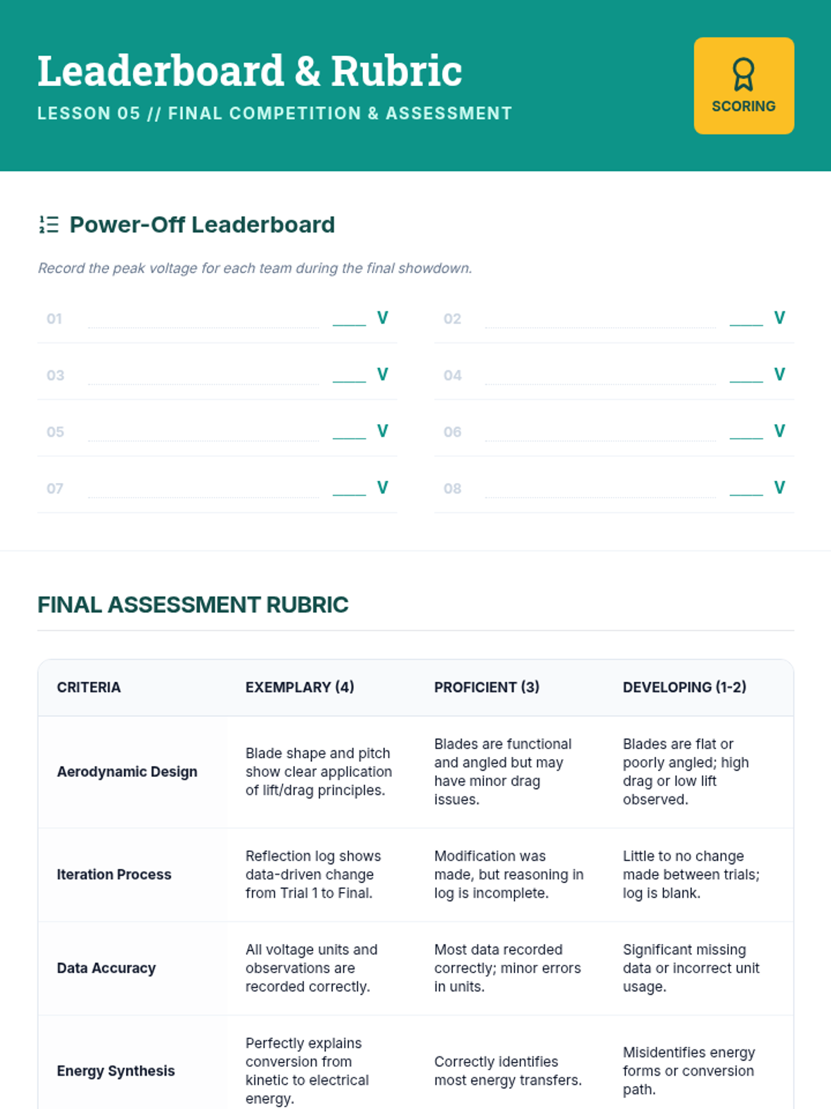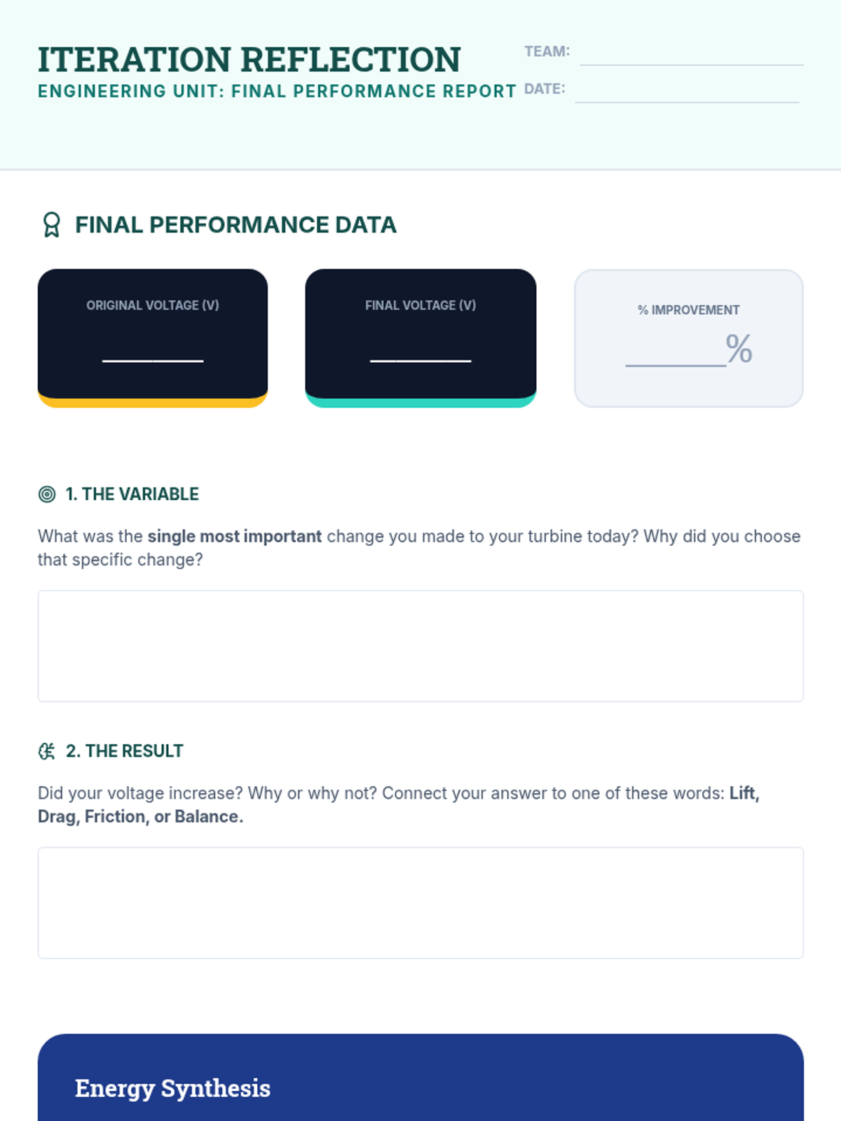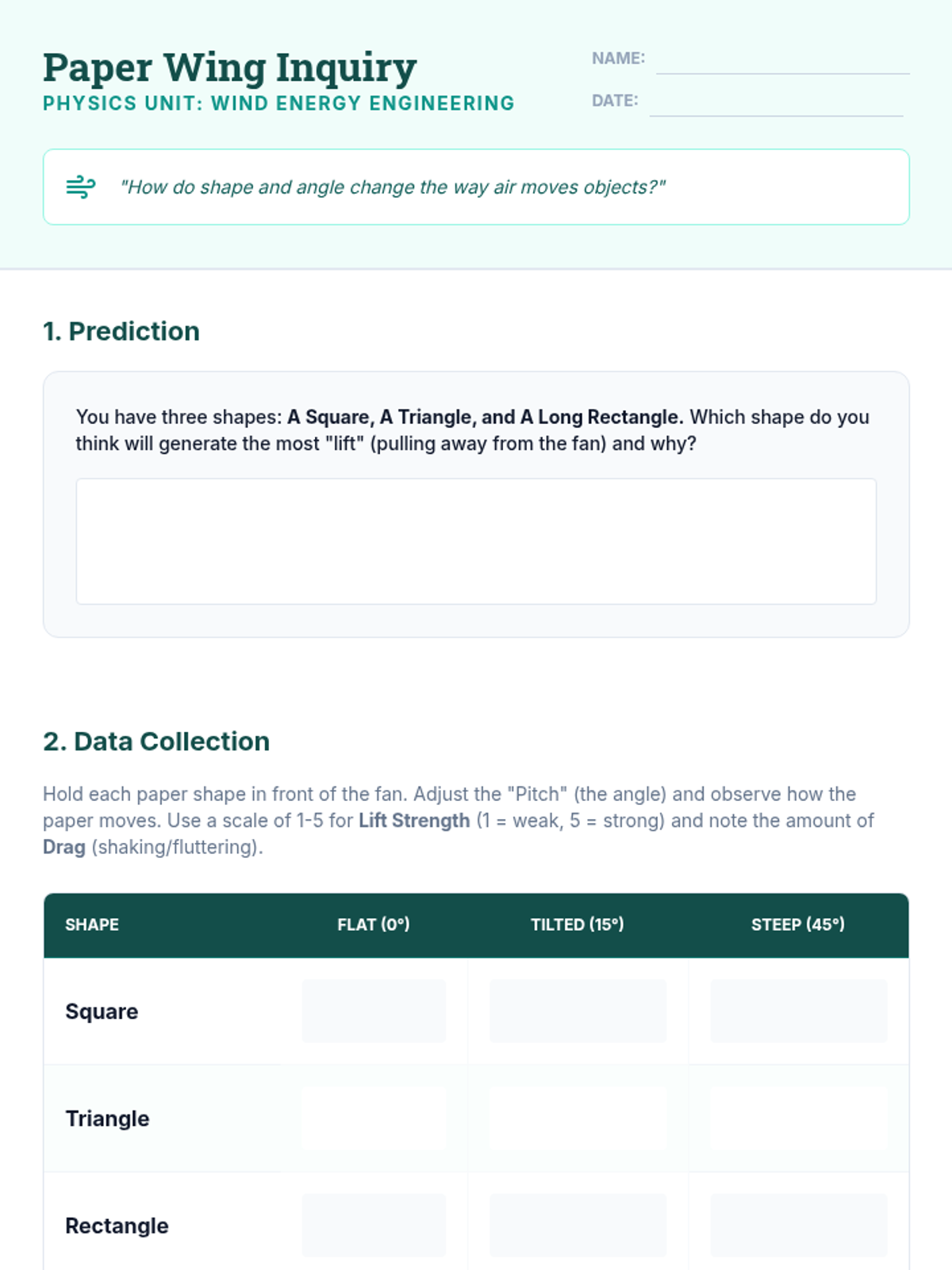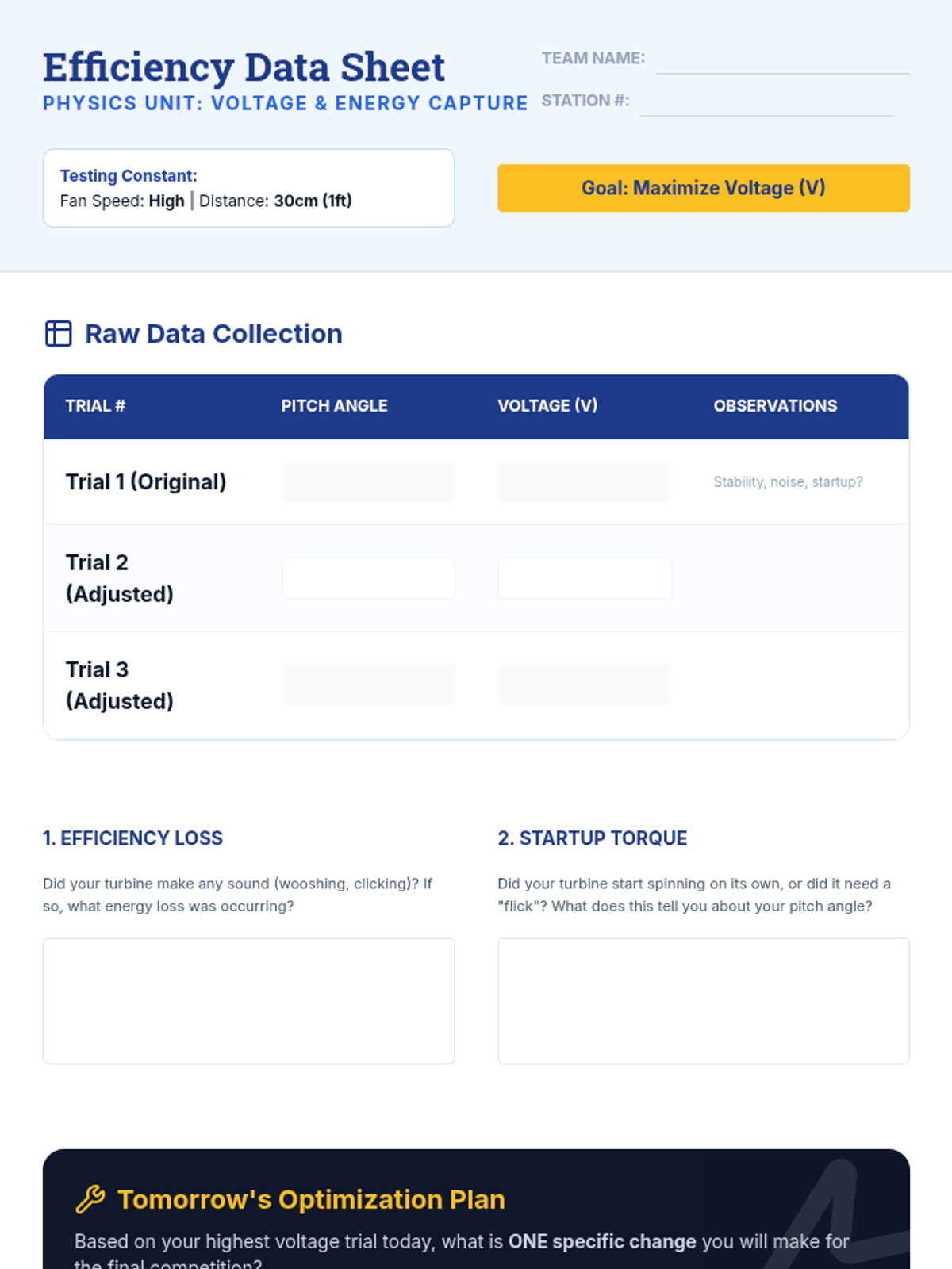 A hands-on physics and engineering unit where 6th-grade students explore the relationship between work, power, and aerodynamics by designing, building, and optimizing wind turbine blades. Students move from calculating their own power output to measuring the electrical efficiency of their engineered prototypes.