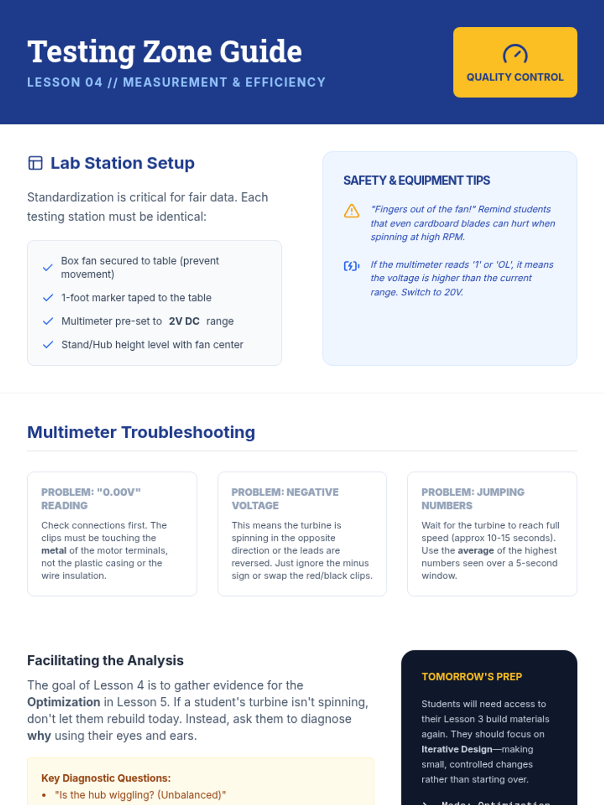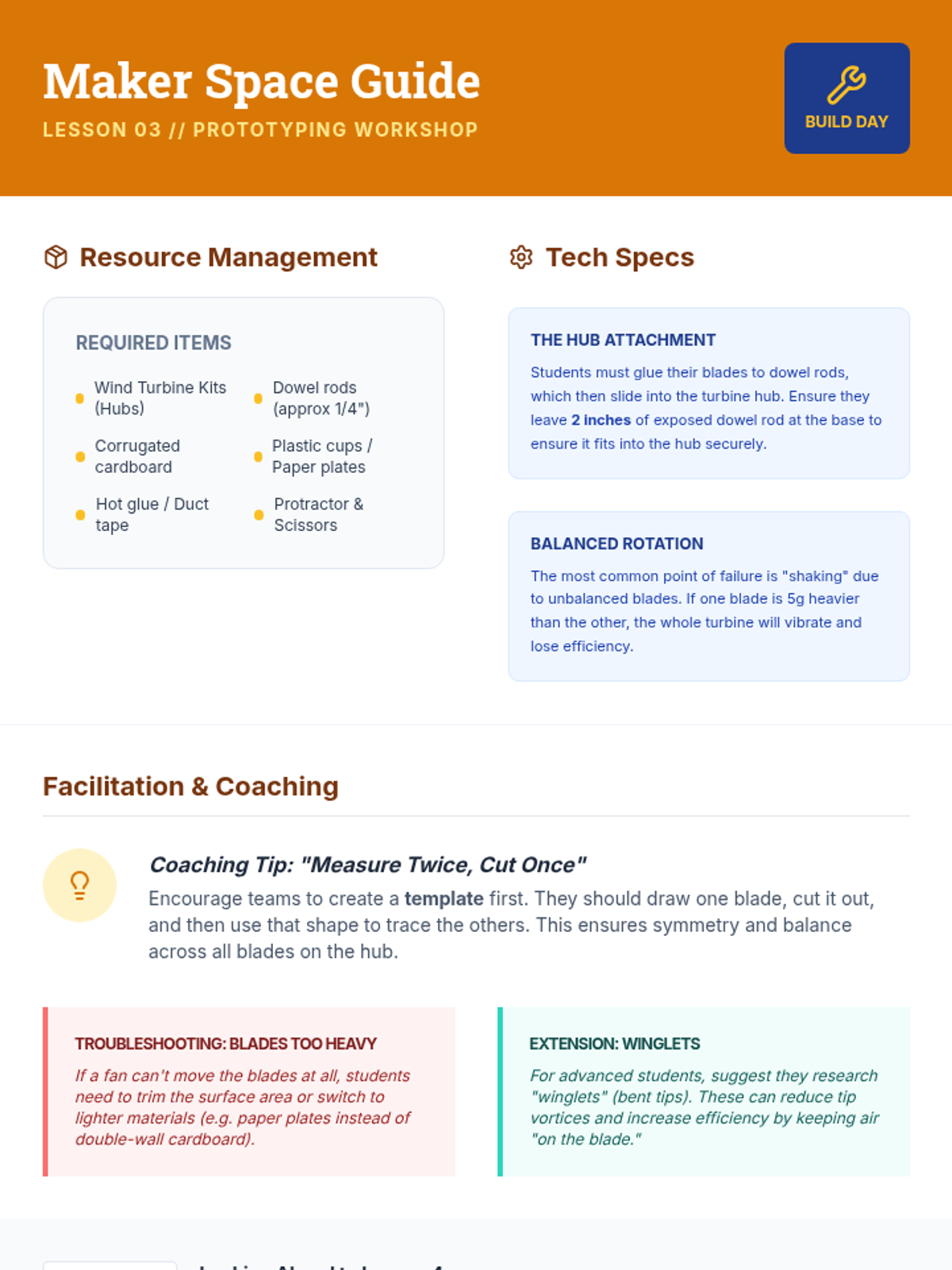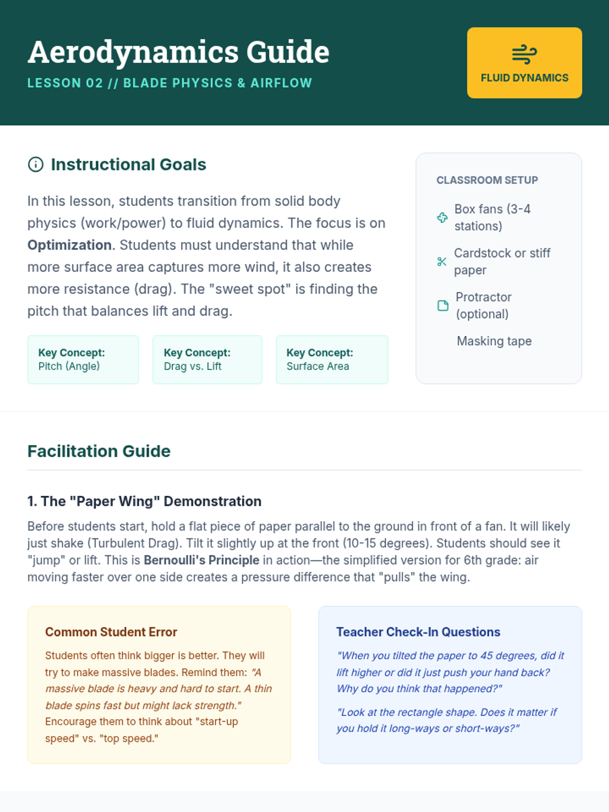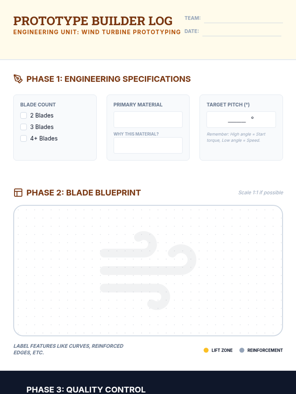 A hands-on physics and engineering unit where 6th-grade students explore the relationship between work, power, and aerodynamics by designing, building, and optimizing wind turbine blades. Students move from calculating their own power output to measuring the electrical efficiency of their engineered prototypes.