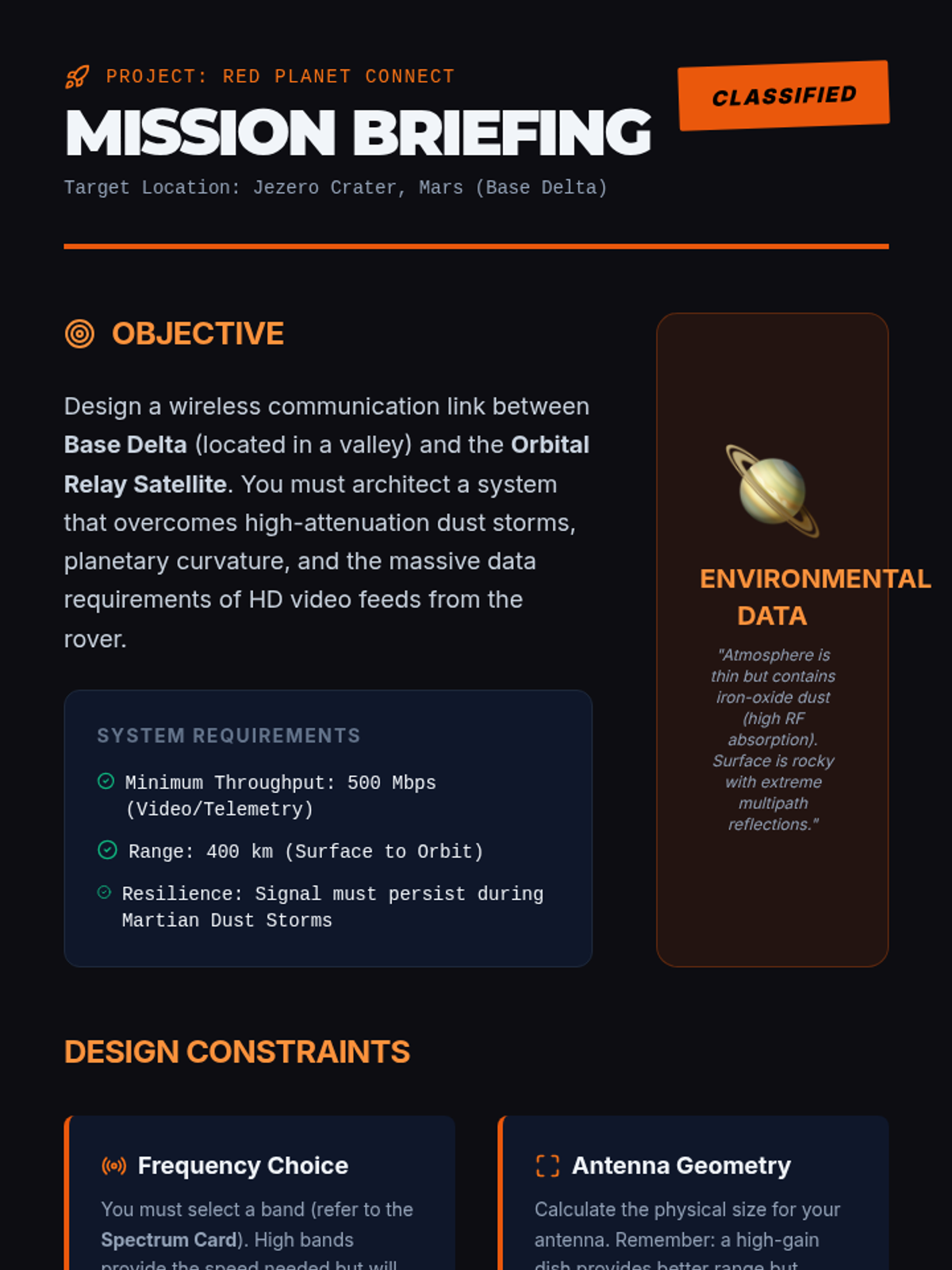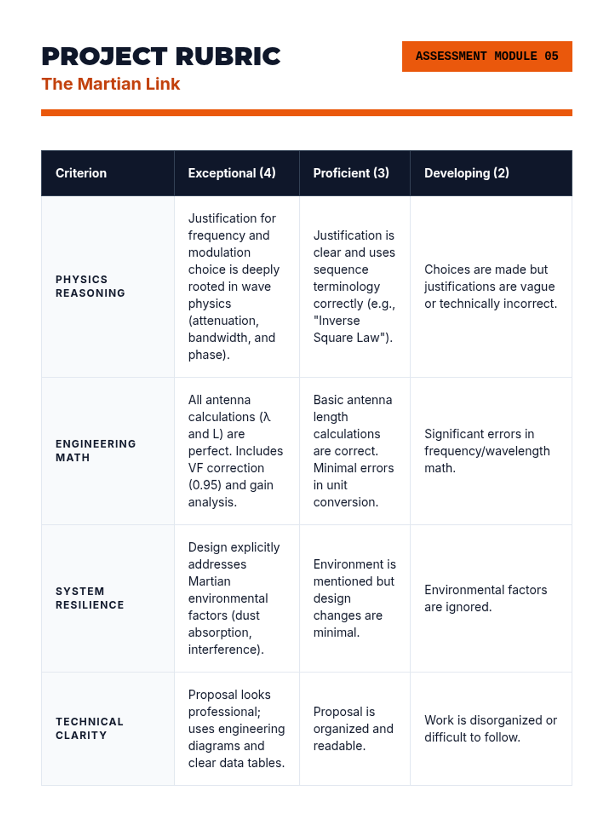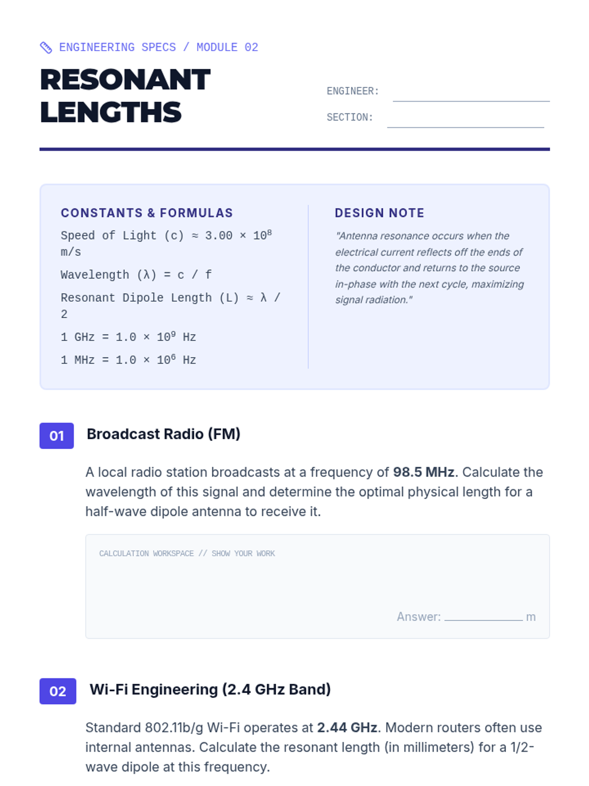 This 12th-grade engineering sequence explores the physics of electromagnetic waves through the lens of wireless communication. Students learn how information is modulated onto carrier waves, how antenna geometry relates to wavelength, and how environmental factors like attenuation and interference affect signal integrity. The unit concludes with a design challenge requiring students to architect a communication link for a remote environment.