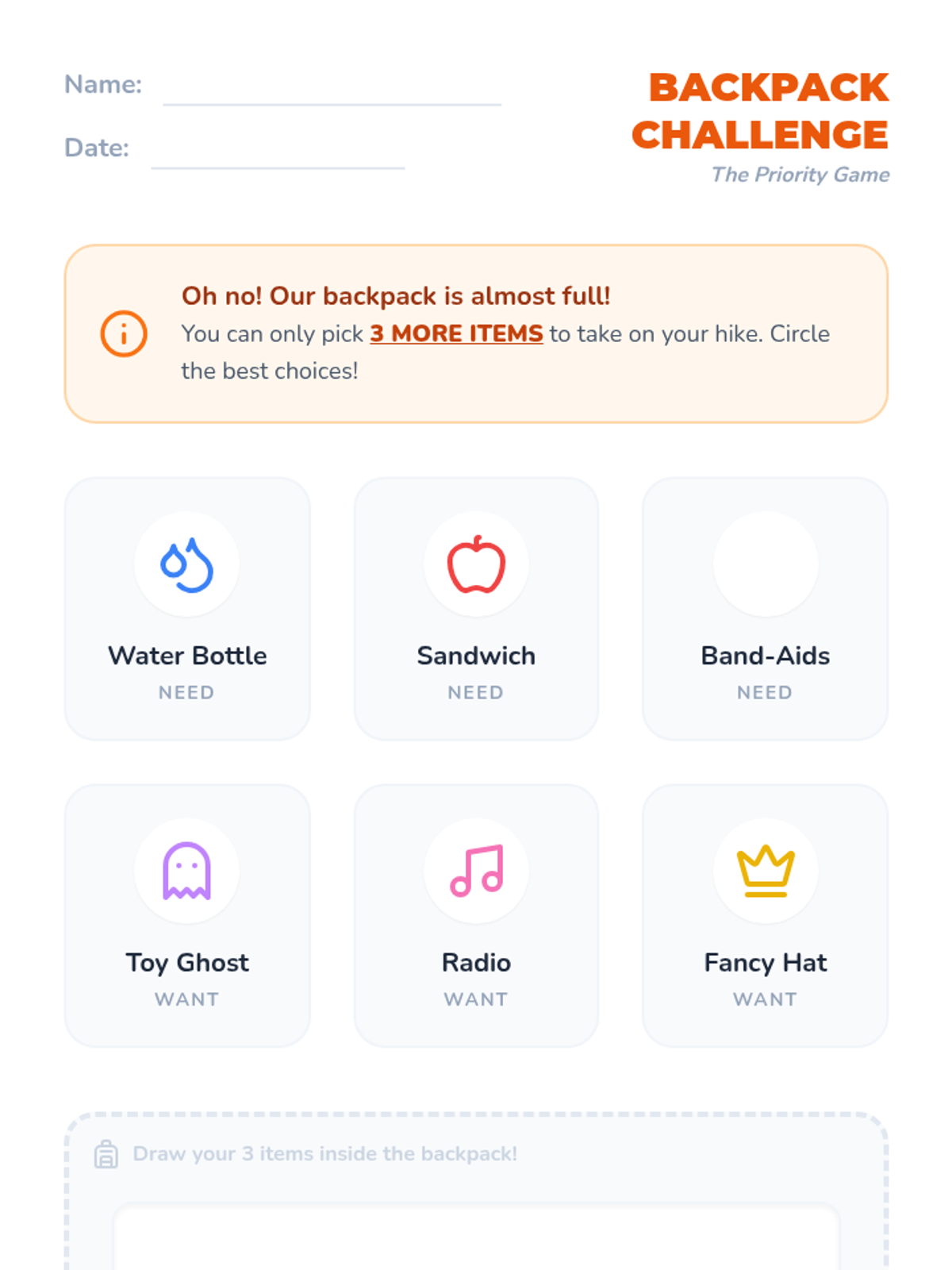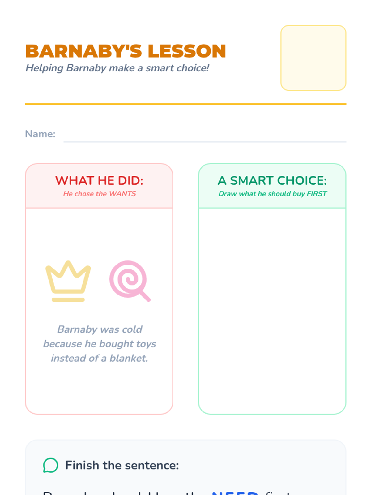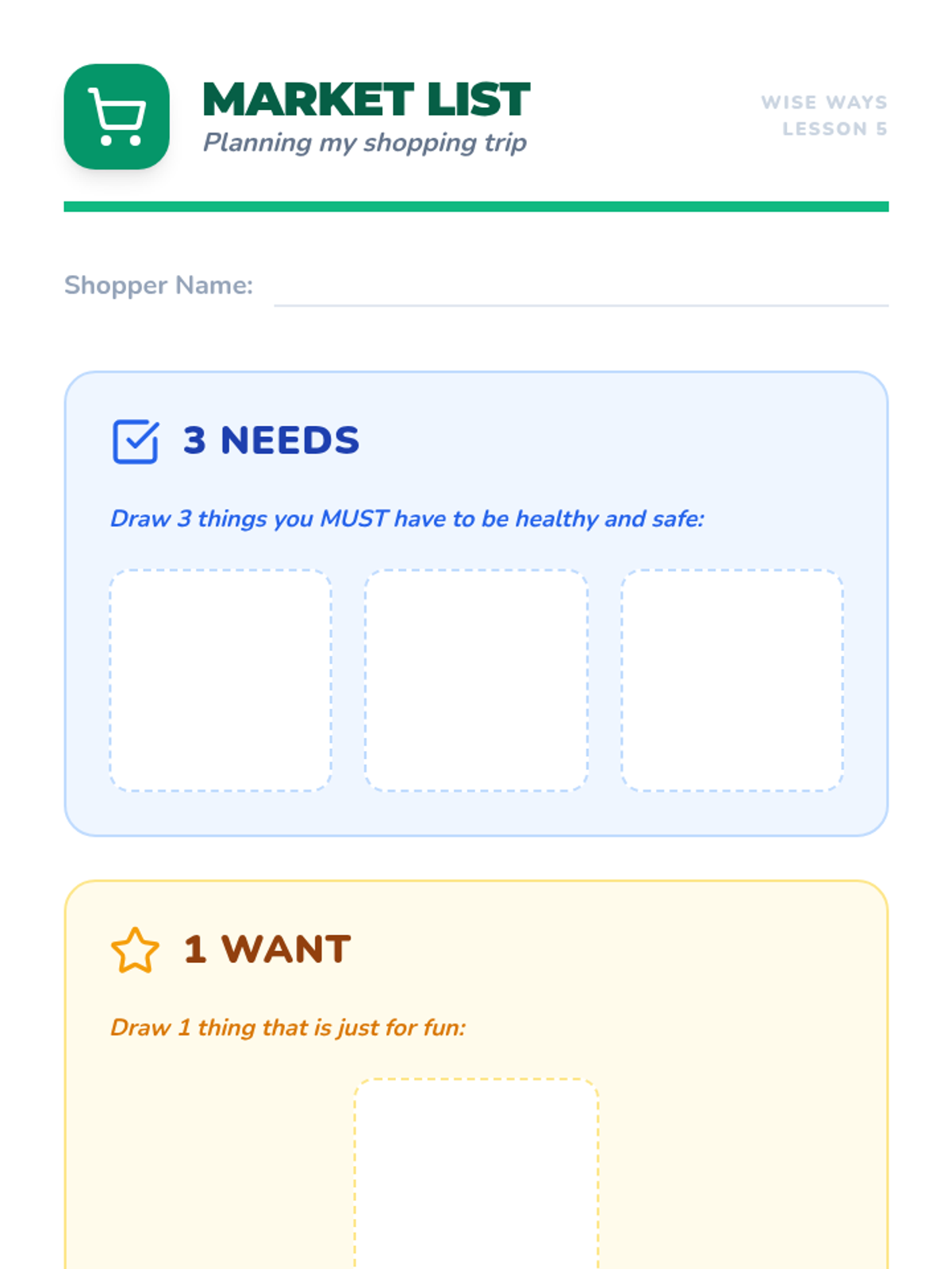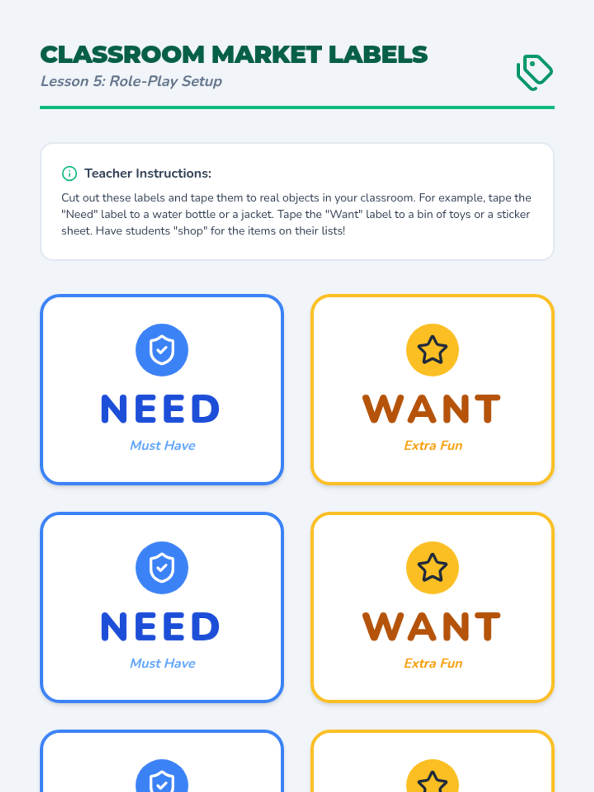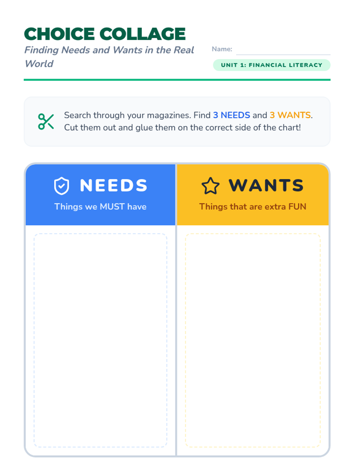 A foundational financial literacy sequence for Kindergarten students focusing on distinguishing between essential needs and discretionary wants through games, stories, and creative projects.