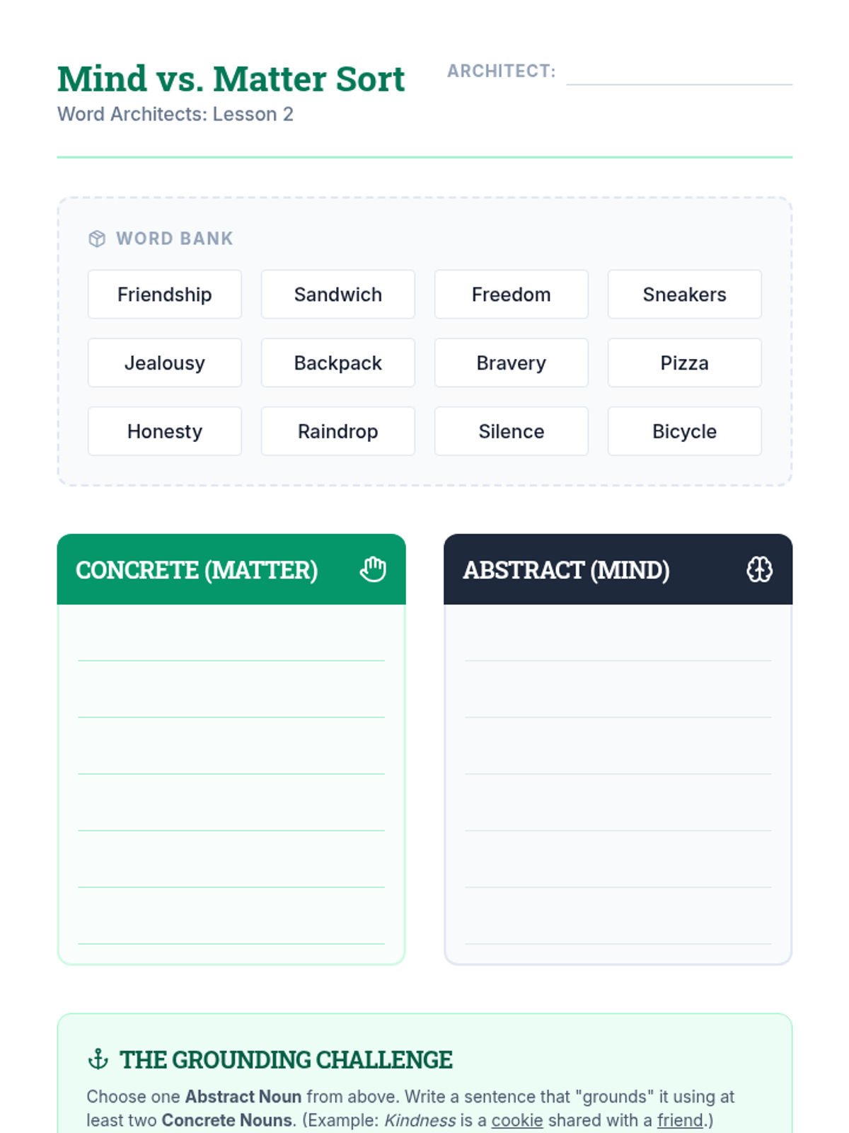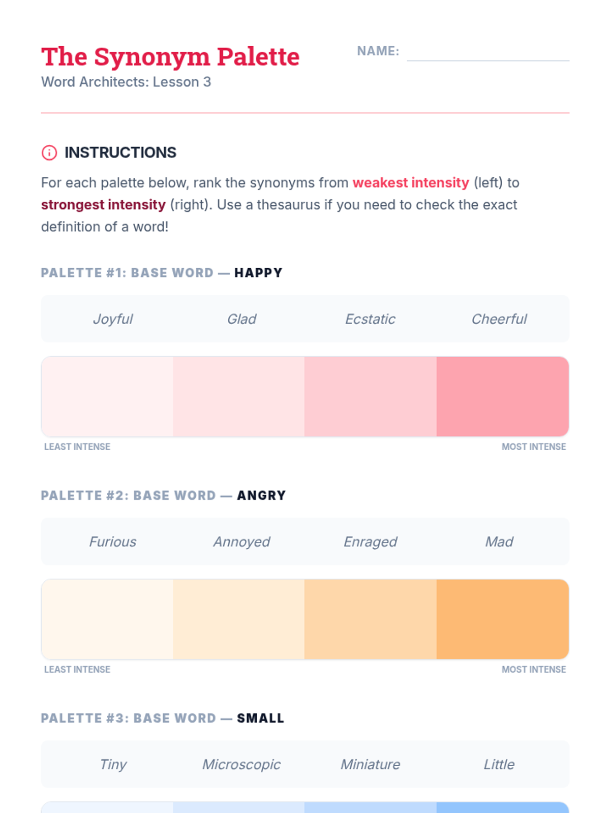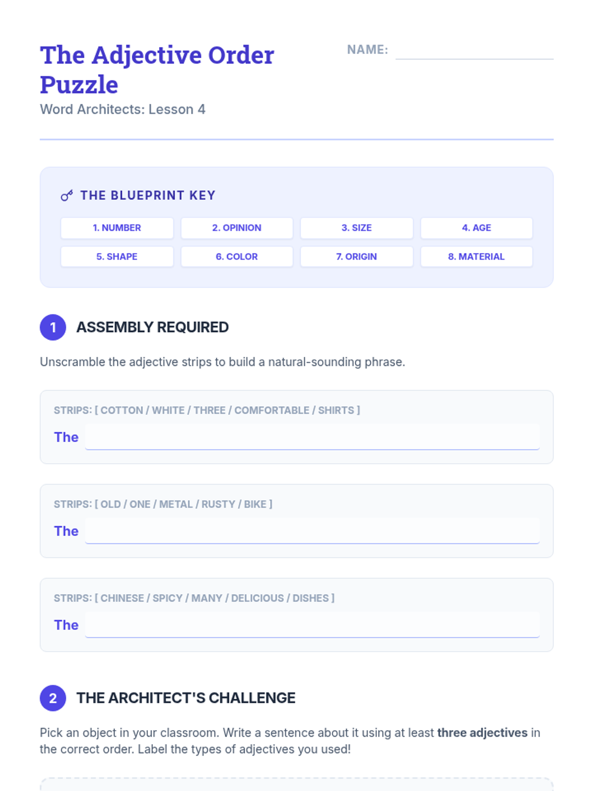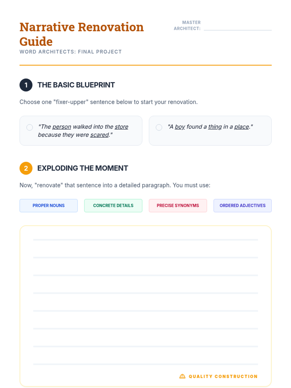 A 4th-grade ELA sequence focused on using precise nouns and adjectives to enhance descriptive writing. Students move from basic identification to the strategic application of vocabulary, covering common vs. proper nouns, concrete vs. abstract nouns, shades of meaning, and standard adjective order.