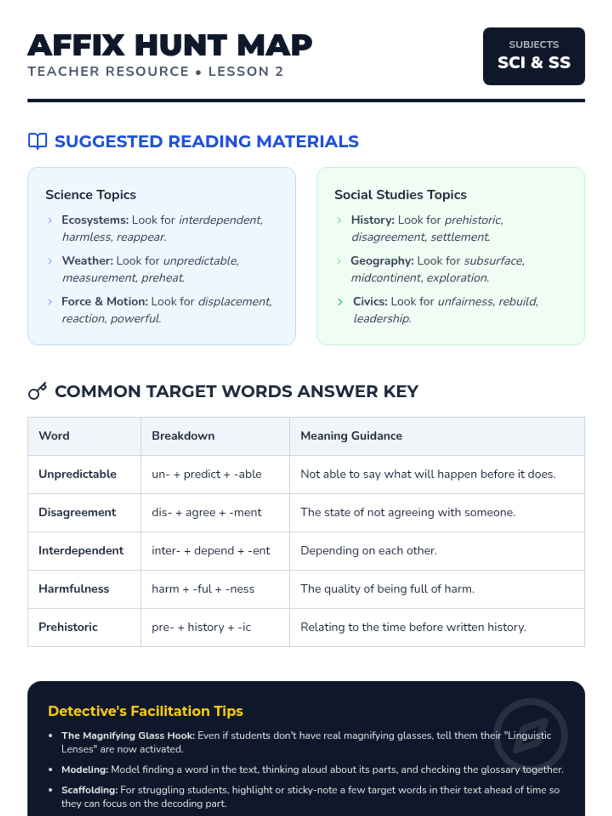 A 4-day small group intervention focused on using context clues (definition, example, synonym, and antonym) supported by visual illustrations to determine the meaning of unknown words. Students act as 'Word Detectives' to solve vocabulary mysteries.