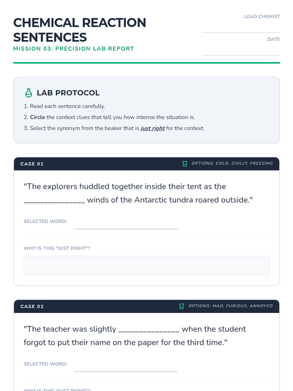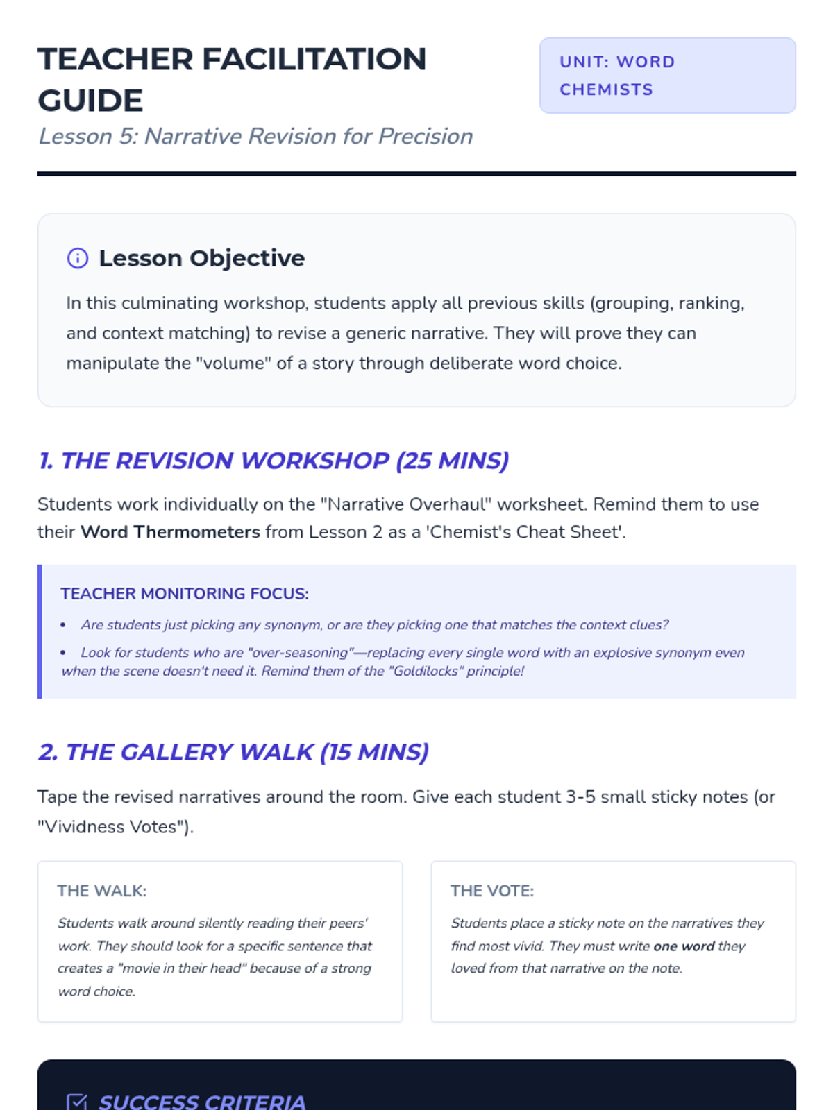 Students investigate the hierarchy of synonyms based on their strength and intensity, creating 'vocabulary thermometers' and revising narratives for precision.