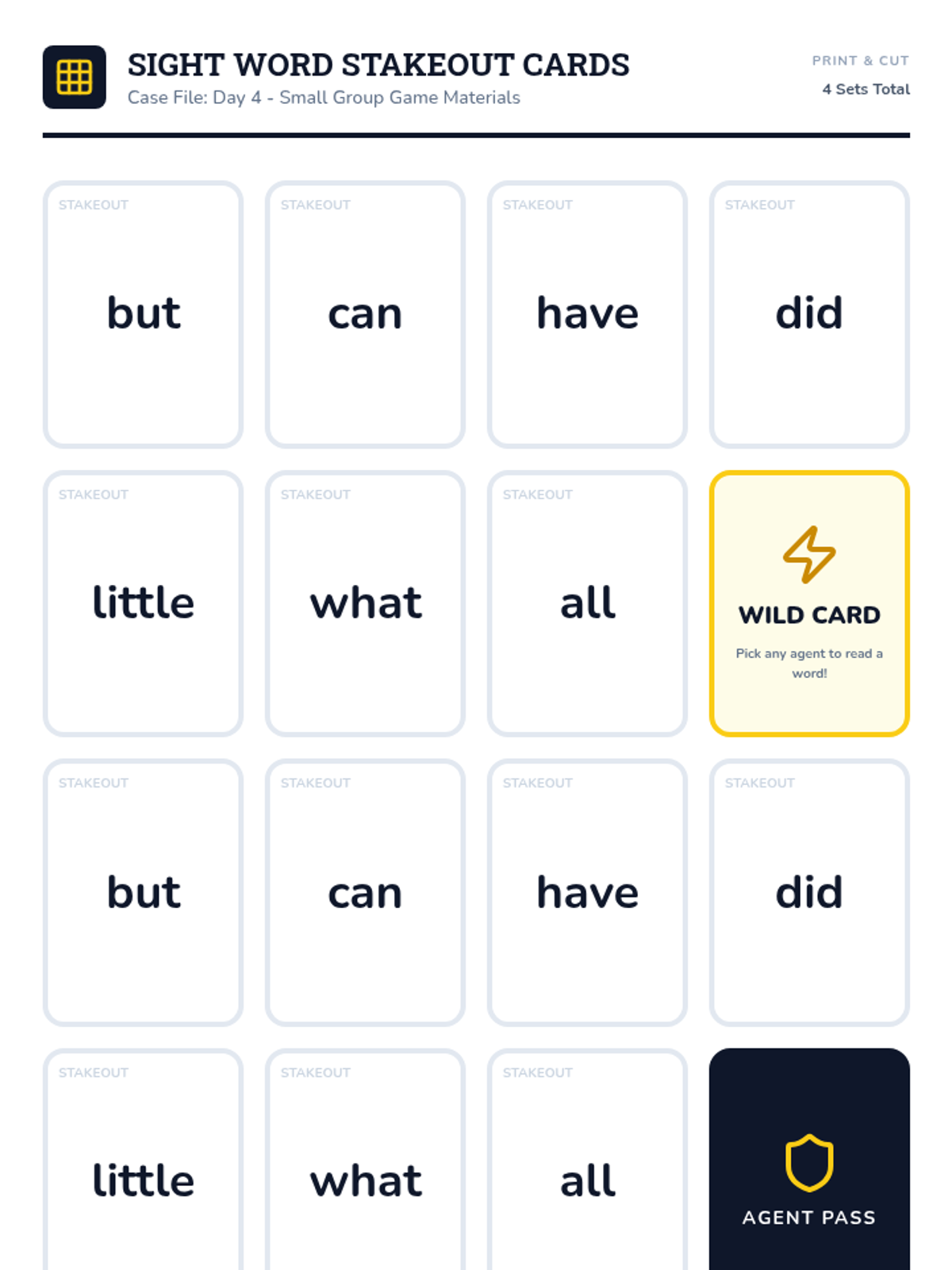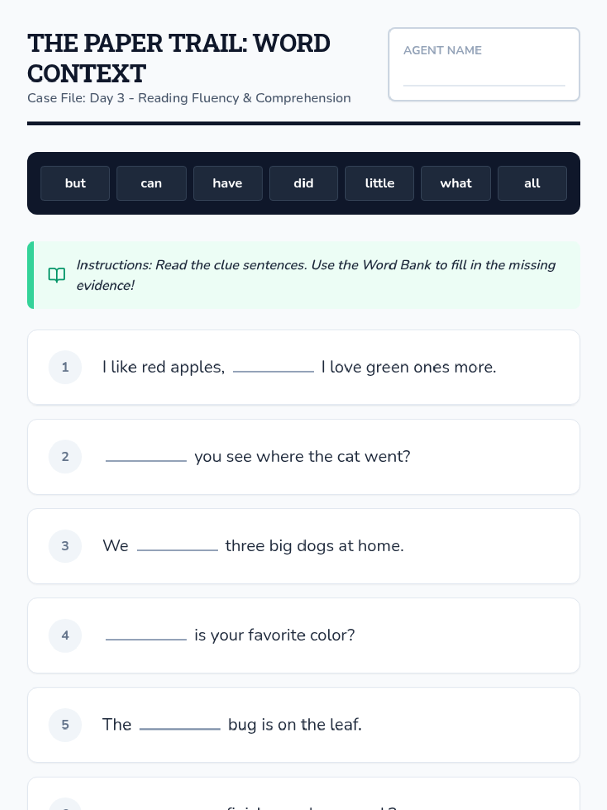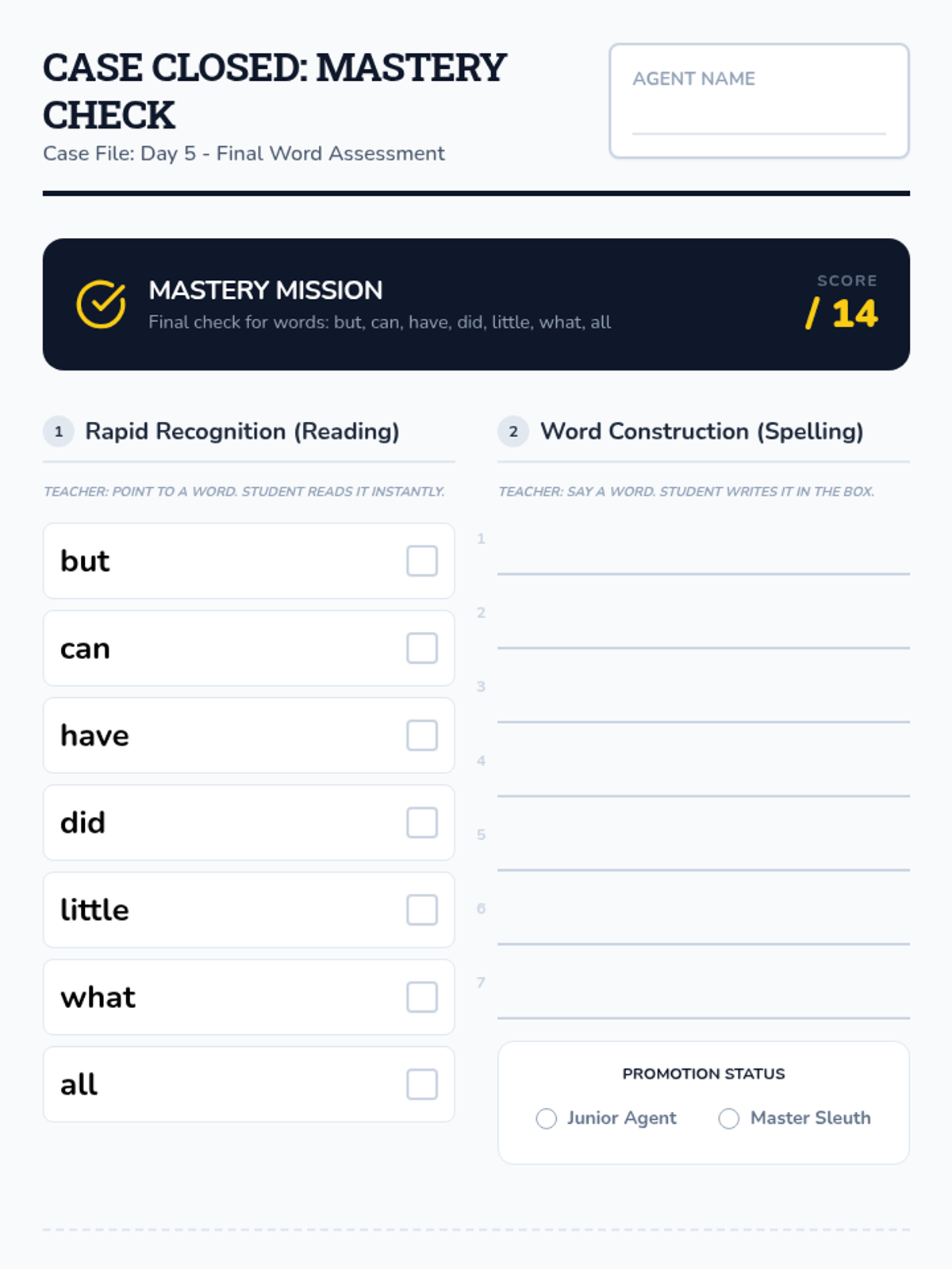 A comprehensive 5-day unit focused on mastering 7 high-frequency sight words (but, can, have, did, little, what, all) through a "Word Detective" theme. Students engage in daily investigations involving spelling, fluency, and small-group interactive games.