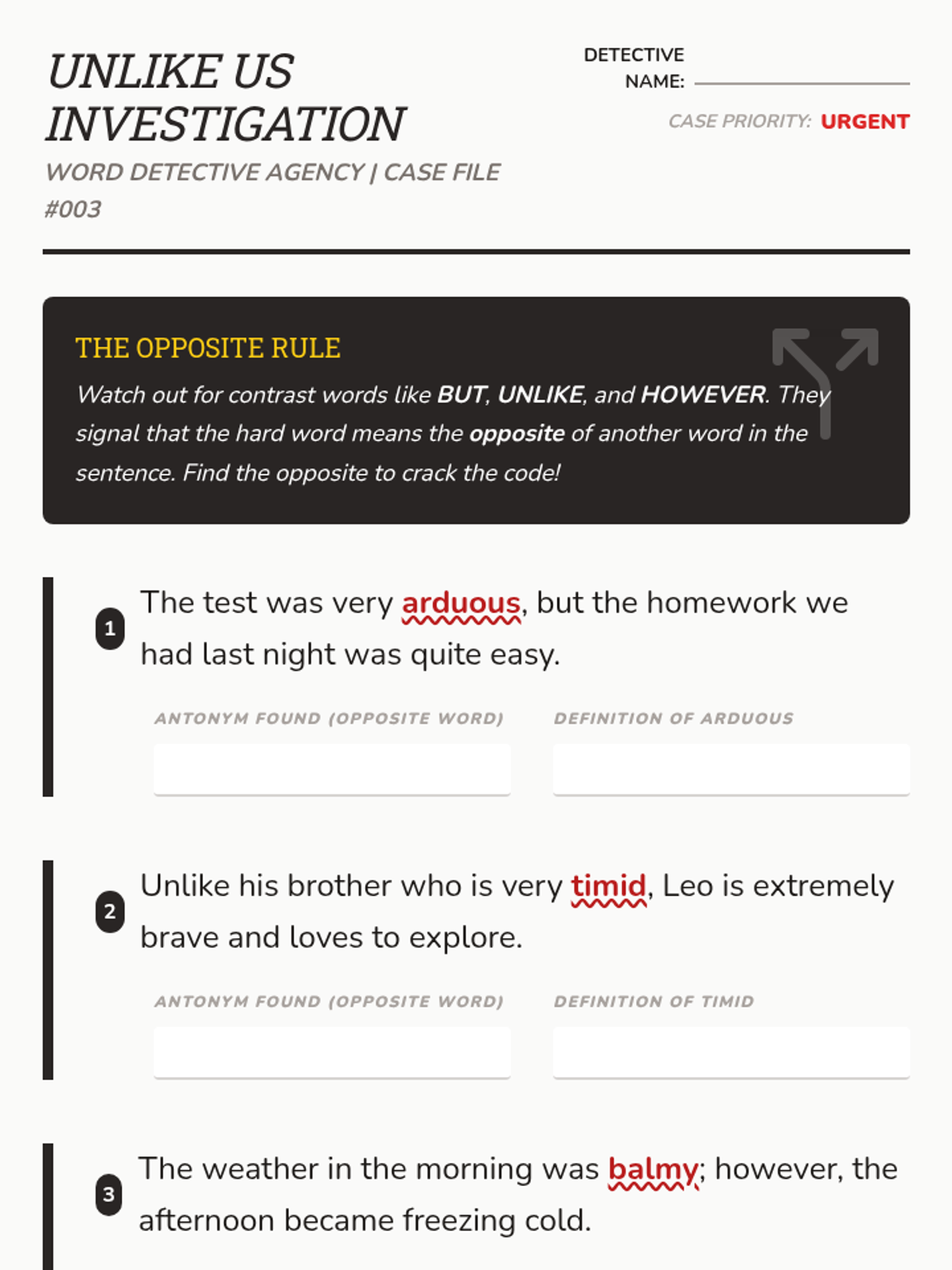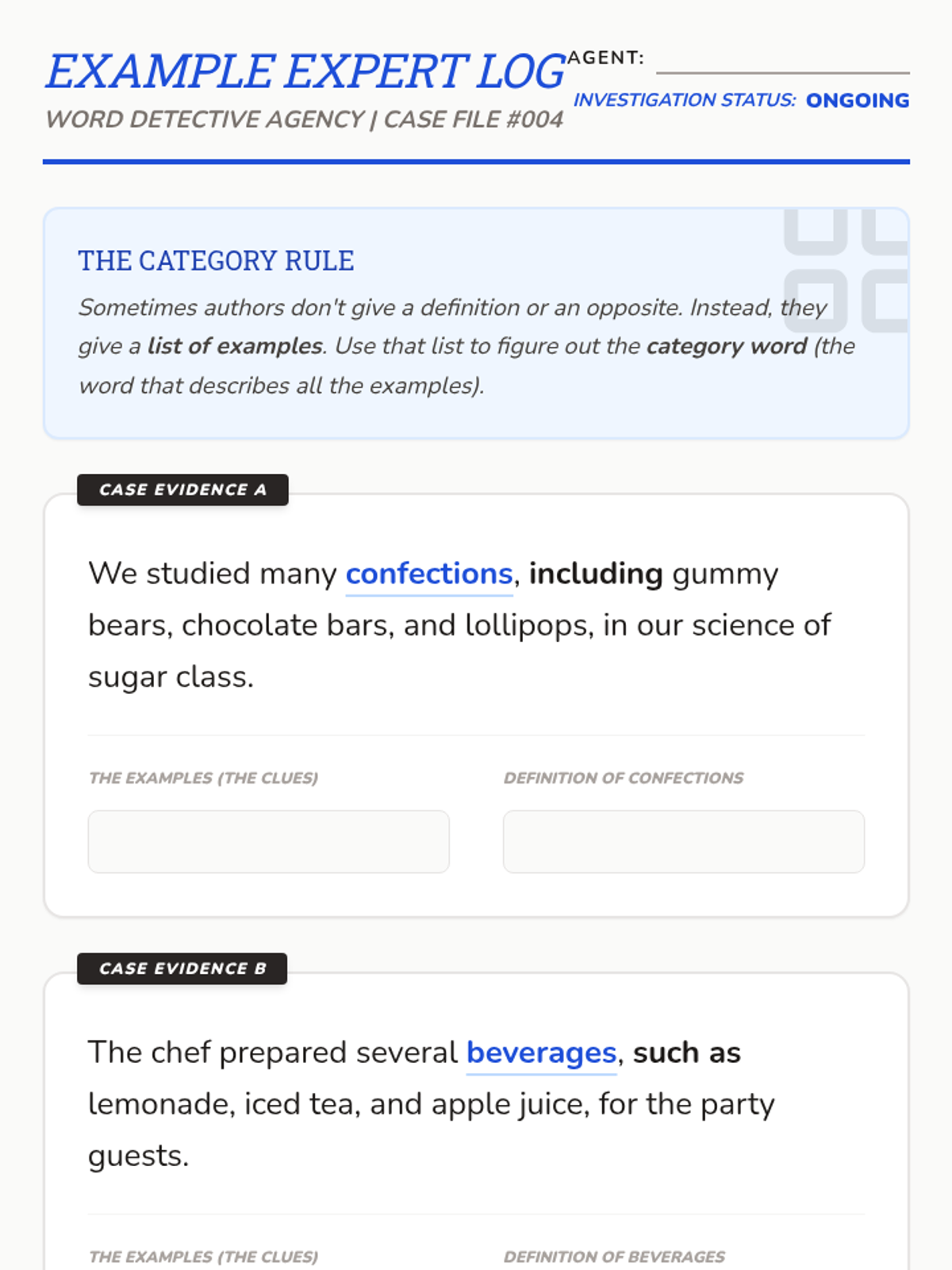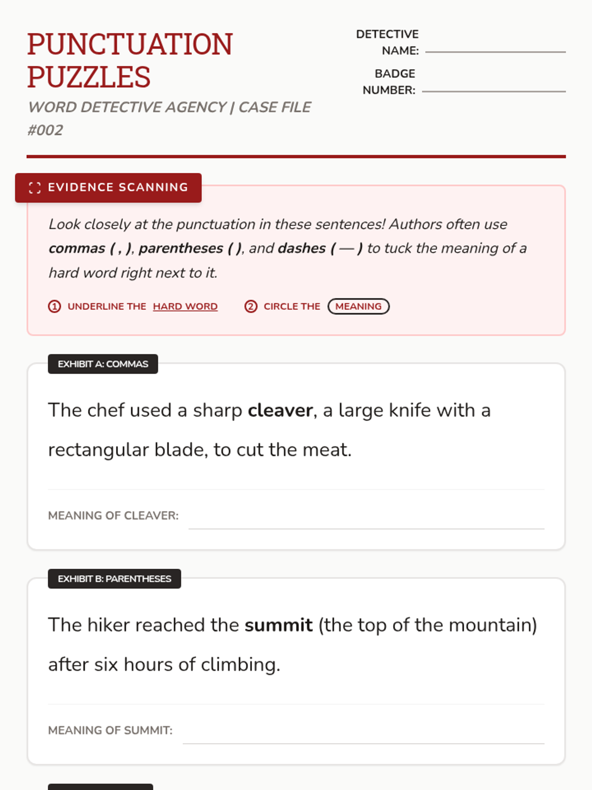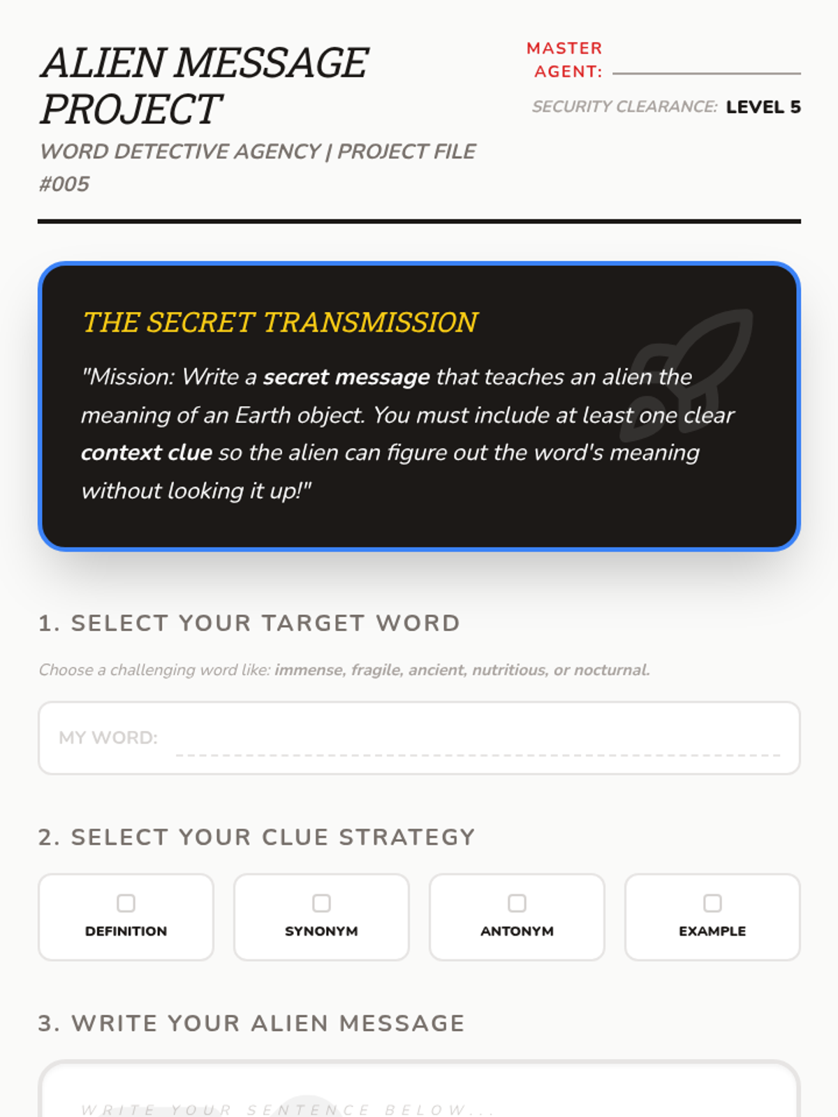 Students become independent readers by learning to identify and utilize four specific types of context clues: definitions, synonyms, antonyms, and examples. The sequence moves from inquiry-based nonsense word investigation to a final project where students author their own clue-rich sentences.