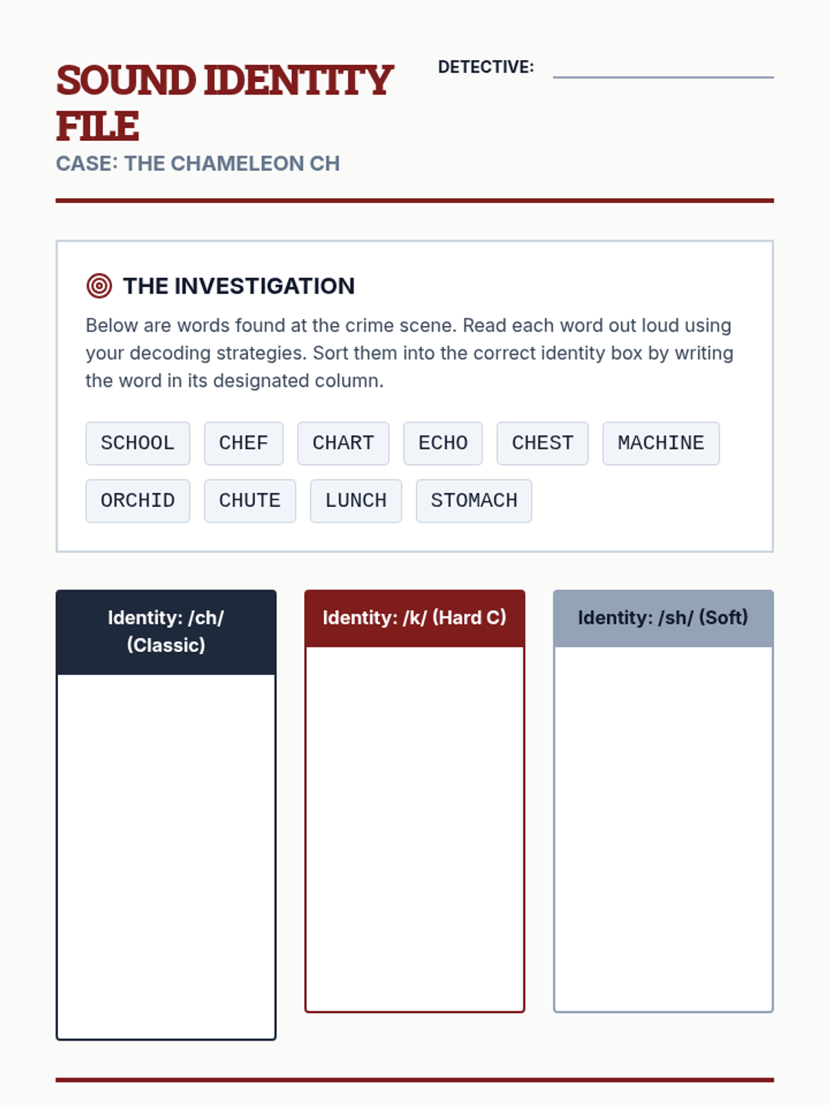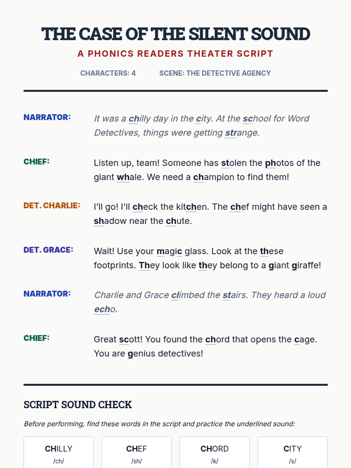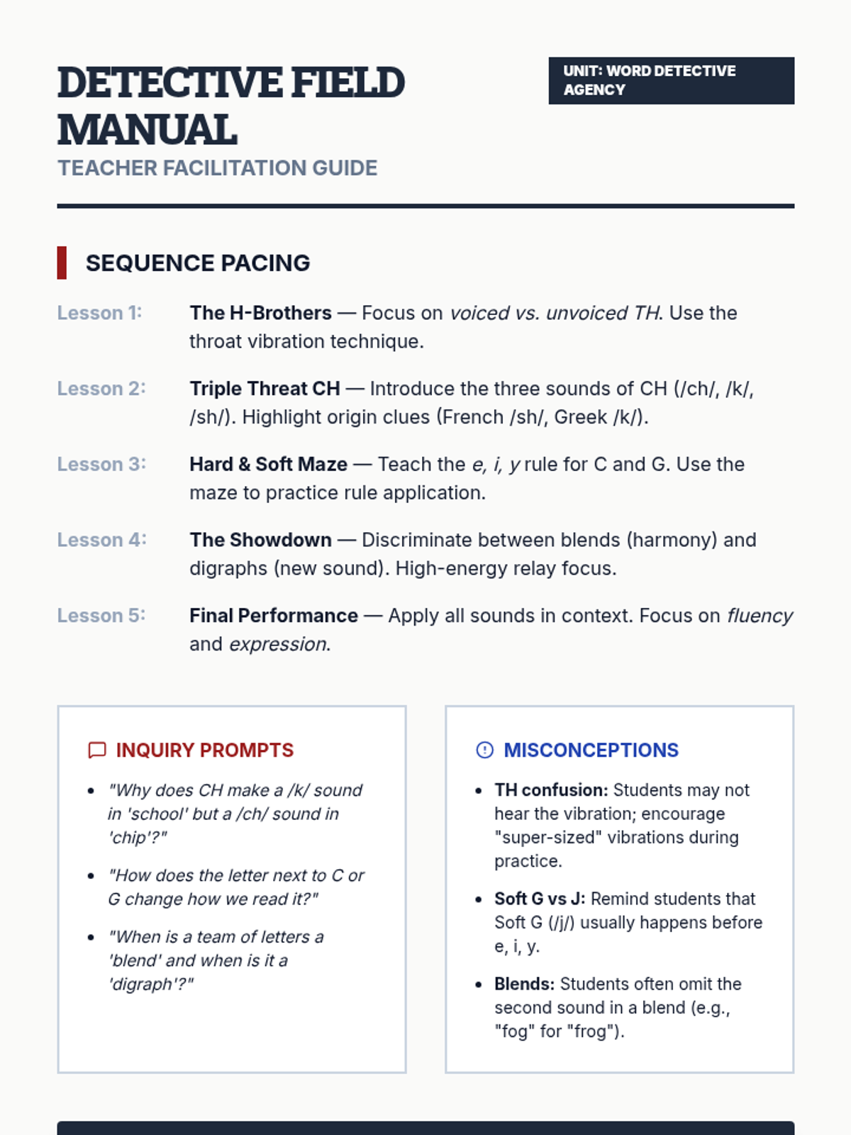 A 5-lesson phonics sequence for 3rd grade that uses a detective-themed investigative approach to help students master variable sounds in digraphs, blends, and hard/soft consonants. Students build decoding flexibility and resilience through games, sorting activities, and oral performance.