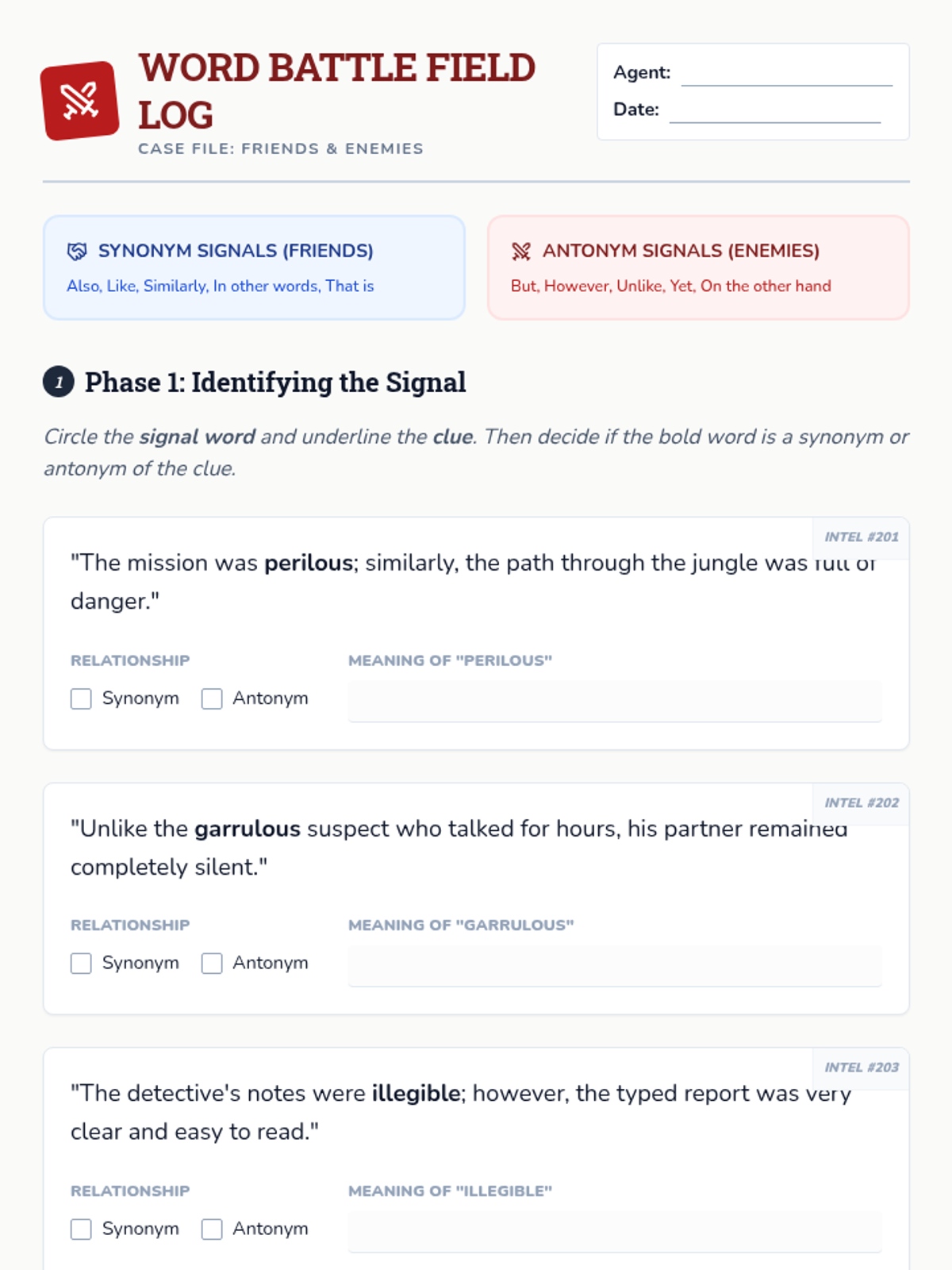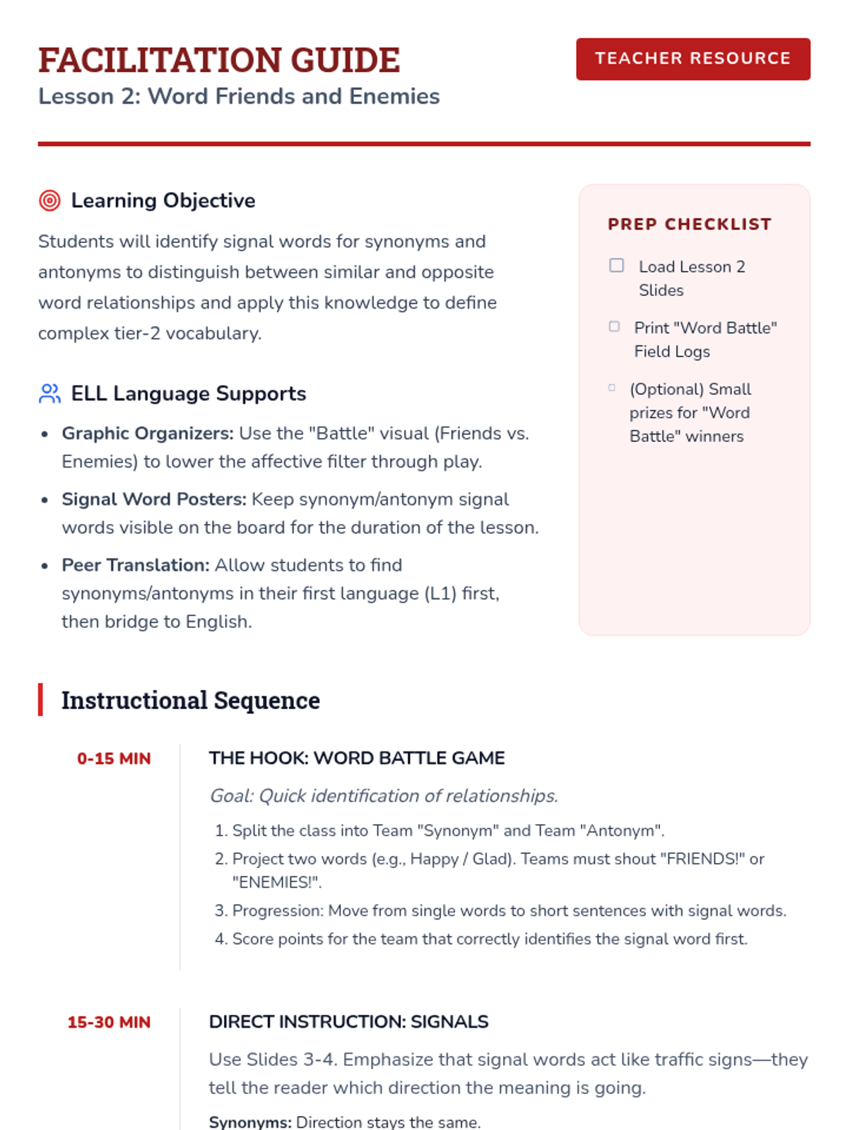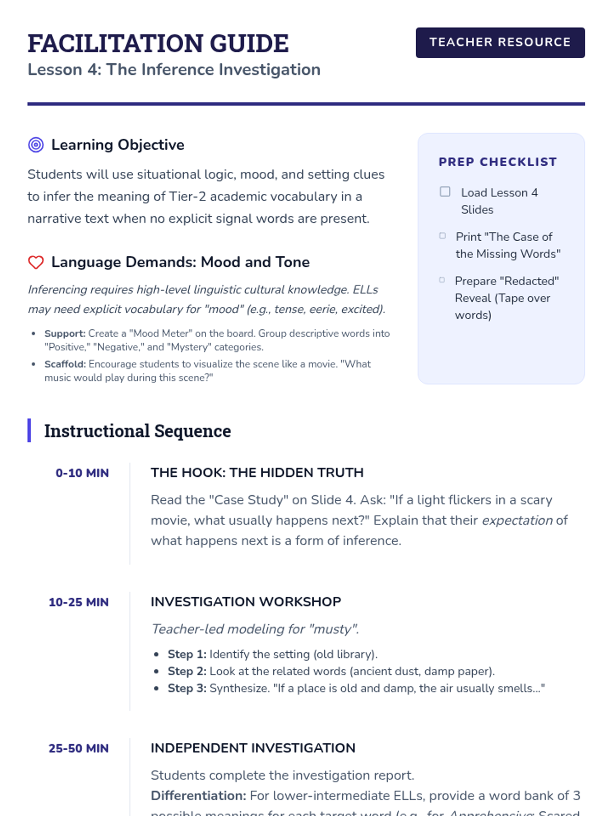 A comprehensive unit for 6th grade intermediate ELL students to master the IDEAS context clues strategies (Inference, Definition, Example, Antonym, Synonym). Students progress from identifying explicit signals to inferring meaning in complex narrative and informational texts.