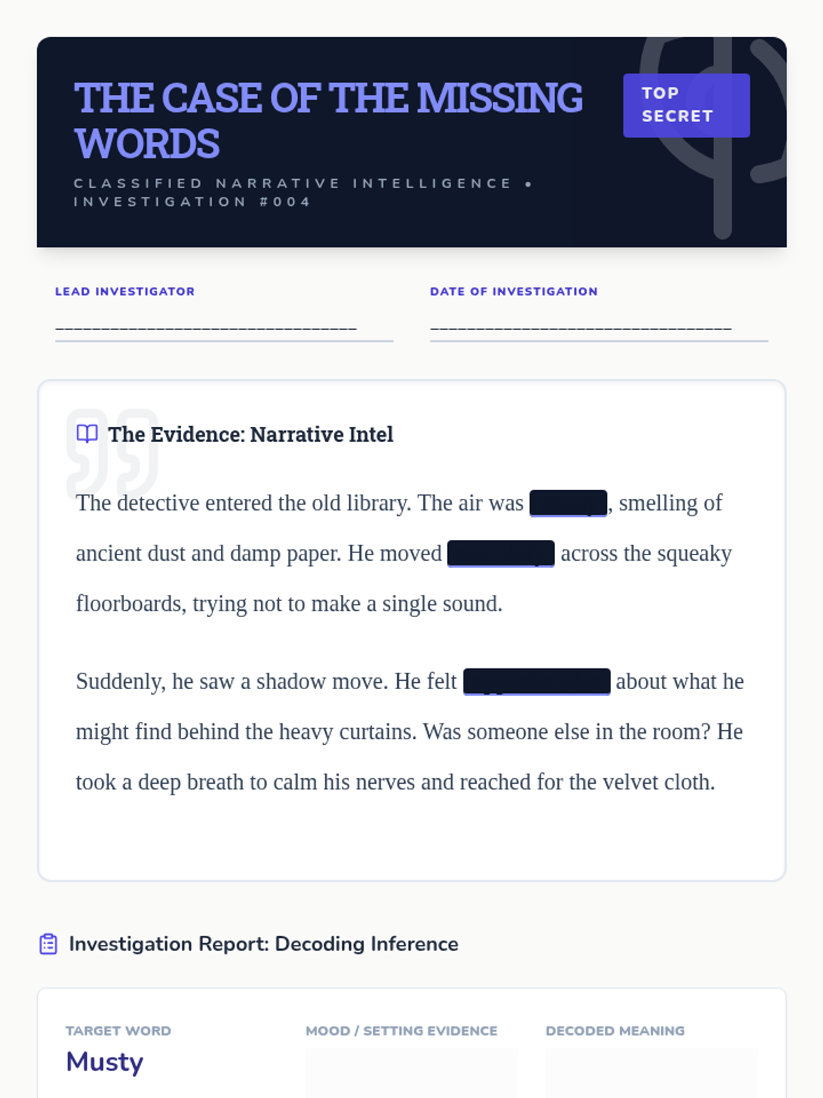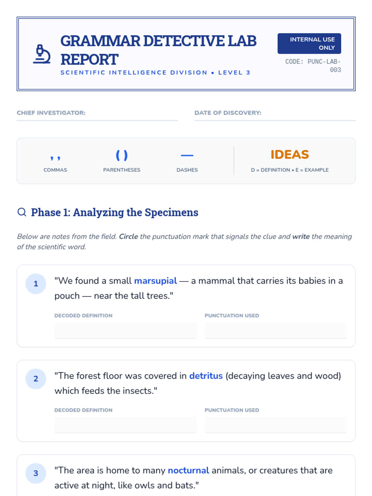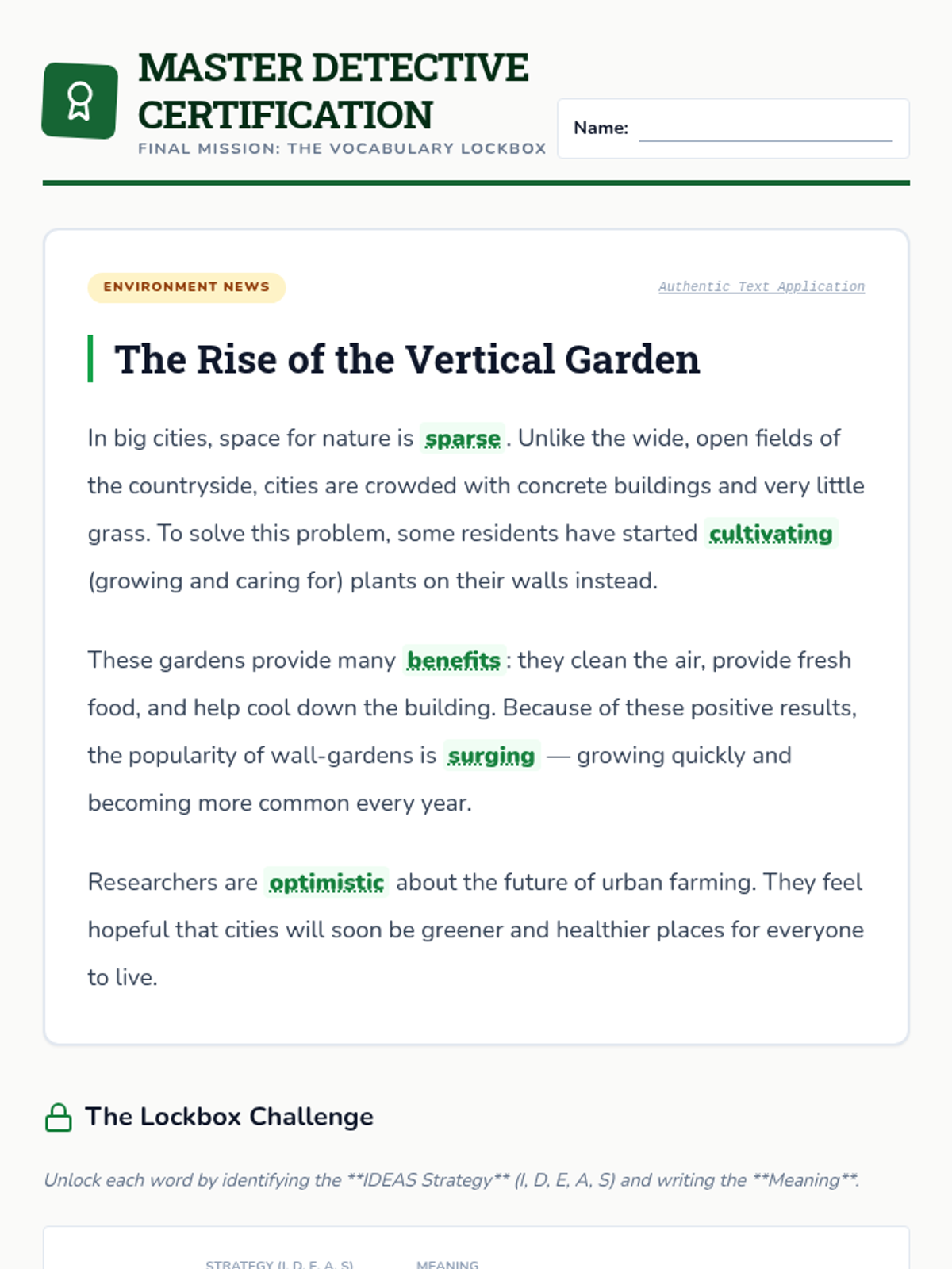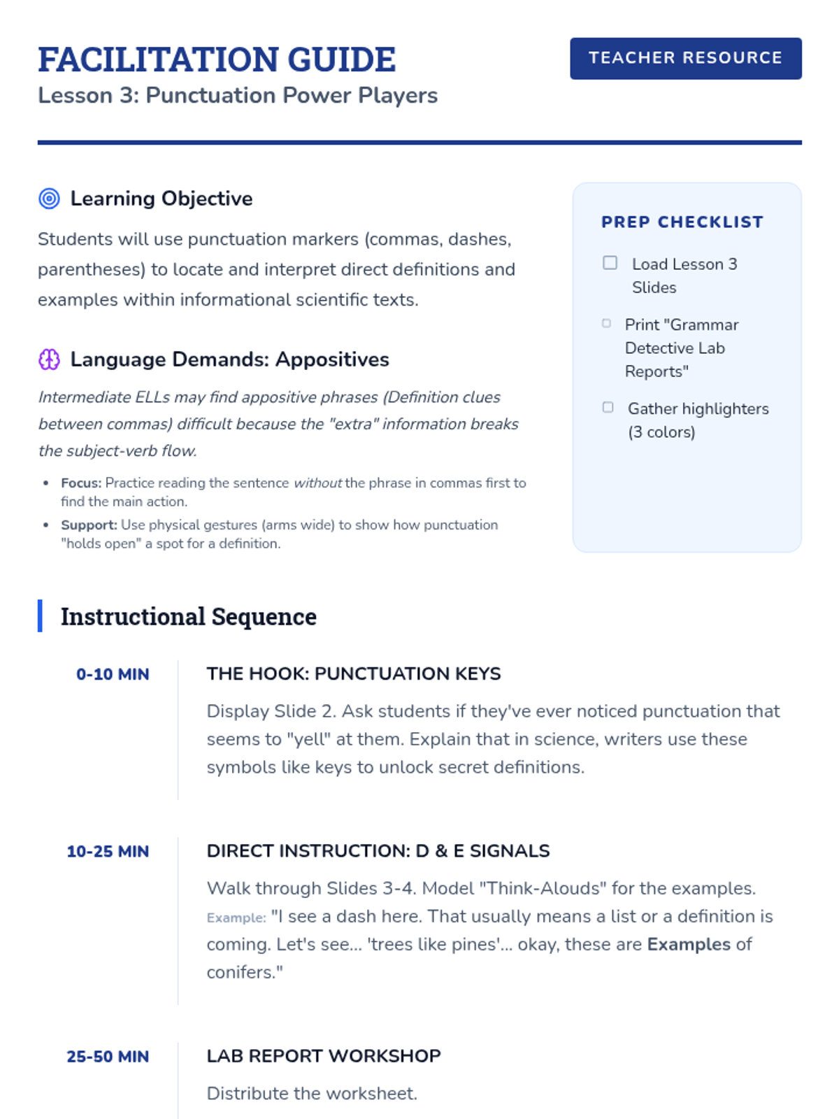A comprehensive unit for 6th grade intermediate ELL students to master the IDEAS context clues strategies (Inference, Definition, Example, Antonym, Synonym). Students progress from identifying explicit signals to inferring meaning in complex narrative and informational texts.