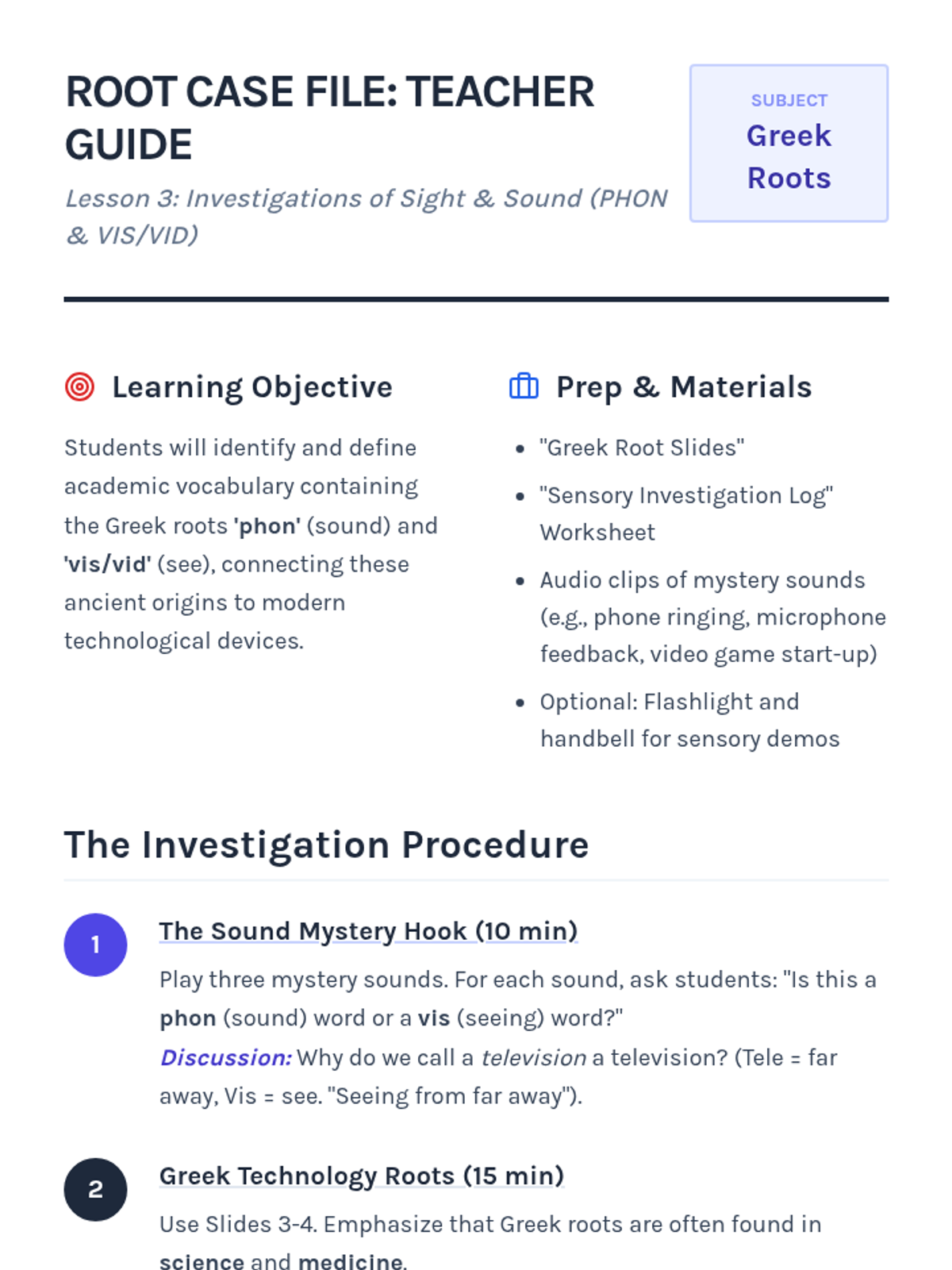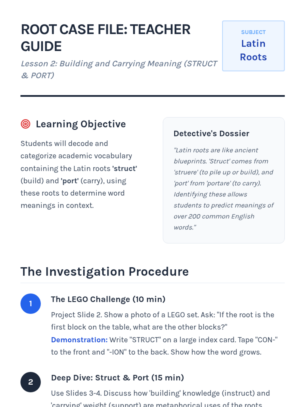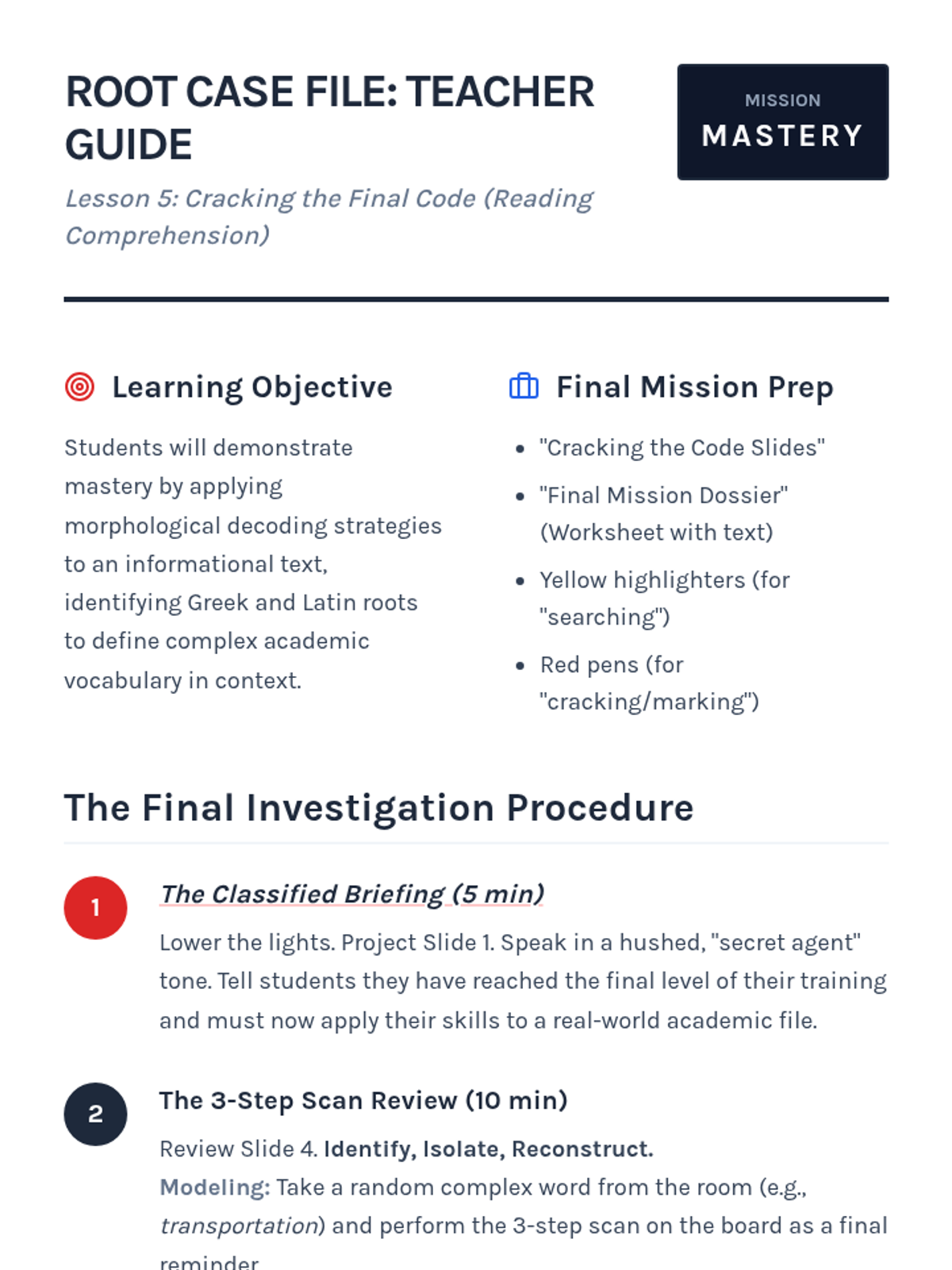 A 4th-grade ELA sequence where students become 'word detectives' to decode unfamiliar vocabulary using Greek and Latin roots, prefixes, and suffixes. Through a workshop-style approach, students learn to analyze morphological structures to unlock the meaning of academic text.