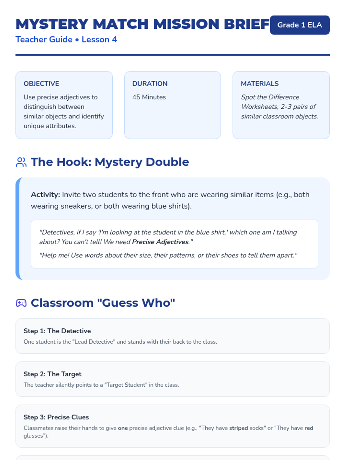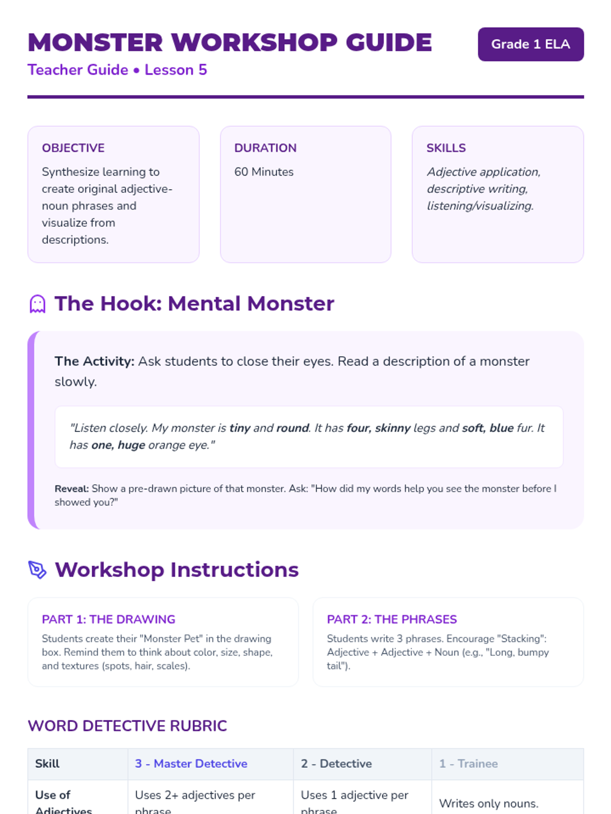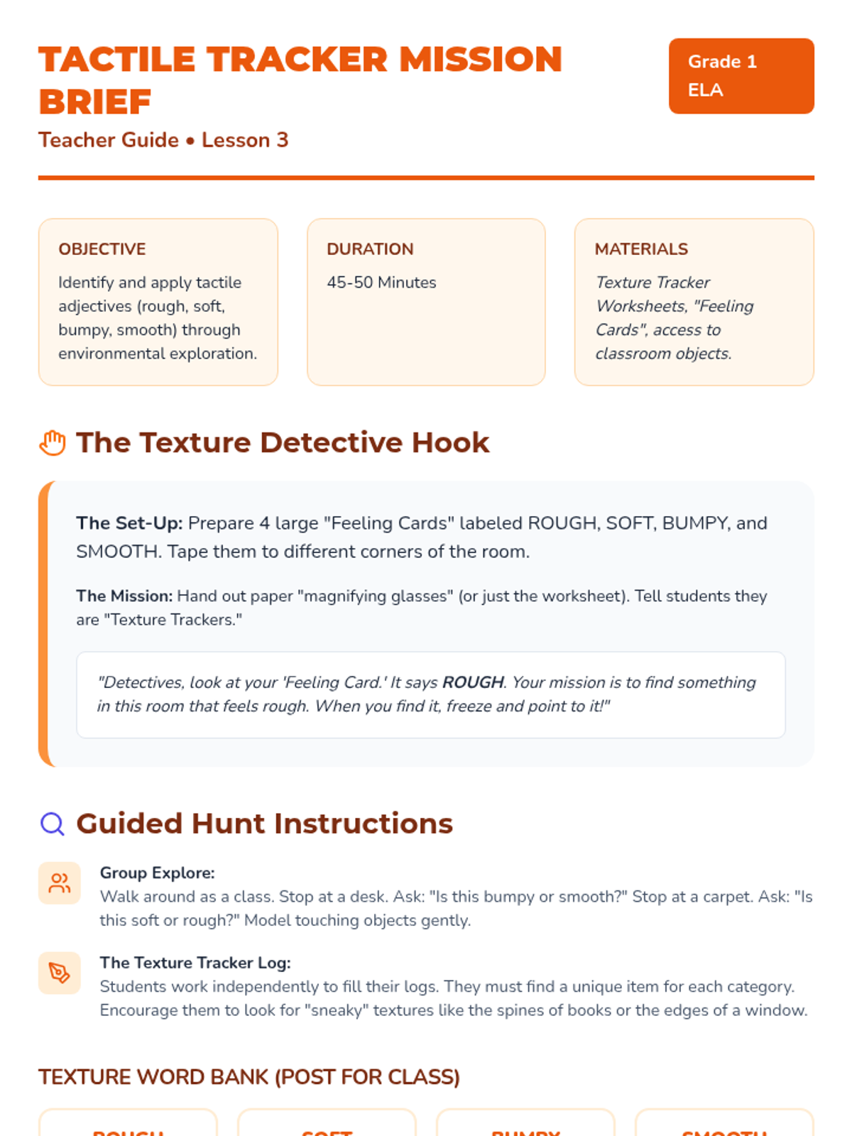 A foundational grammar sequence for first graders that uses a 'Word Detective' theme to explore adjectives through sensory exploration, sorting, and descriptive writing. Students learn to use their five senses to identify and apply adjectives to describe the world around them.