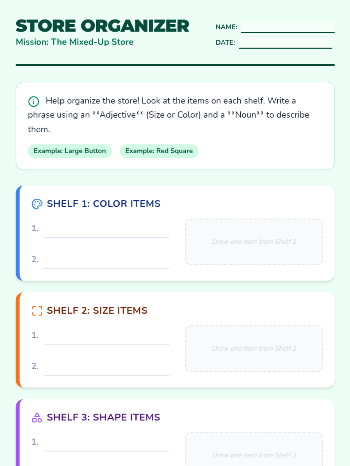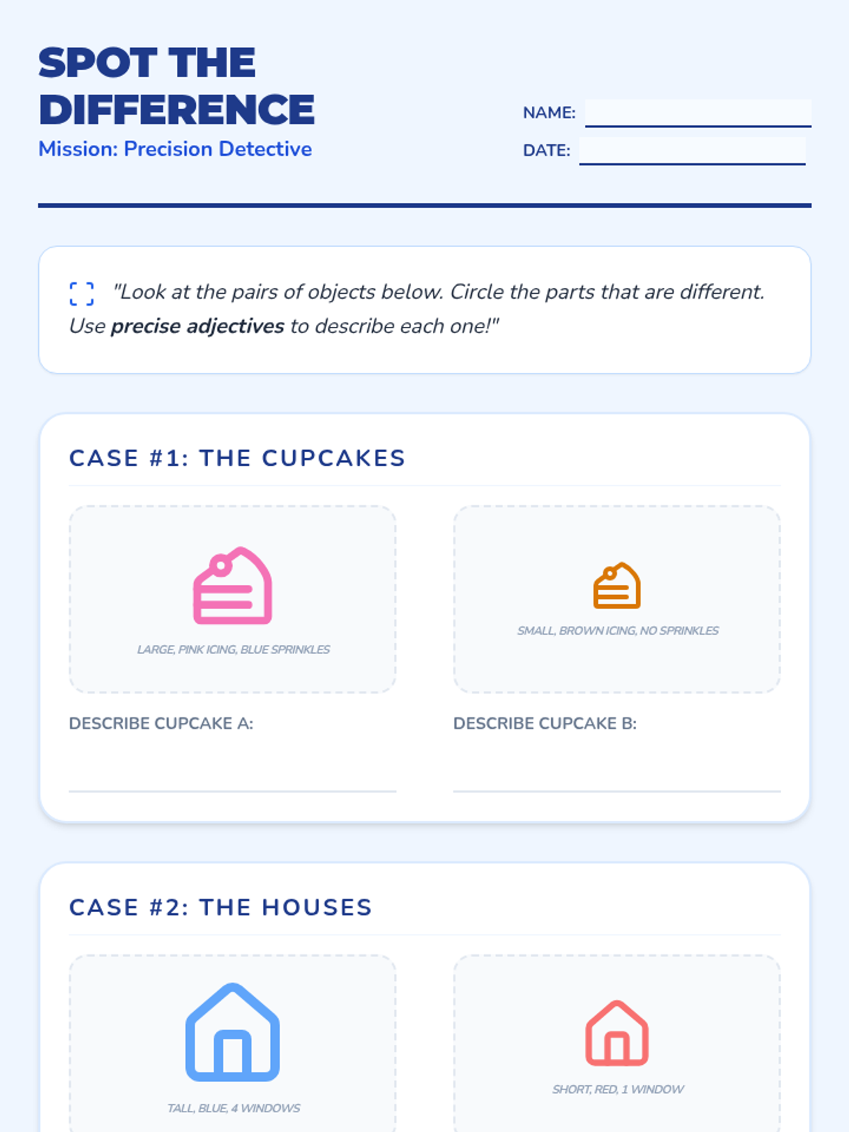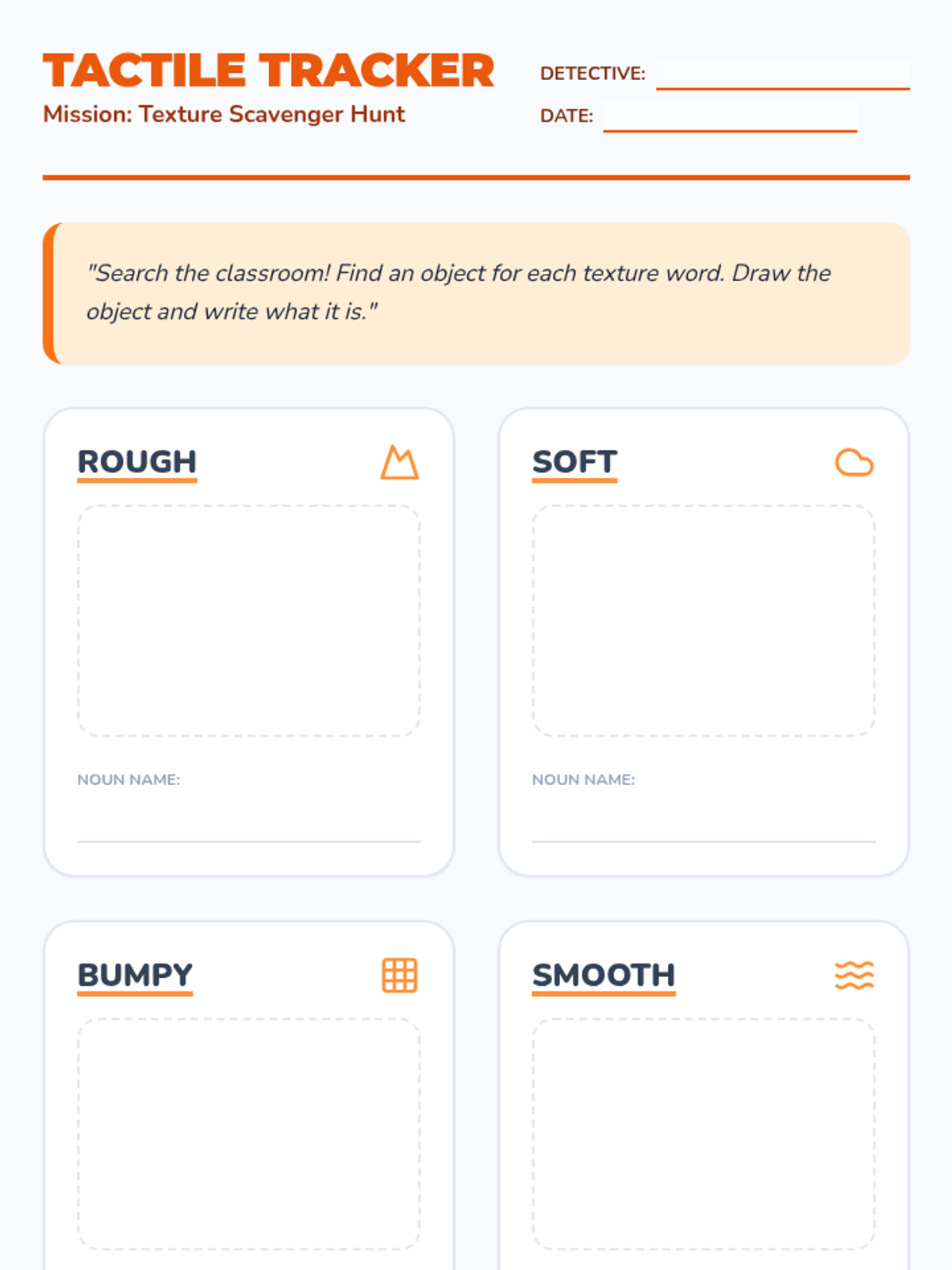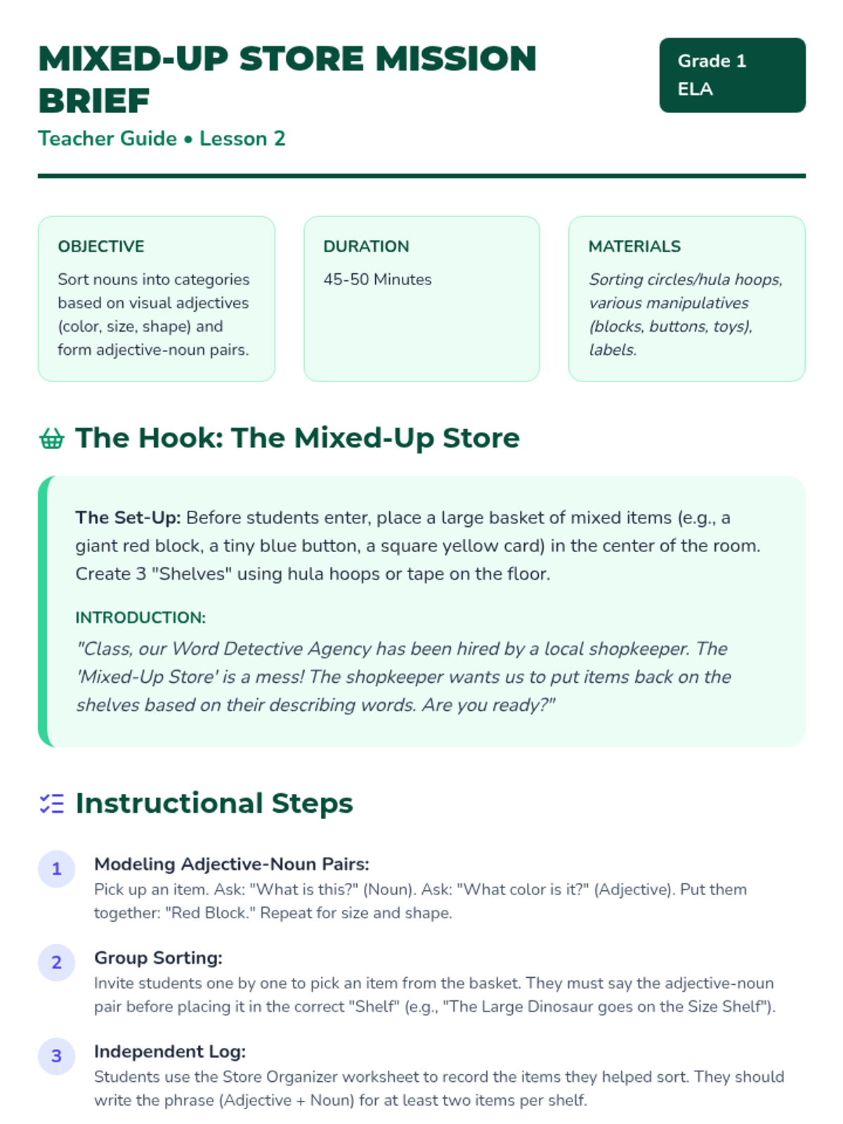 A foundational grammar sequence for first graders that uses a 'Word Detective' theme to explore adjectives through sensory exploration, sorting, and descriptive writing. Students learn to use their five senses to identify and apply adjectives to describe the world around them.