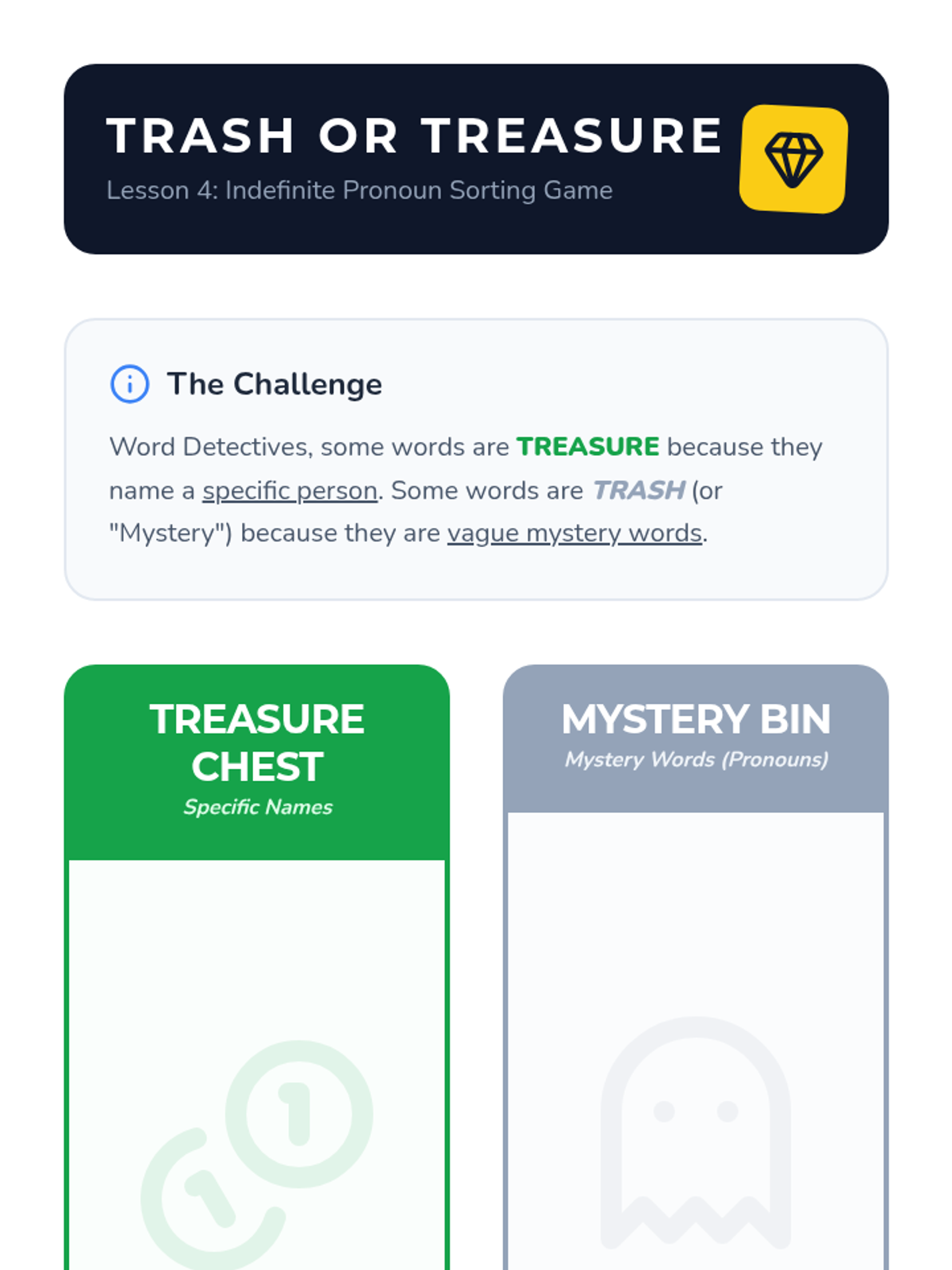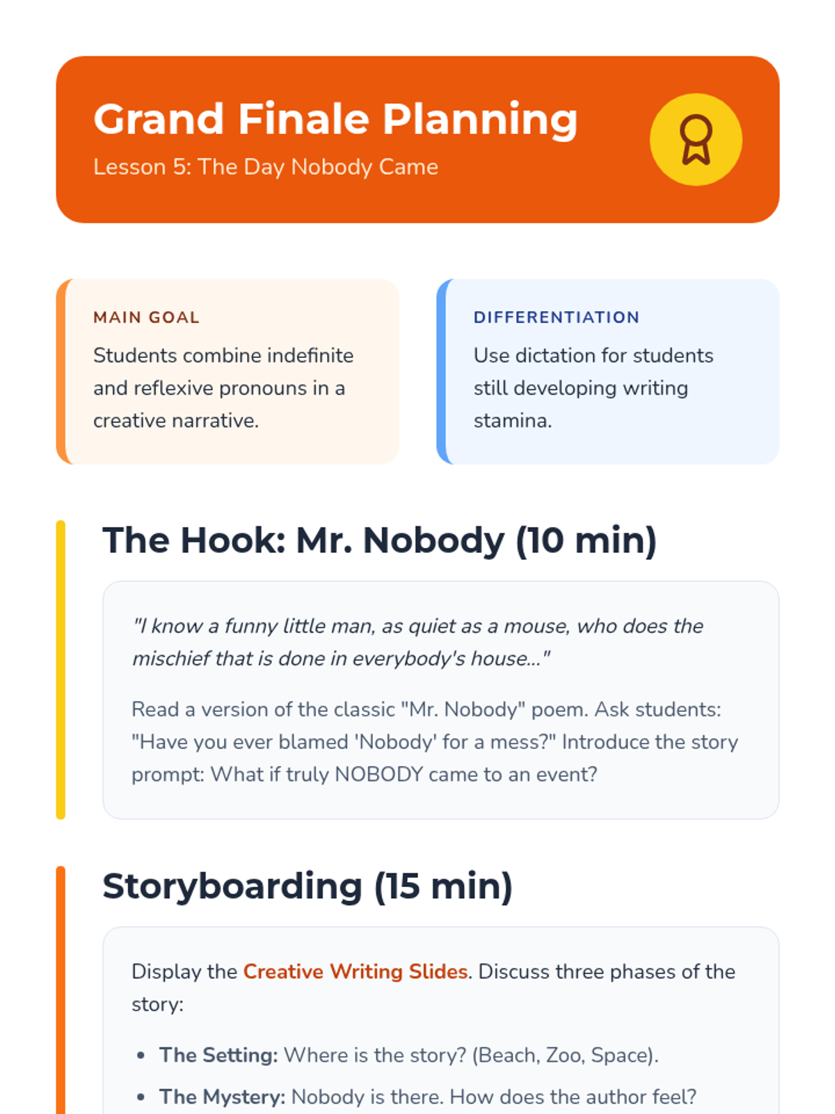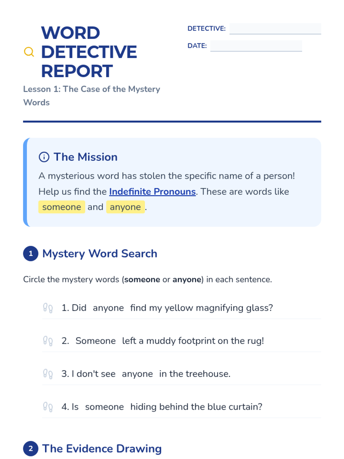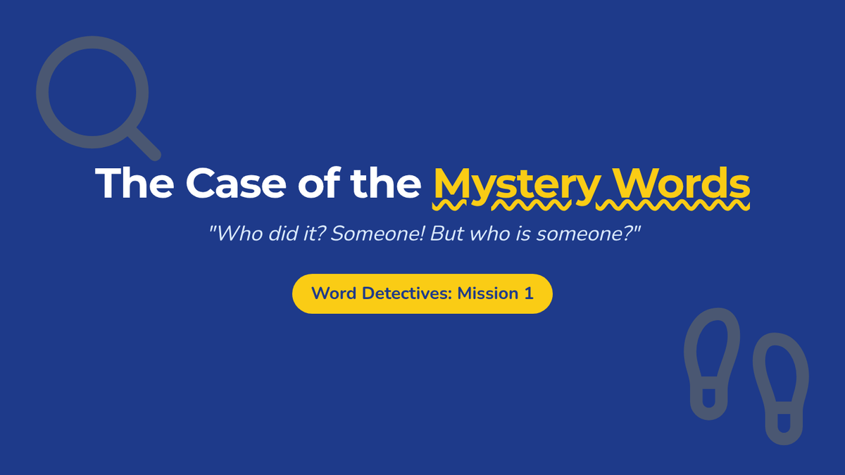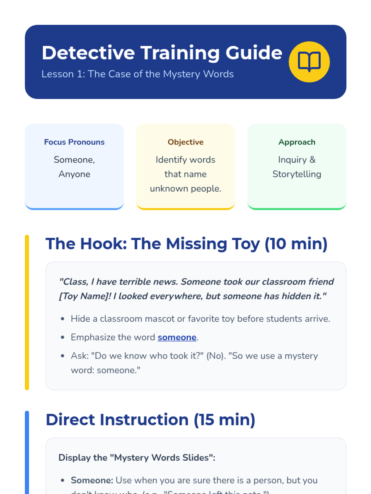 A whimsical, detective-themed introduction to indefinite pronouns (someone, everyone, nobody) and reflexive pronouns (myself, yourself) designed for 1st-grade learners through storytelling and hands-on activities.