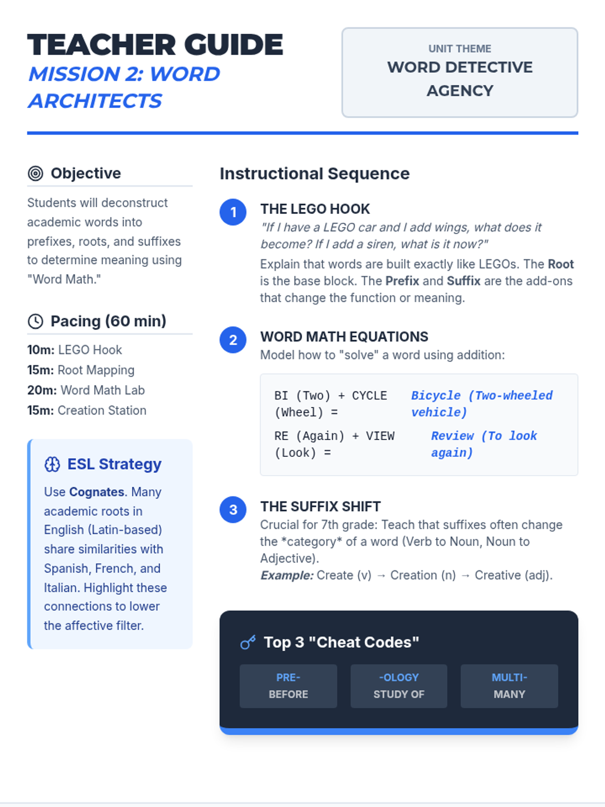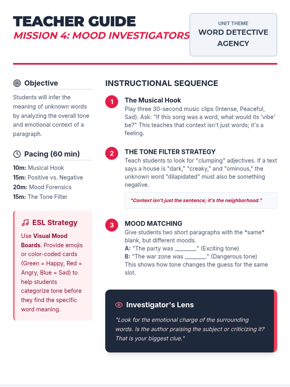 A sequence designed for 7th-grade ESL students to master the art of inferring unknown academic vocabulary through context clues, morphology, syntax, and tone analysis. This unit transforms vocabulary gaps from roadblocks into solvable puzzles using a "Word Detective" theme.