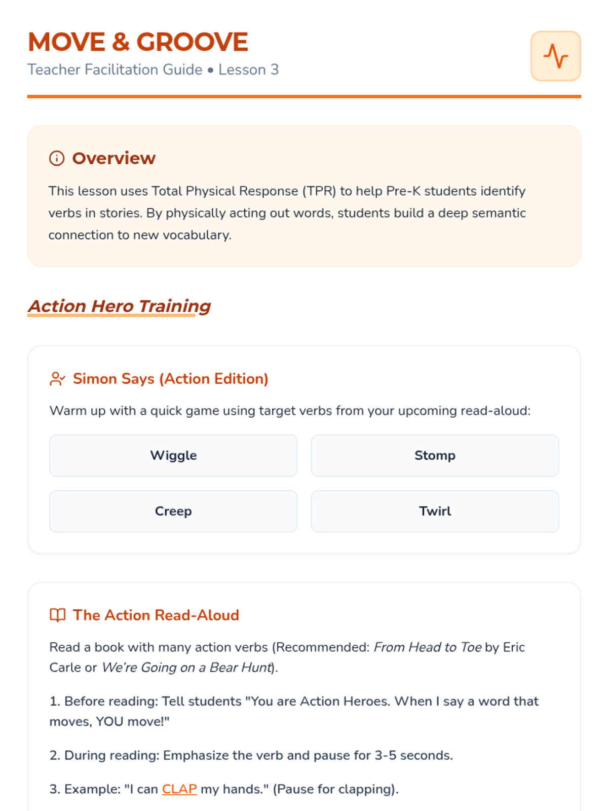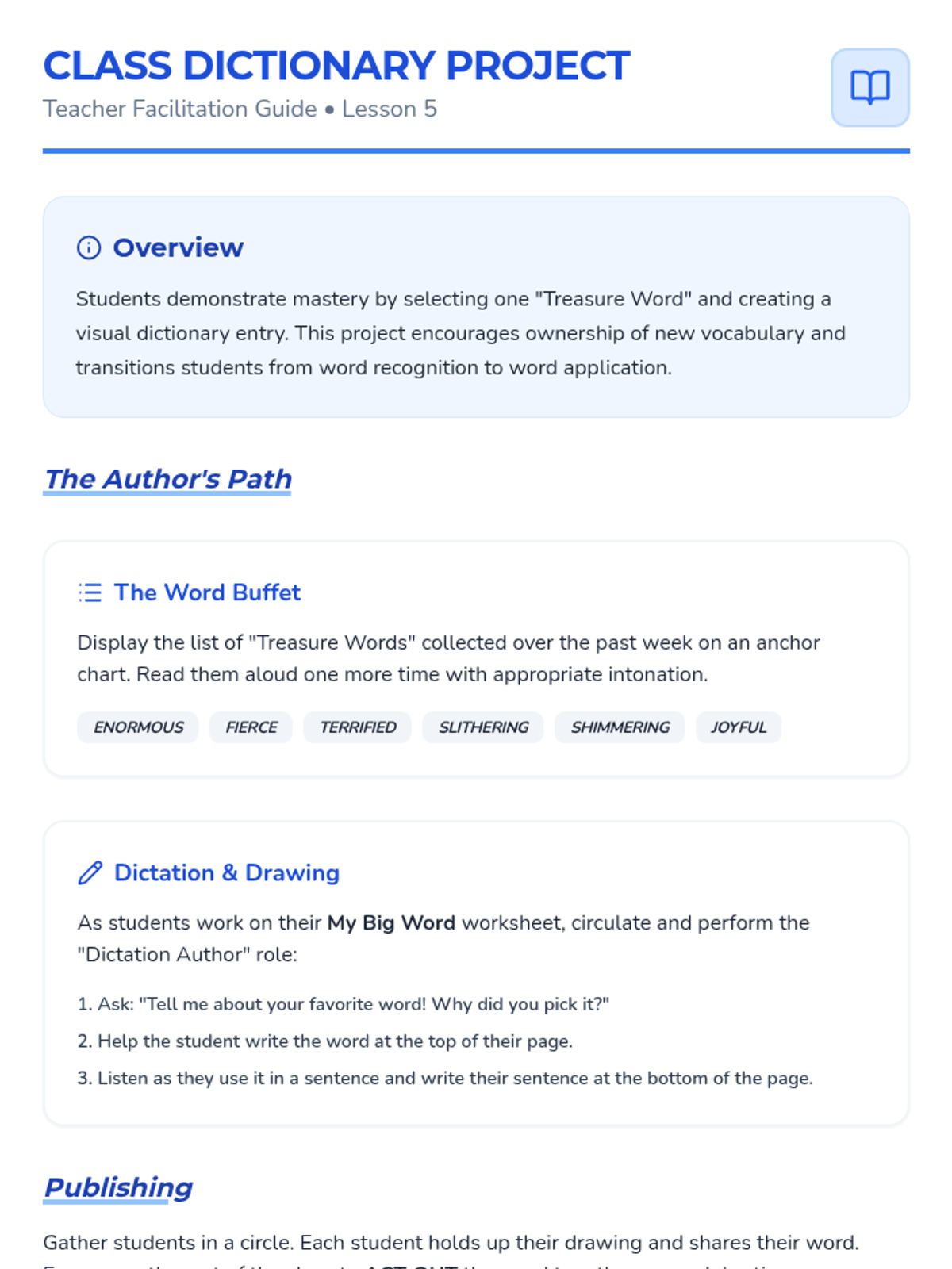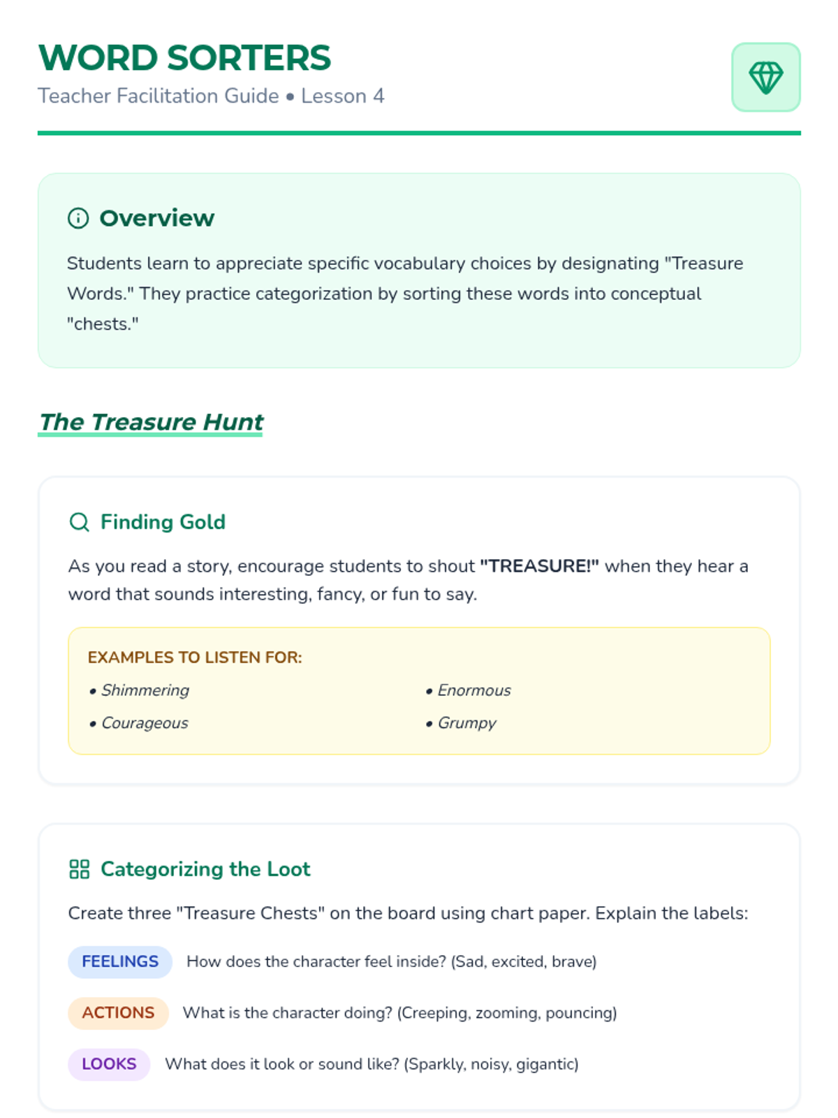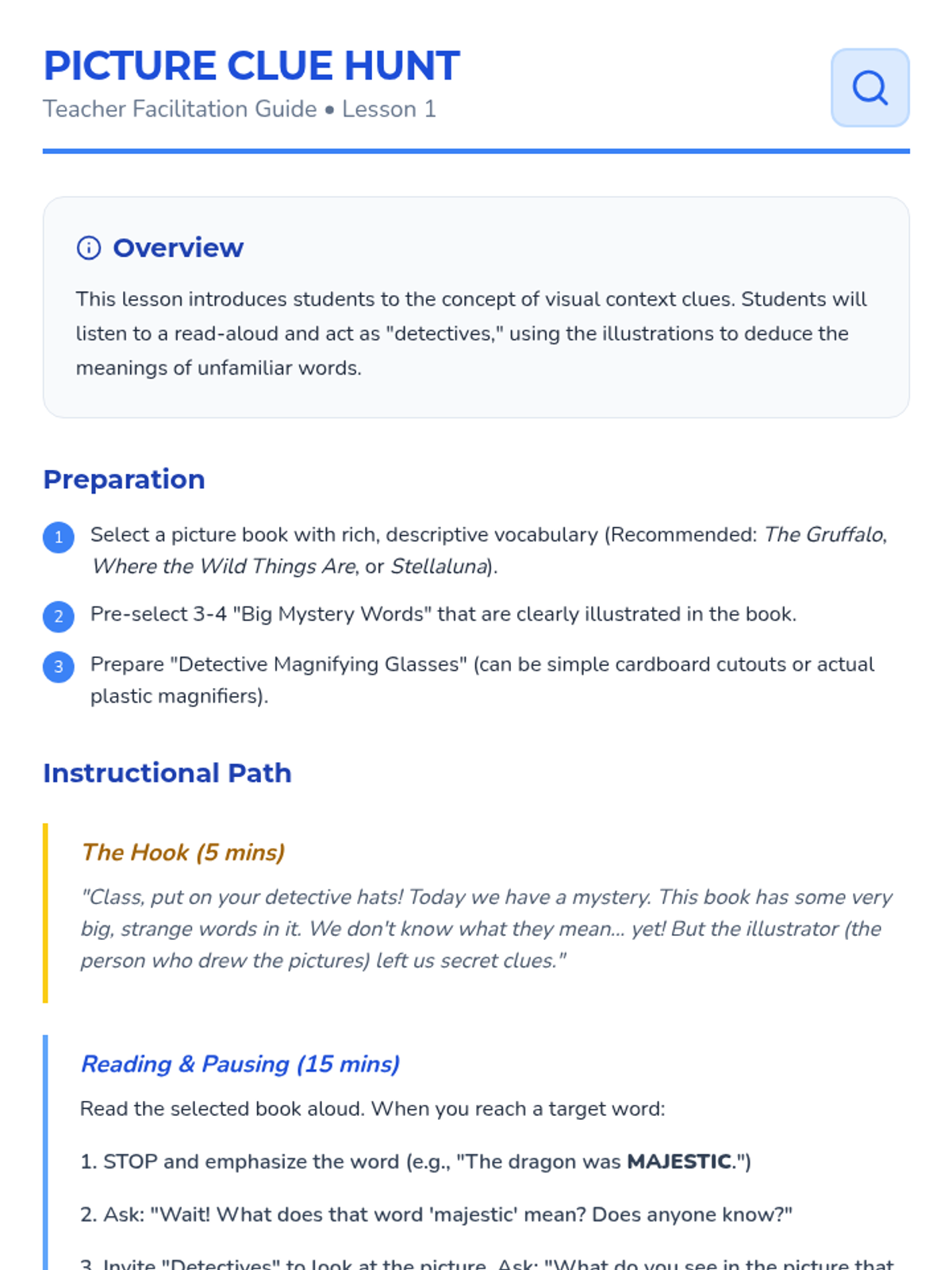 A Pre-K ELA sequence focused on using context clues (illustrations) and audio cues (intonation) to understand new vocabulary in read-along literary texts. Students transition from word detectives to active users of "treasure words."