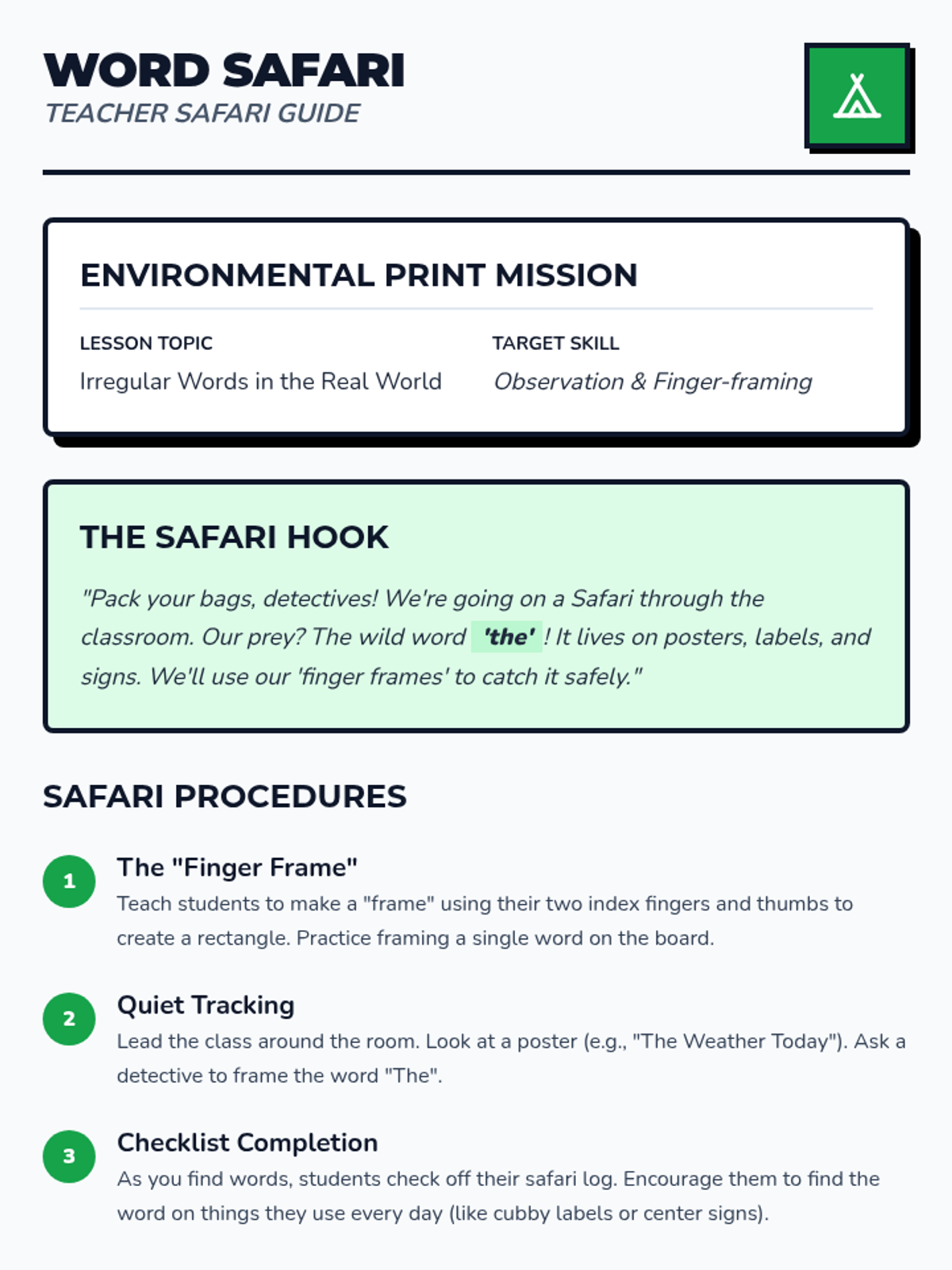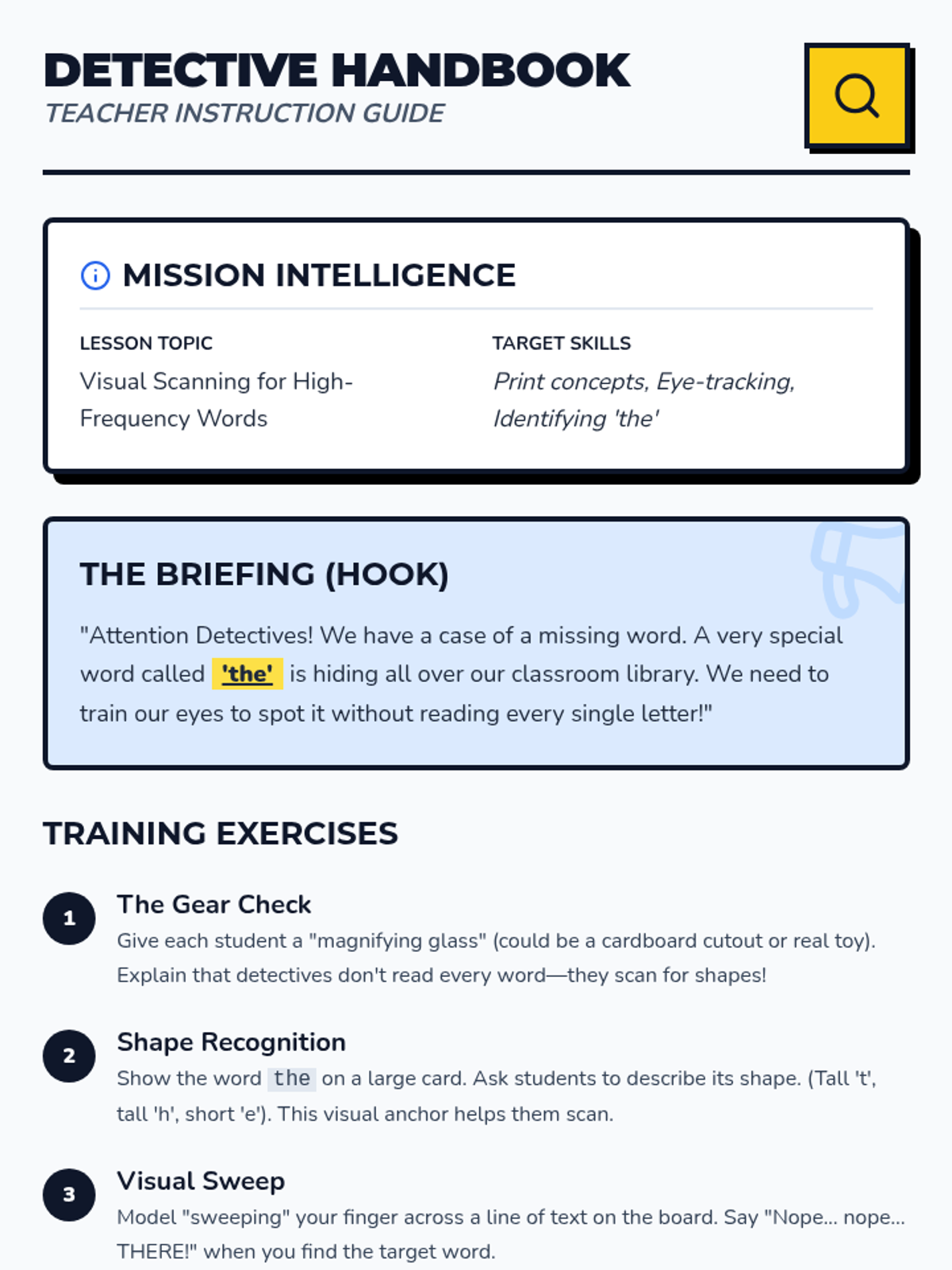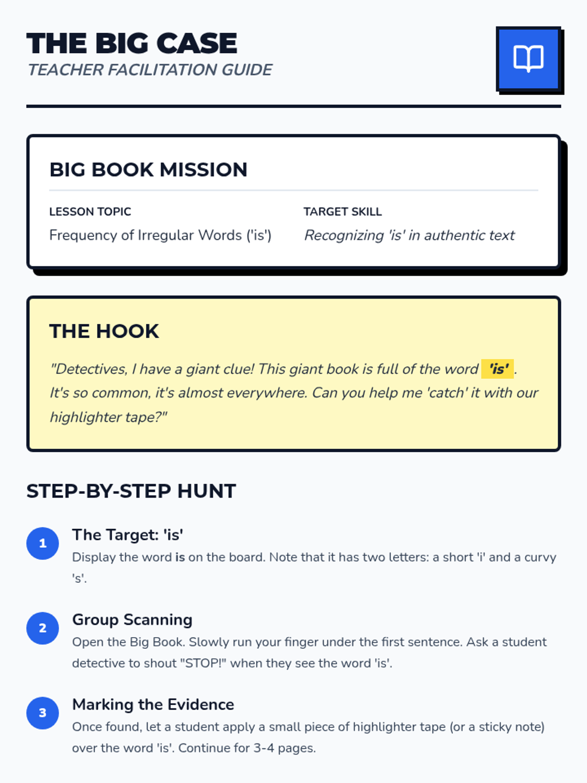 This inquiry-based sequence focuses on locating and identifying irregular words within the context of authentic literature. Students transition from seeing words in isolation to recognizing them as functional parts of sentences in books through a 'detective' theme.