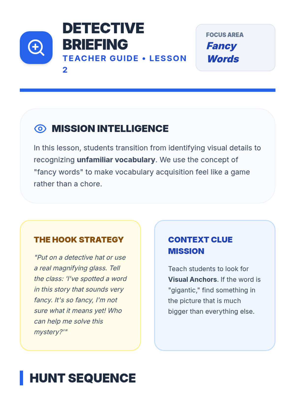 A Kindergarten sequence that bridges the gap between hearing words and seeing them in illustrations. Students act as 'Story Detectives' to explore vocabulary, sounds, and emotions in read-along texts.