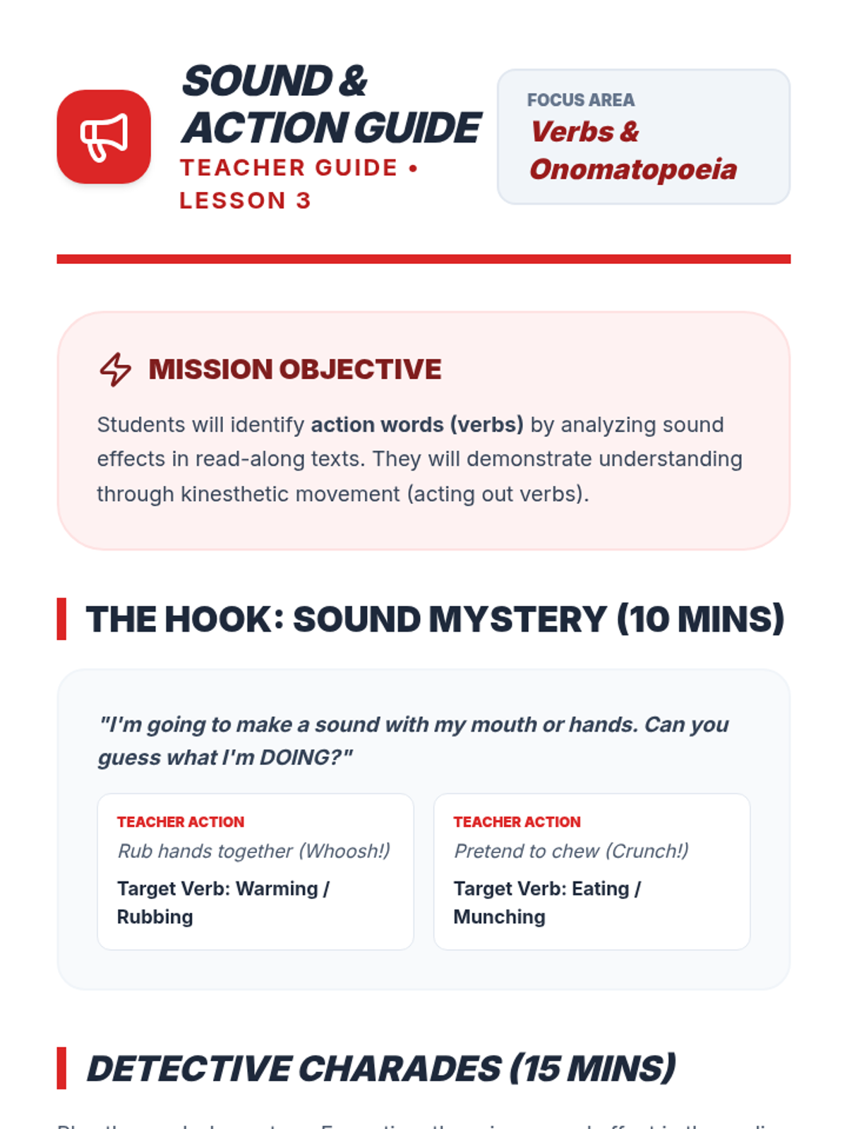 This Kindergarten sequence introduces simple past and present verb tenses through physical movement, oral language practice, and visual sorting. Students will learn to identify action words, distinguish between 'now' and 'before', and use the '-ed' ending to describe past events.