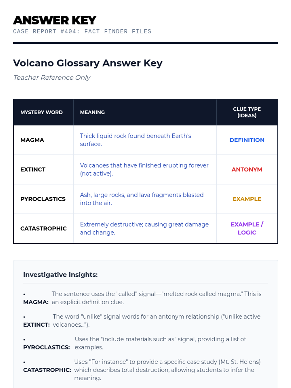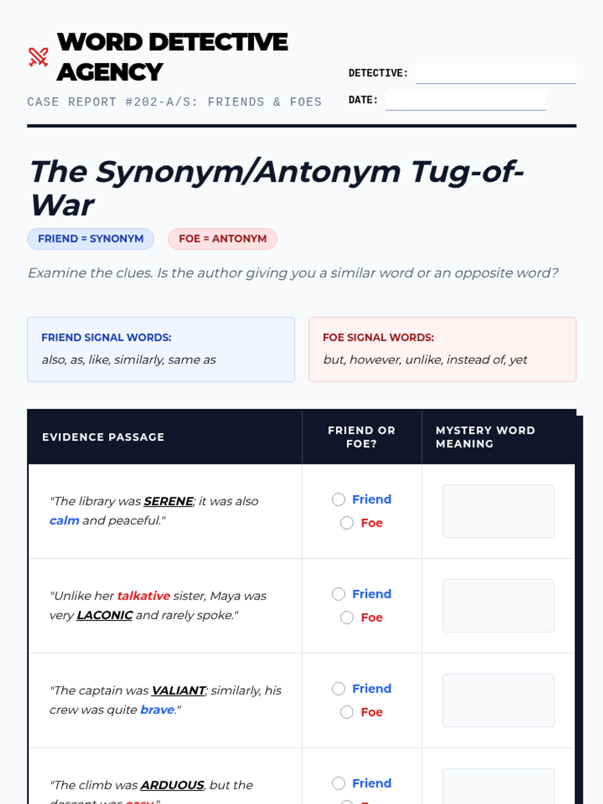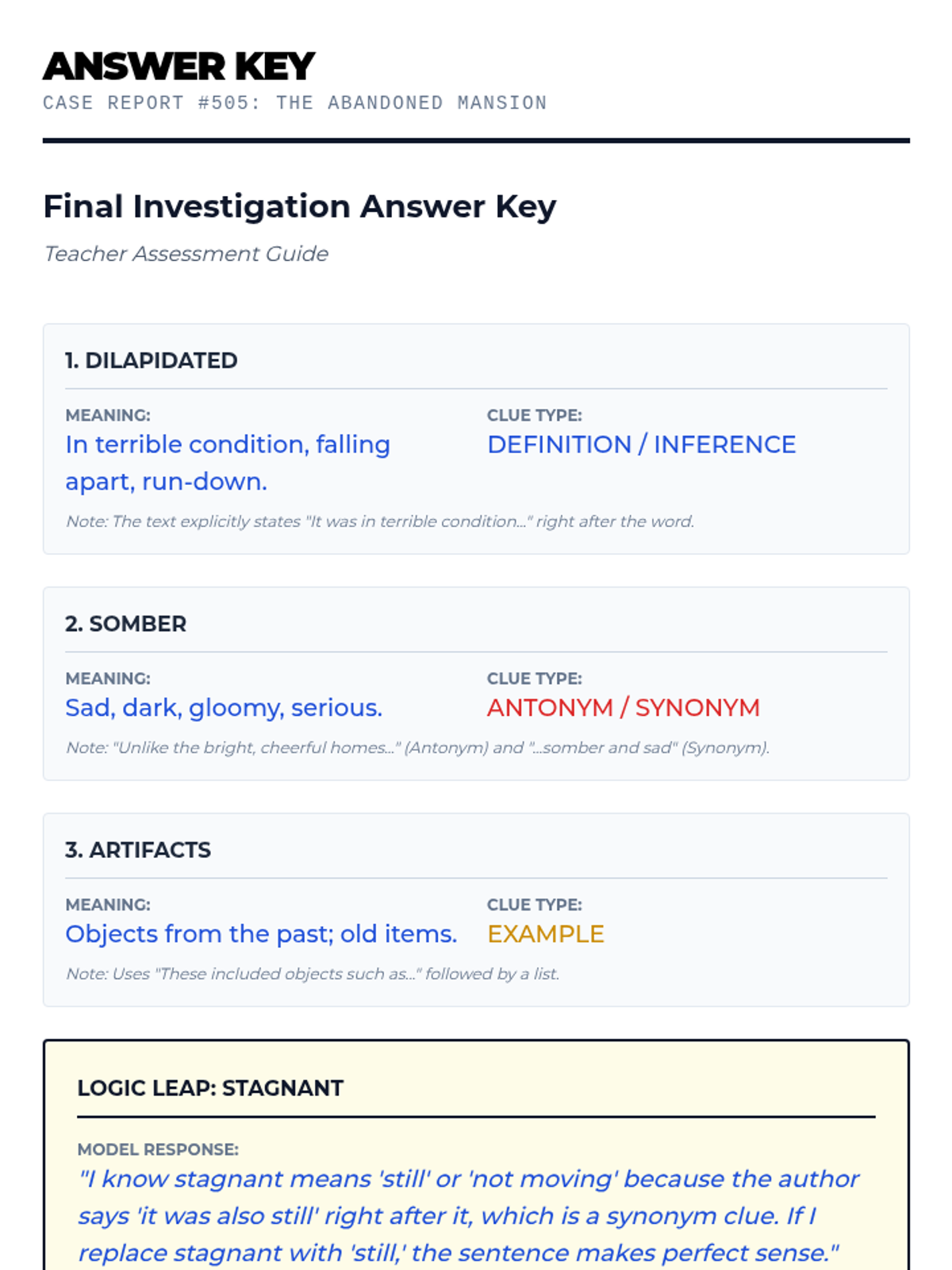 This sequence systematically builds 4th Grade student proficiency in identifying and using context clues (I.D.E.A.S.) to decipher unfamiliar vocabulary, moving from explicit definition clues to subtle inference-based logic.