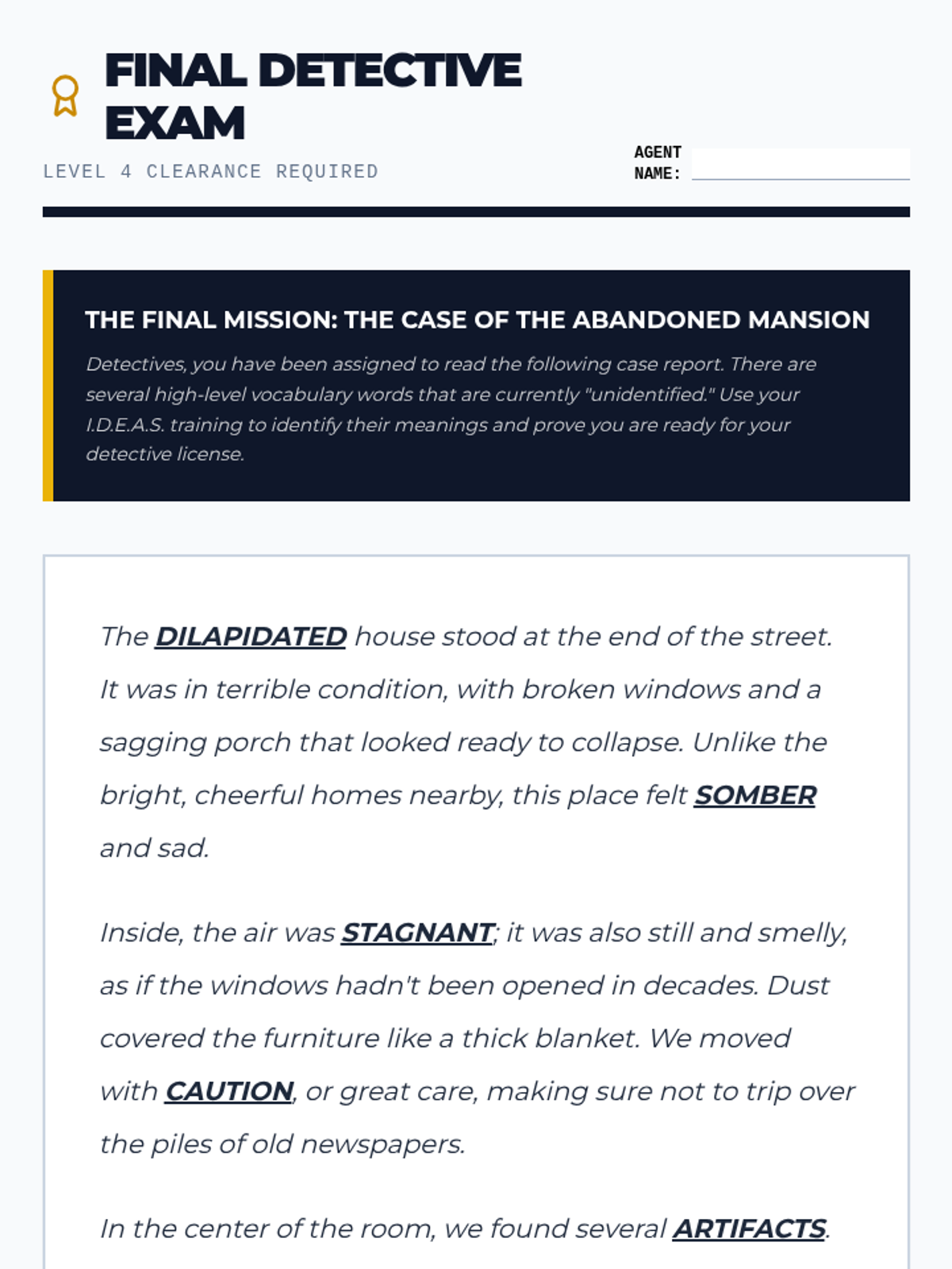 A 5-lesson unit for 4th Grade ESL students focusing on test-taking strategies for reading comprehension. Students learn to use their 'detective tools' to find evidence, annotate effectively, and navigate passages with a focus on 'proving' their answers rather than guessing.