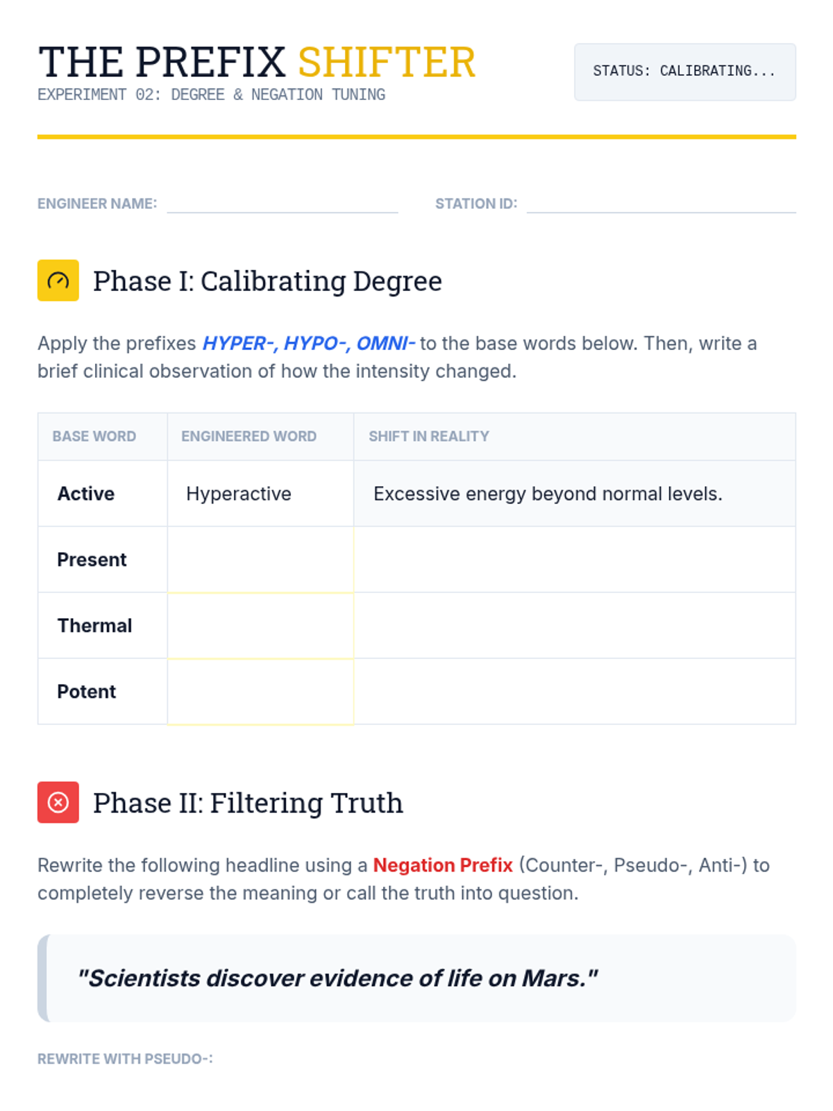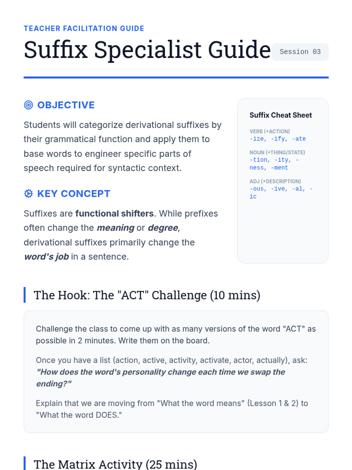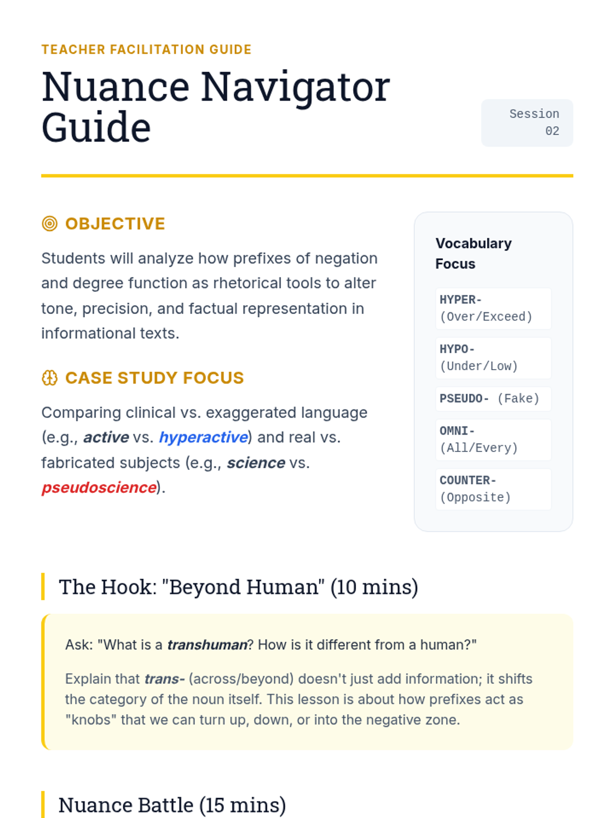 An inquiry-driven sequence for 8th-grade students exploring morphology. Students deconstruct complex words, analyze prefixes of negation and degree, master derivational suffixes for functional shifts, and apply knowledge to decode and synthesize academic terminology.