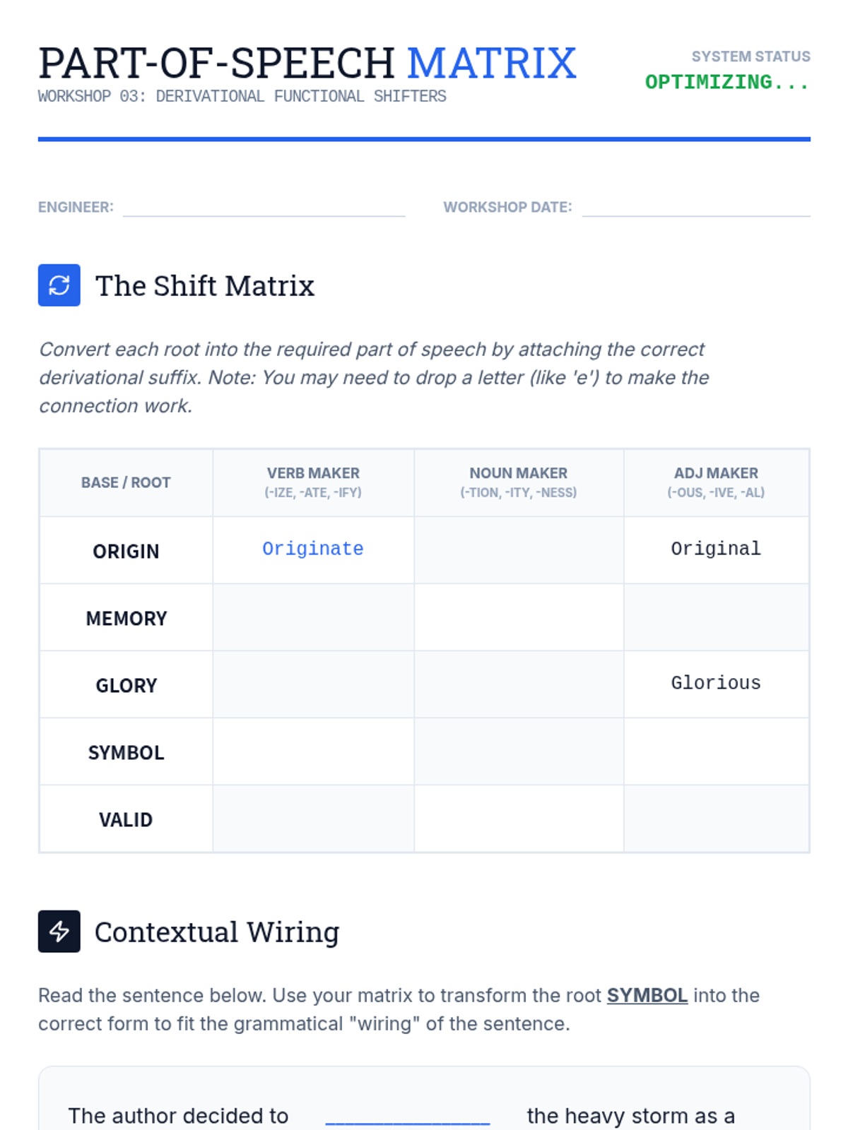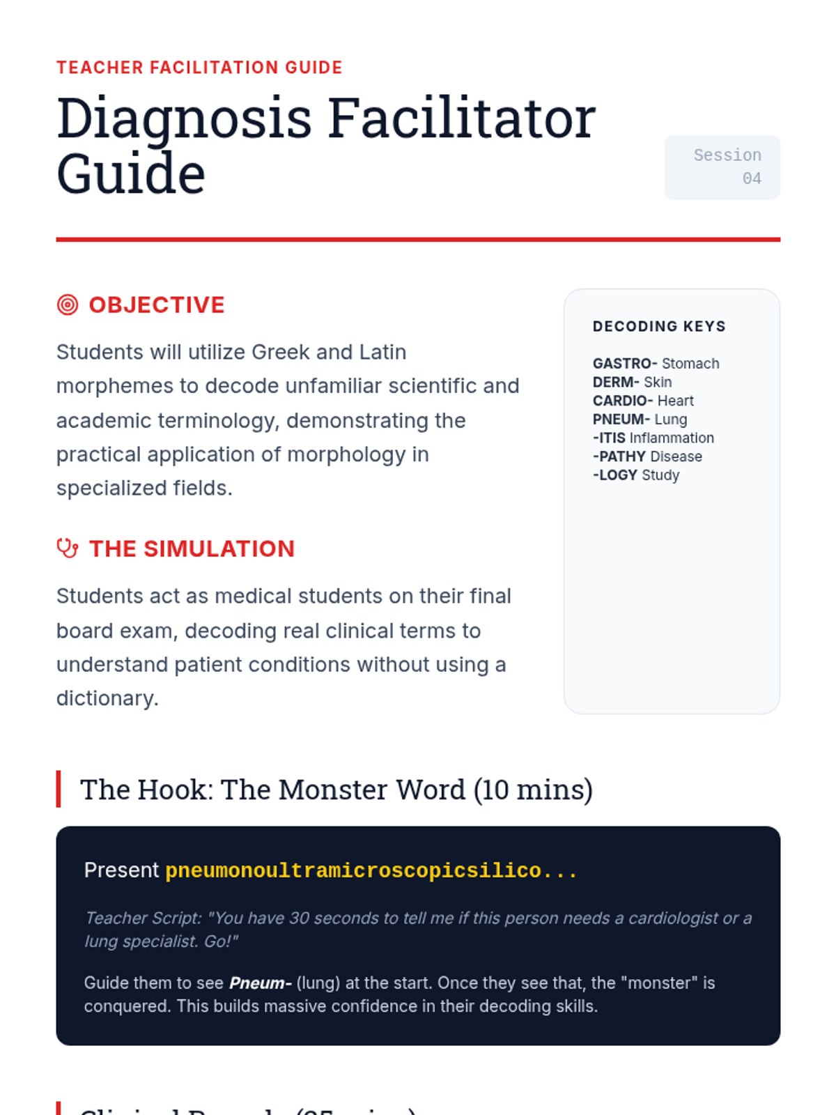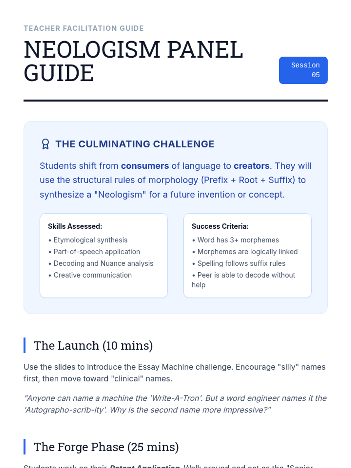An inquiry-driven sequence for 8th-grade students exploring morphology. Students deconstruct complex words, analyze prefixes of negation and degree, master derivational suffixes for functional shifts, and apply knowledge to decode and synthesize academic terminology.
