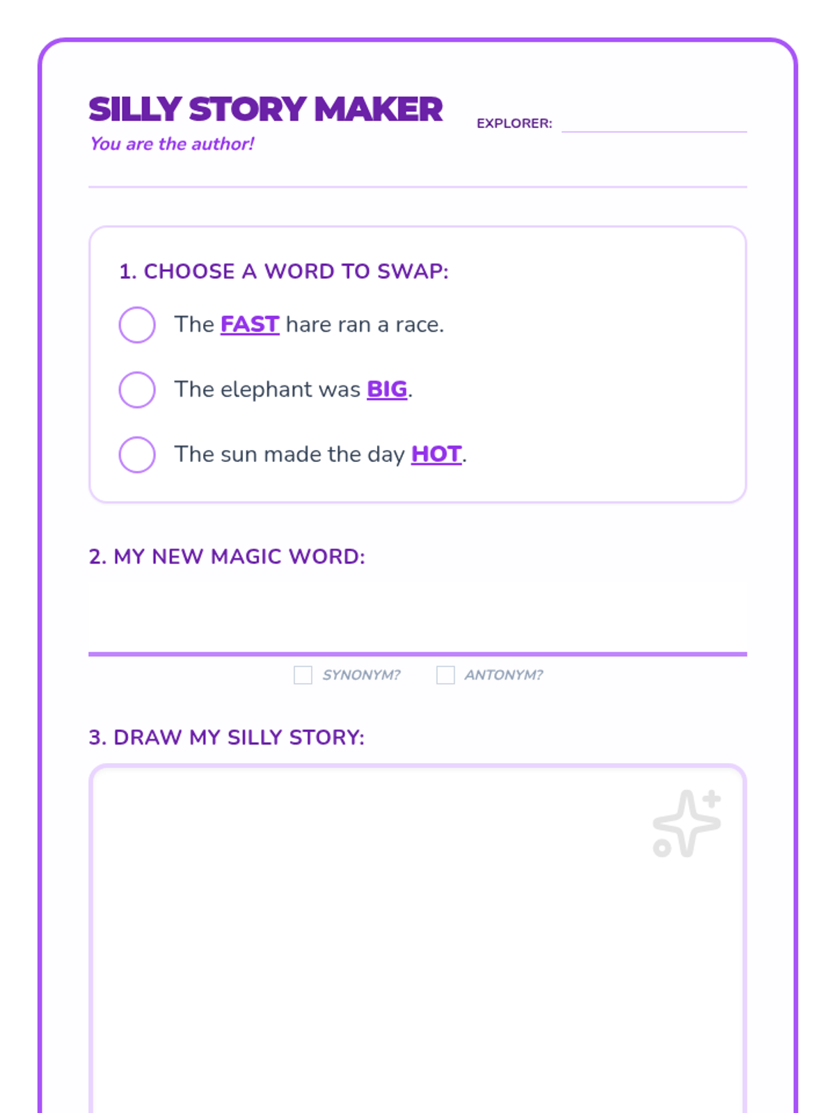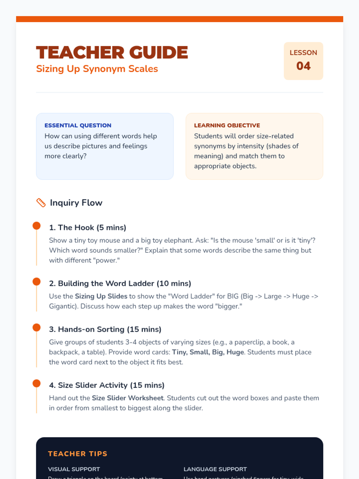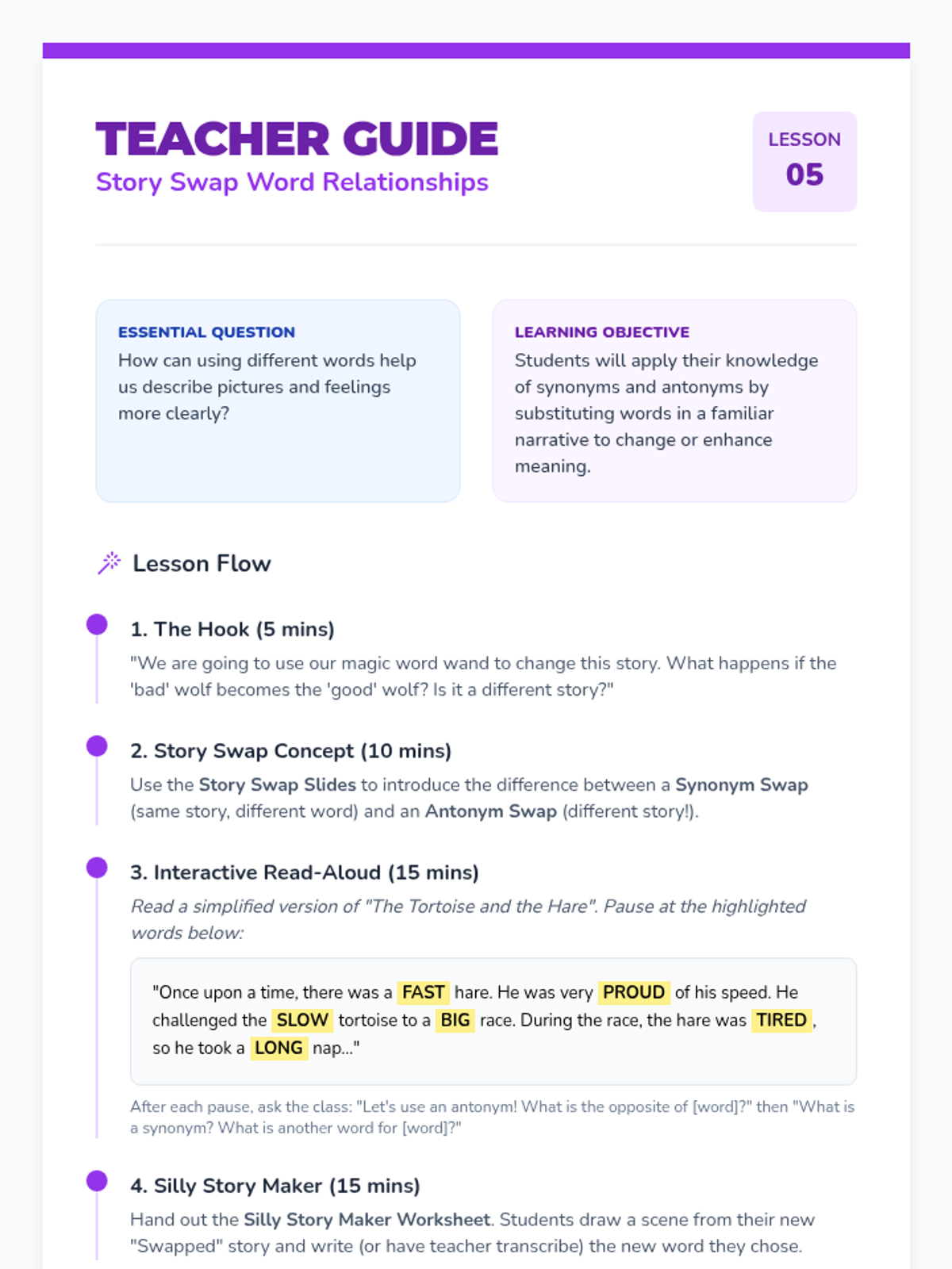 This kindergarten sequence introduces word relationships through play, visuals, and movement. Students explore antonyms (opposites) kinesthetically and visually, then transition to synonyms (same meanings) using emotions and size descriptions, culminating in a creative story retelling application.