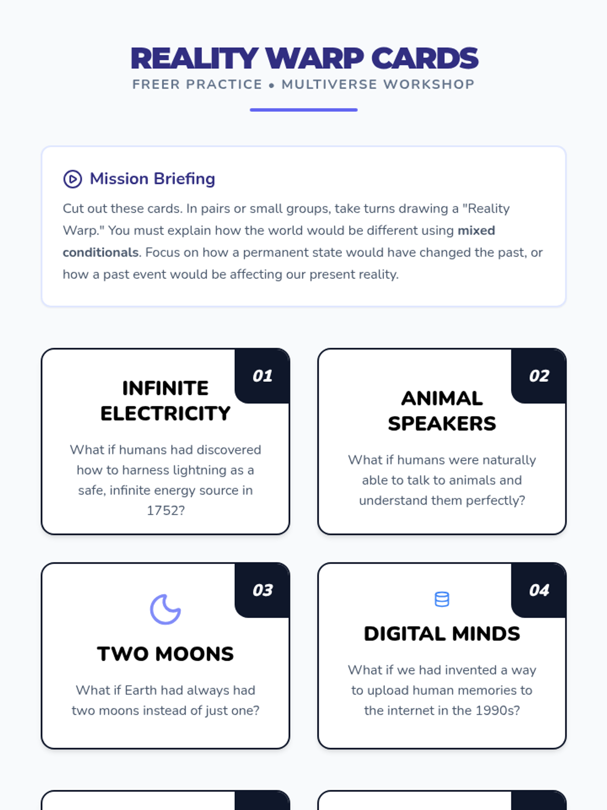 A comprehensive unit on mixed conditionals where students explore hypothetical scenarios involving past actions with present consequences and permanent states with past outcomes, all set within a 'multiverse' theme.