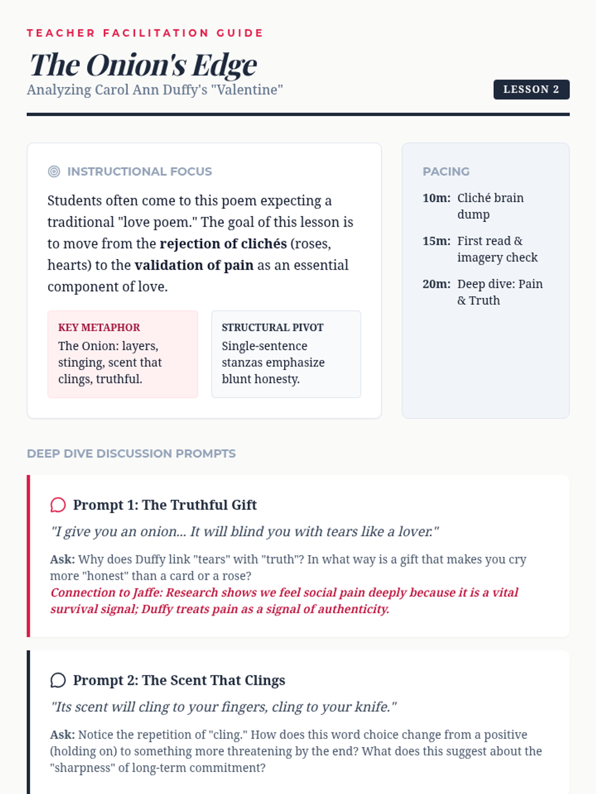 A 9th-grade English RLA unit exploring the physical and emotional intersection of love and pain through scientific analysis and poetic metaphor. Students synthesize Eric Jaffe's 'Why Love Literally Hurts' with Carol Ann Duffy's poem 'Valentine' to craft argumentative synthesis correspondence.