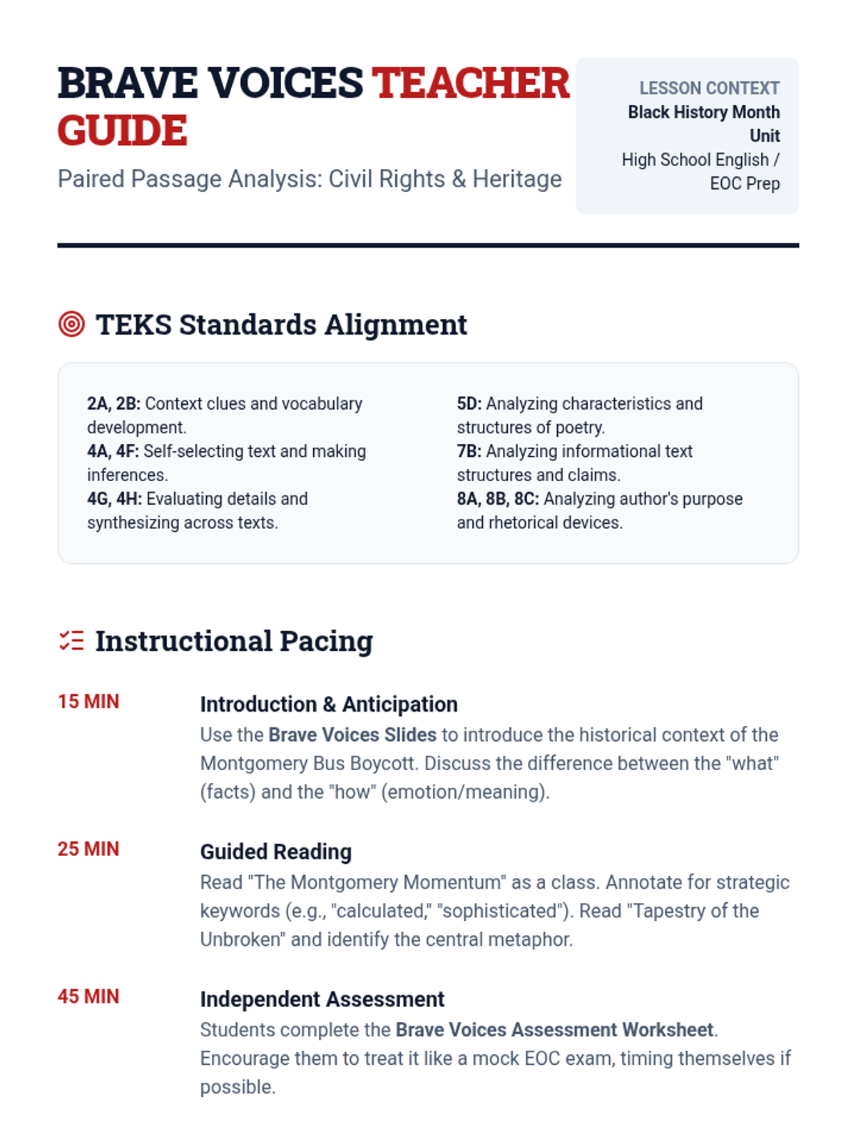 A 4-day intensive study of a complex historical text focused on Author's Purpose and Craft, specifically designed for English 1 and 2 STAAR EOC preparation. Students analyze diction, imagery, syntax, and rhetorical devices within a 1200-Lexile historical narrative.