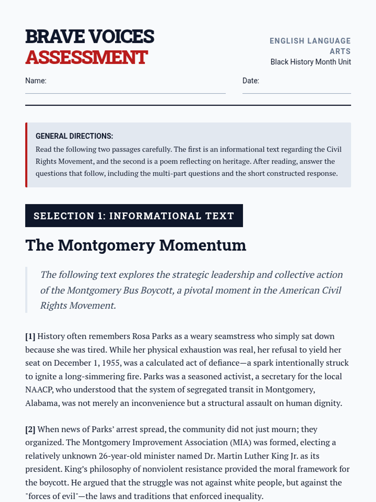 A unit exploring Black history, culture, and the Civil Rights Movement through various literary and informational lenses to build critical reading and writing skills.