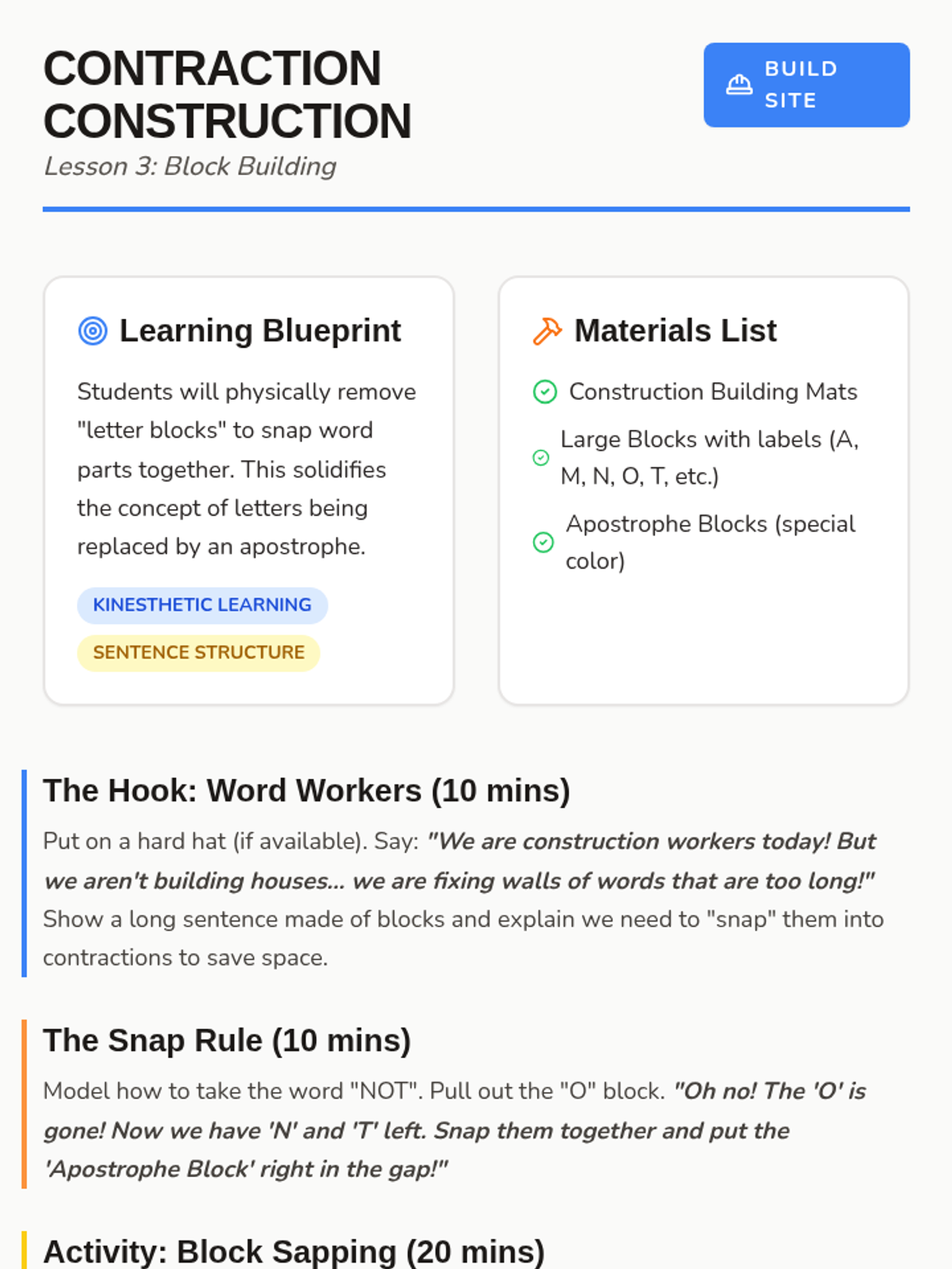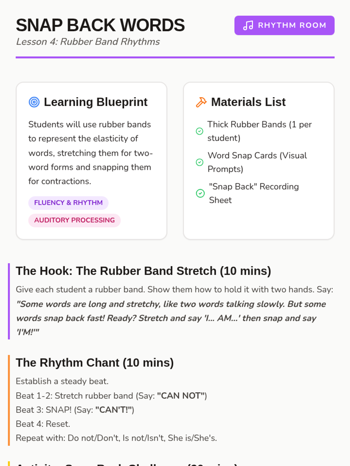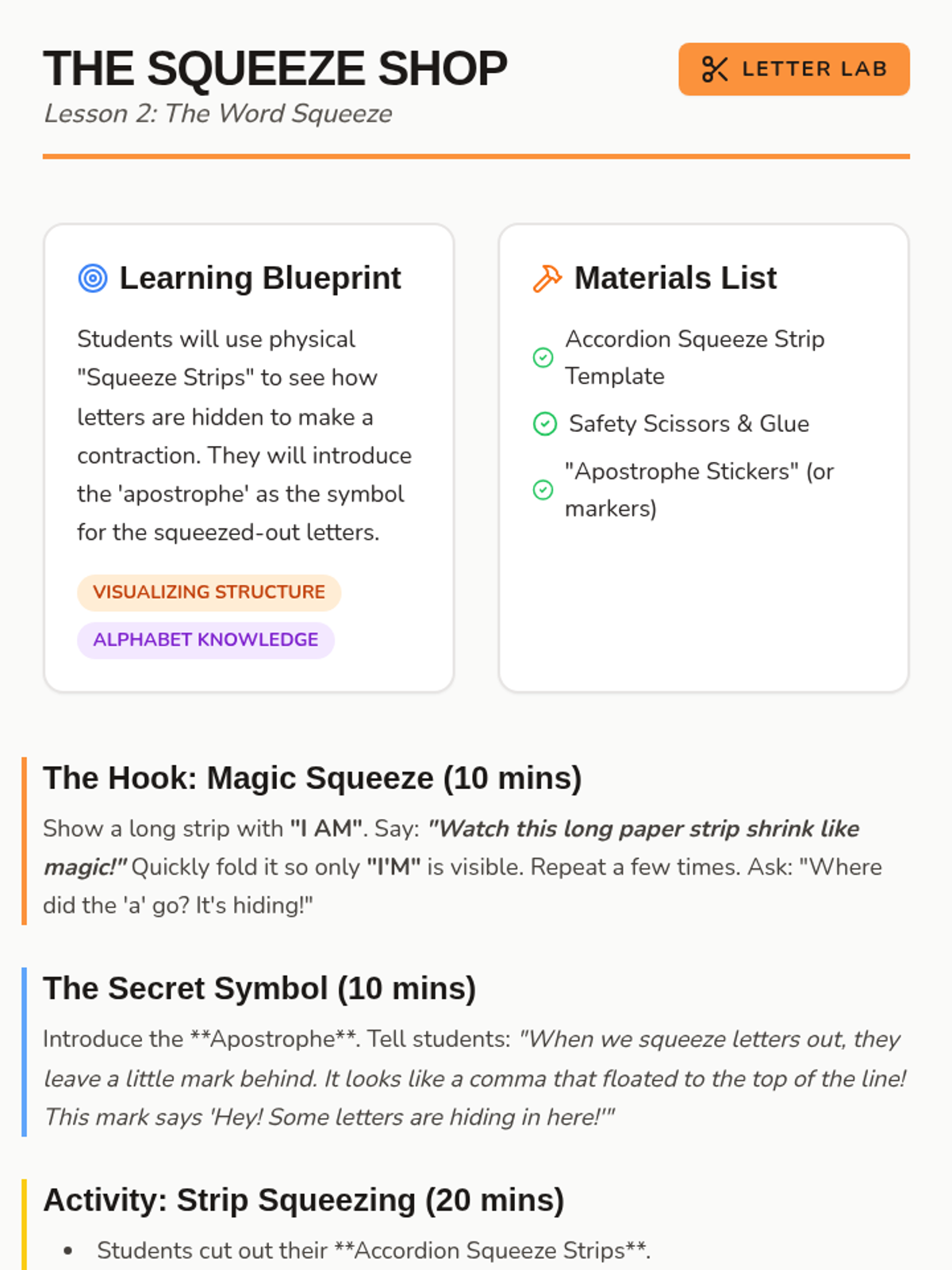 A Kindergarten sequence focused on the kinesthetic and visual understanding of contractions as word mergers. Students use physical manipulatives like accordion strips, building blocks, and rubber bands to visualize how two words become one shorter word.