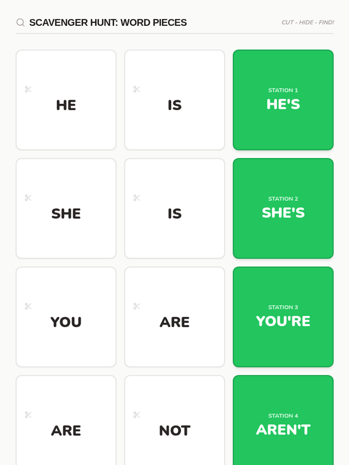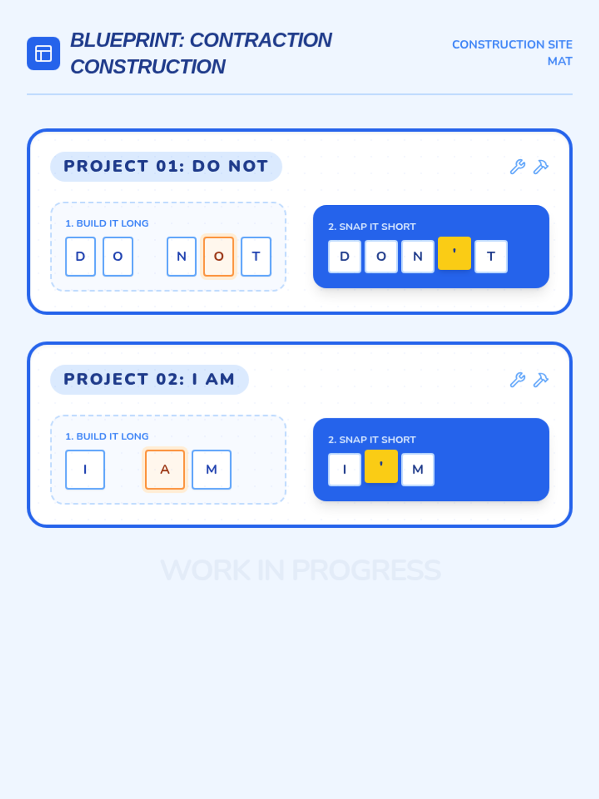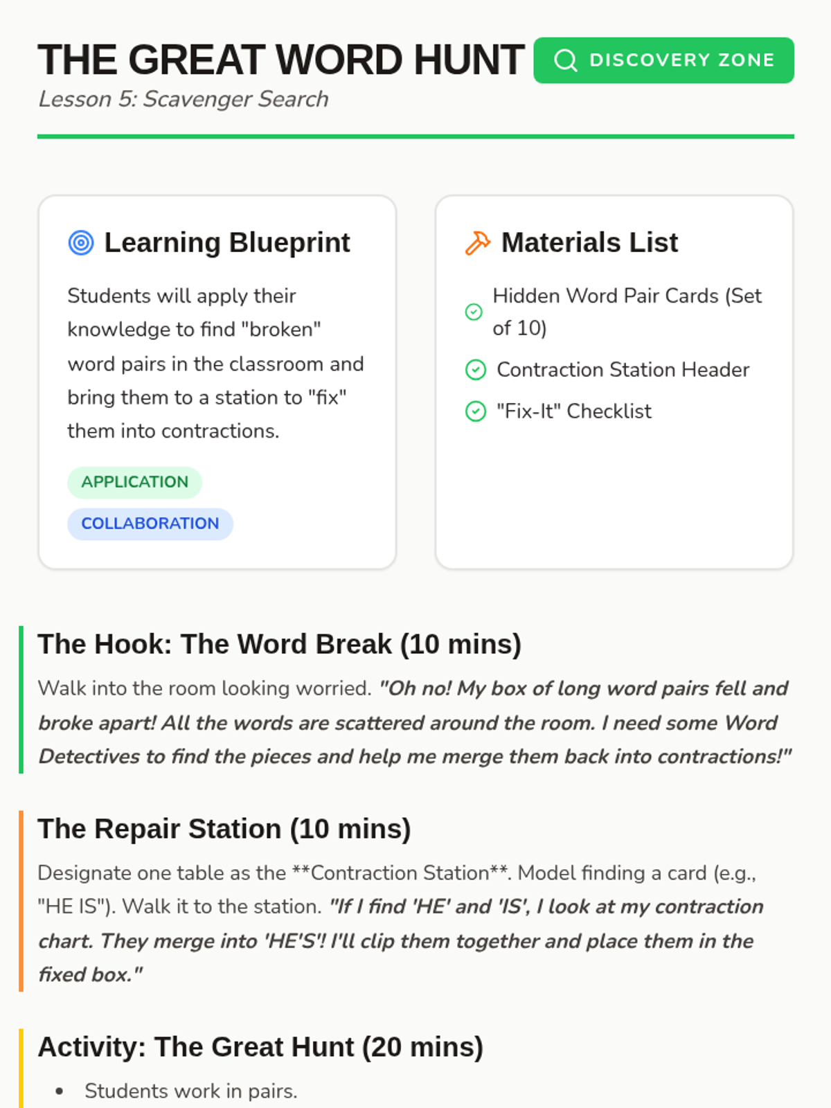 A Kindergarten sequence focused on the kinesthetic and visual understanding of contractions as word mergers. Students use physical manipulatives like accordion strips, building blocks, and rubber bands to visualize how two words become one shorter word.