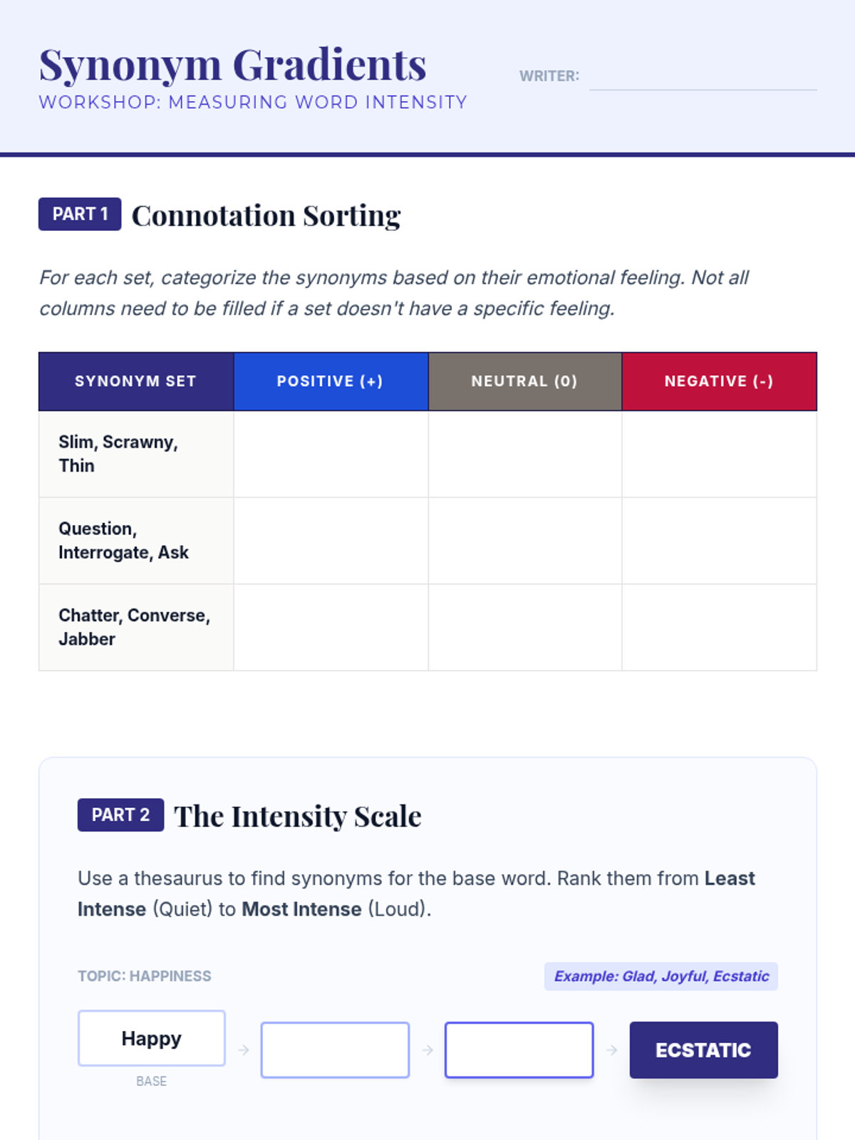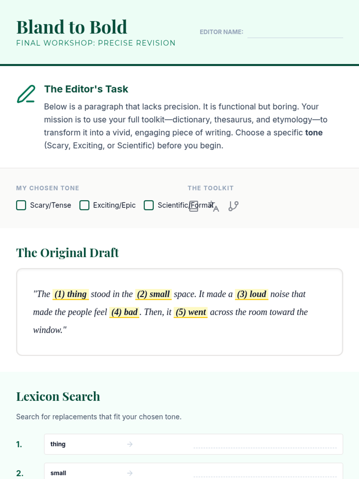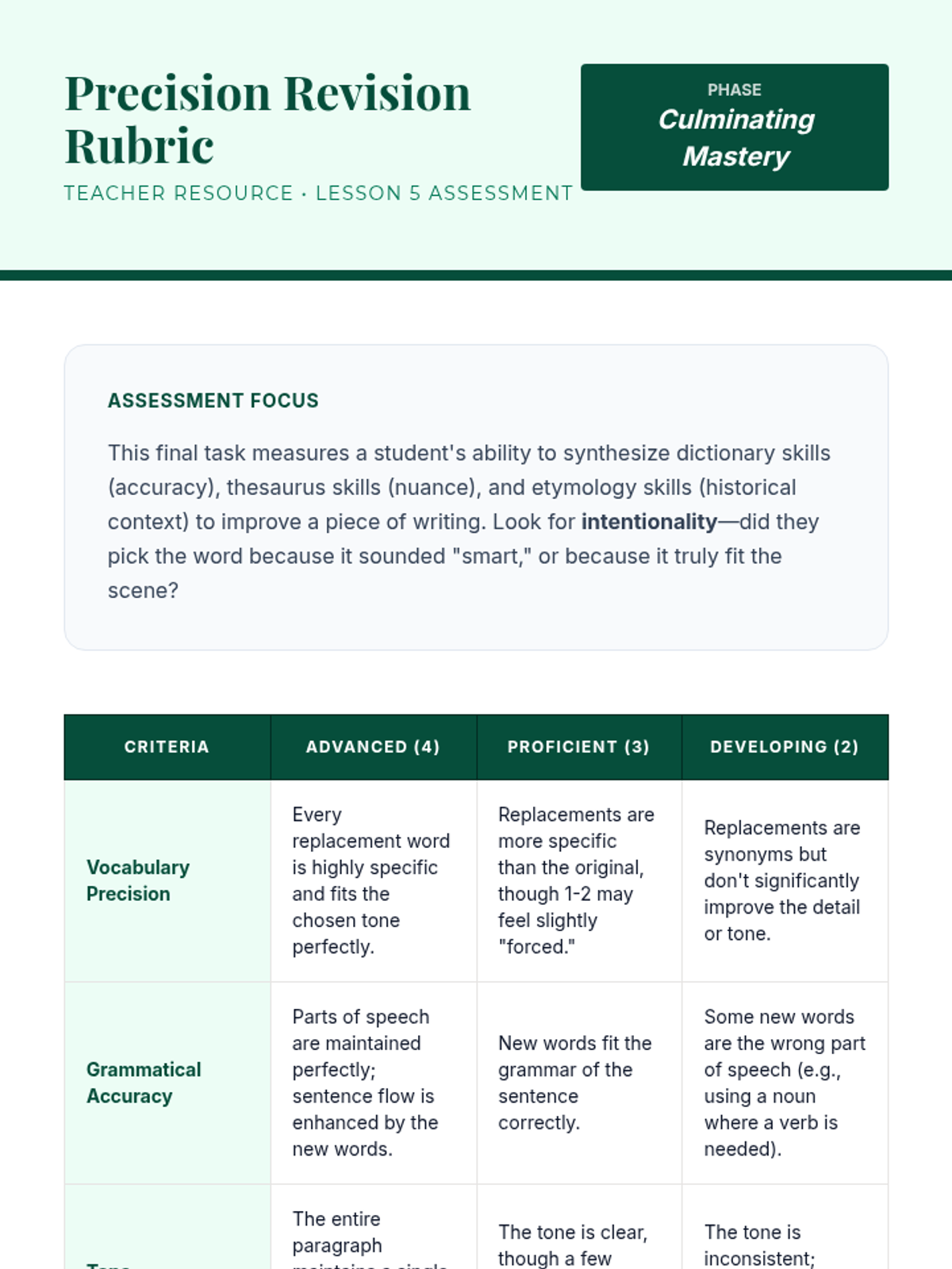 A 5-lesson unit for 7th-grade students focused on mastering dictionary and thesaurus skills, exploring etymology, and refining writing through precise word choice and nuance. Students transition from simple lookups to sophisticated linguistic analysis.