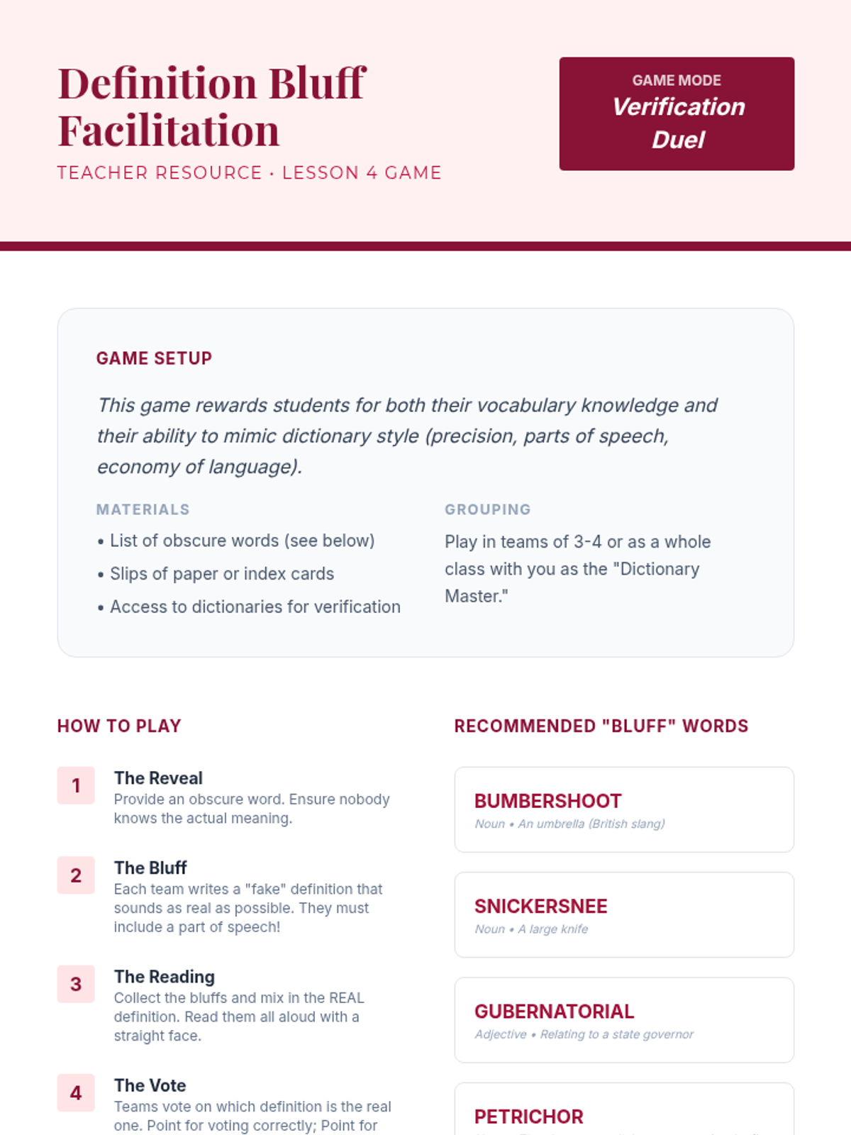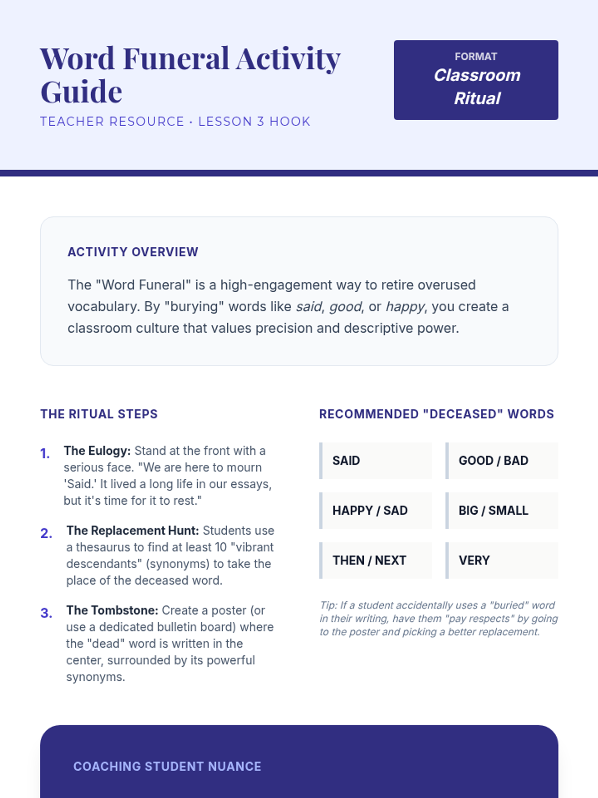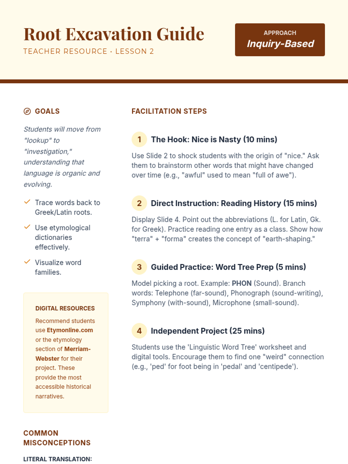 A 5-lesson unit for 7th-grade students focused on mastering dictionary and thesaurus skills, exploring etymology, and refining writing through precise word choice and nuance. Students transition from simple lookups to sophisticated linguistic analysis.