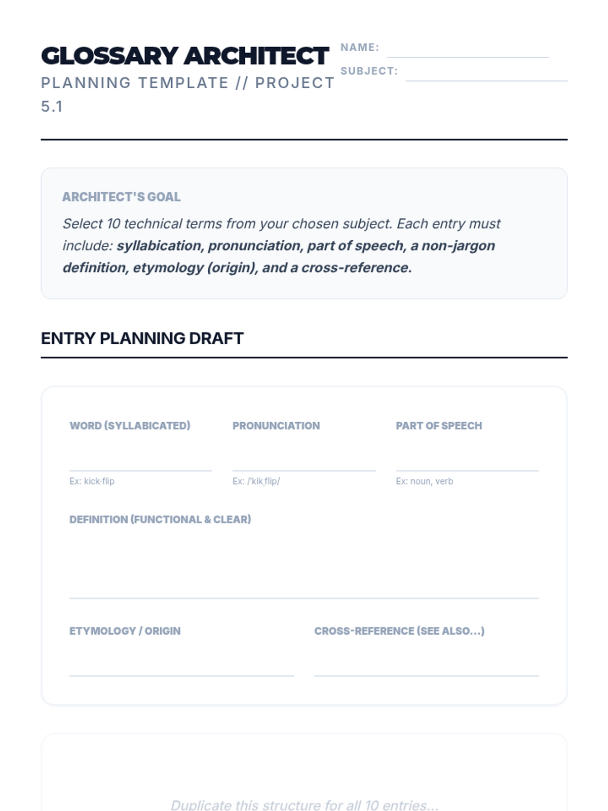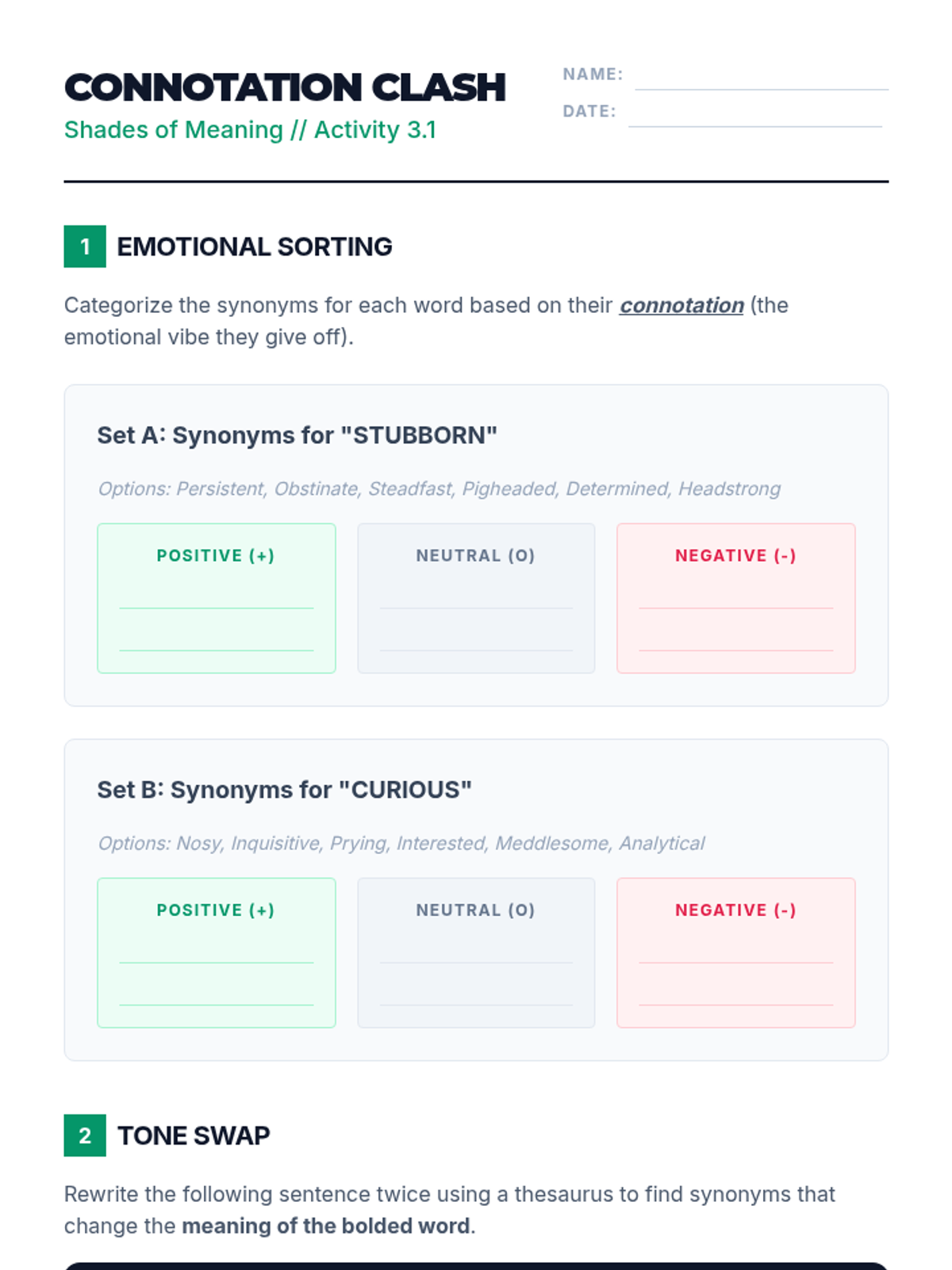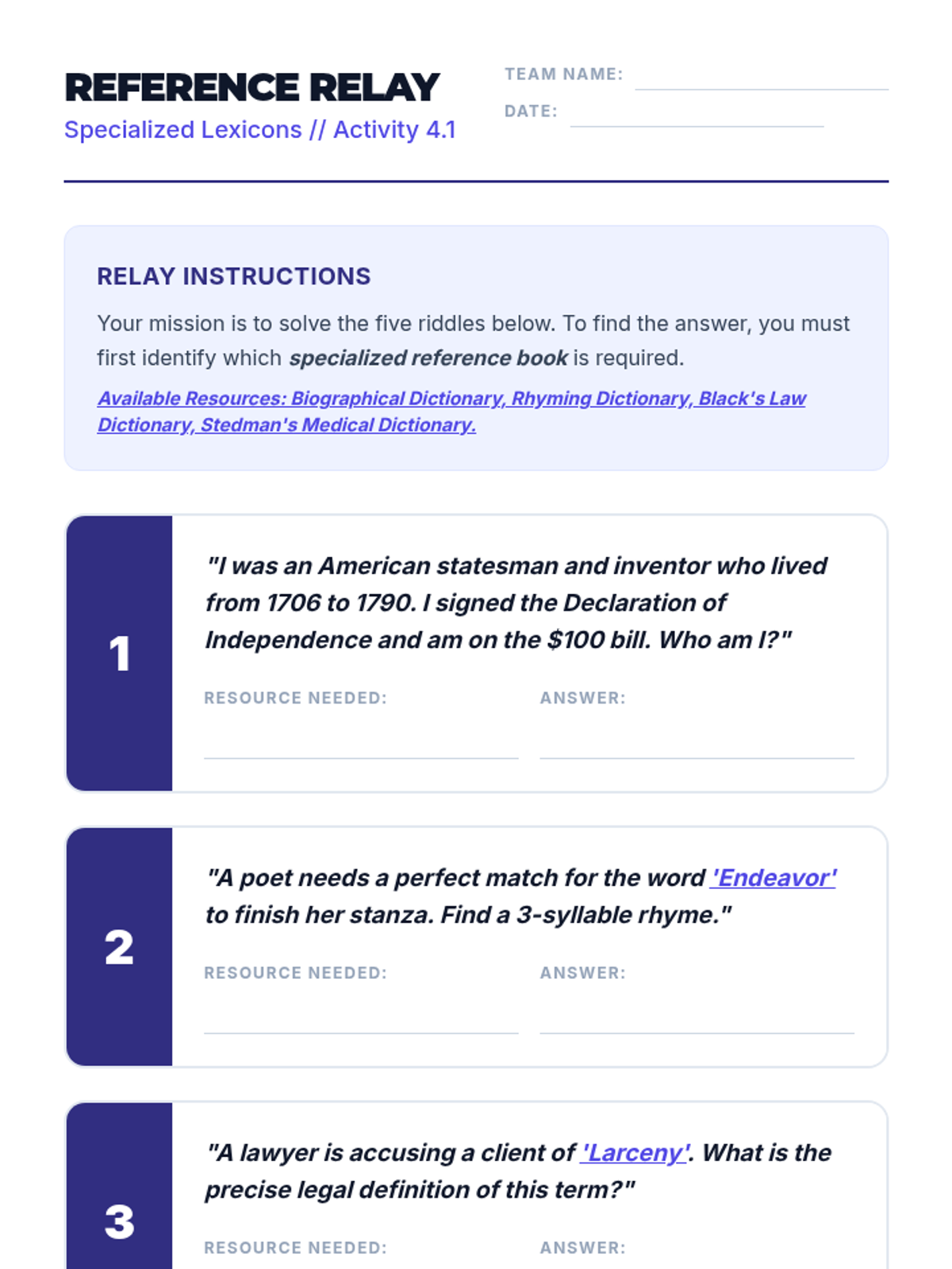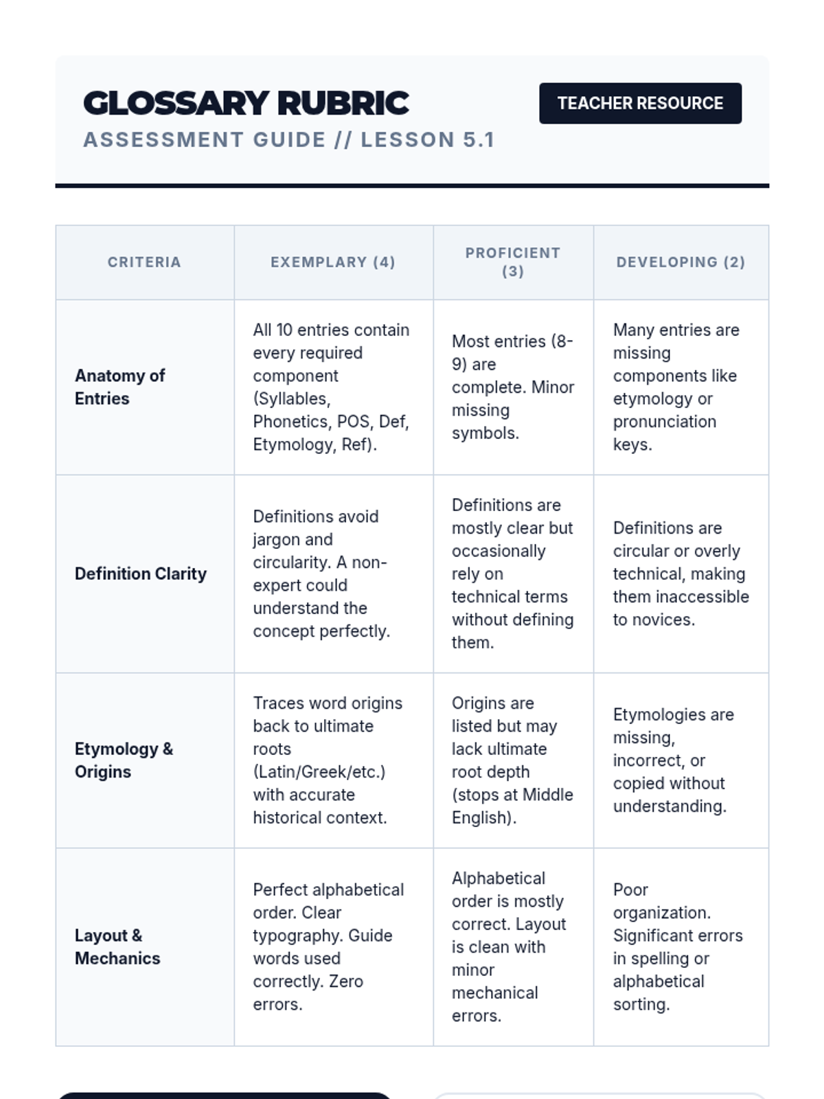 A comprehensive sequence for 9th-grade students to master the use of dictionaries, thesauri, and specialized reference tools. Students will move from understanding the anatomy of a dictionary entry to analyzing the nuances of connotation and etymology, culminating in the creation of their own subject-specific glossaries.