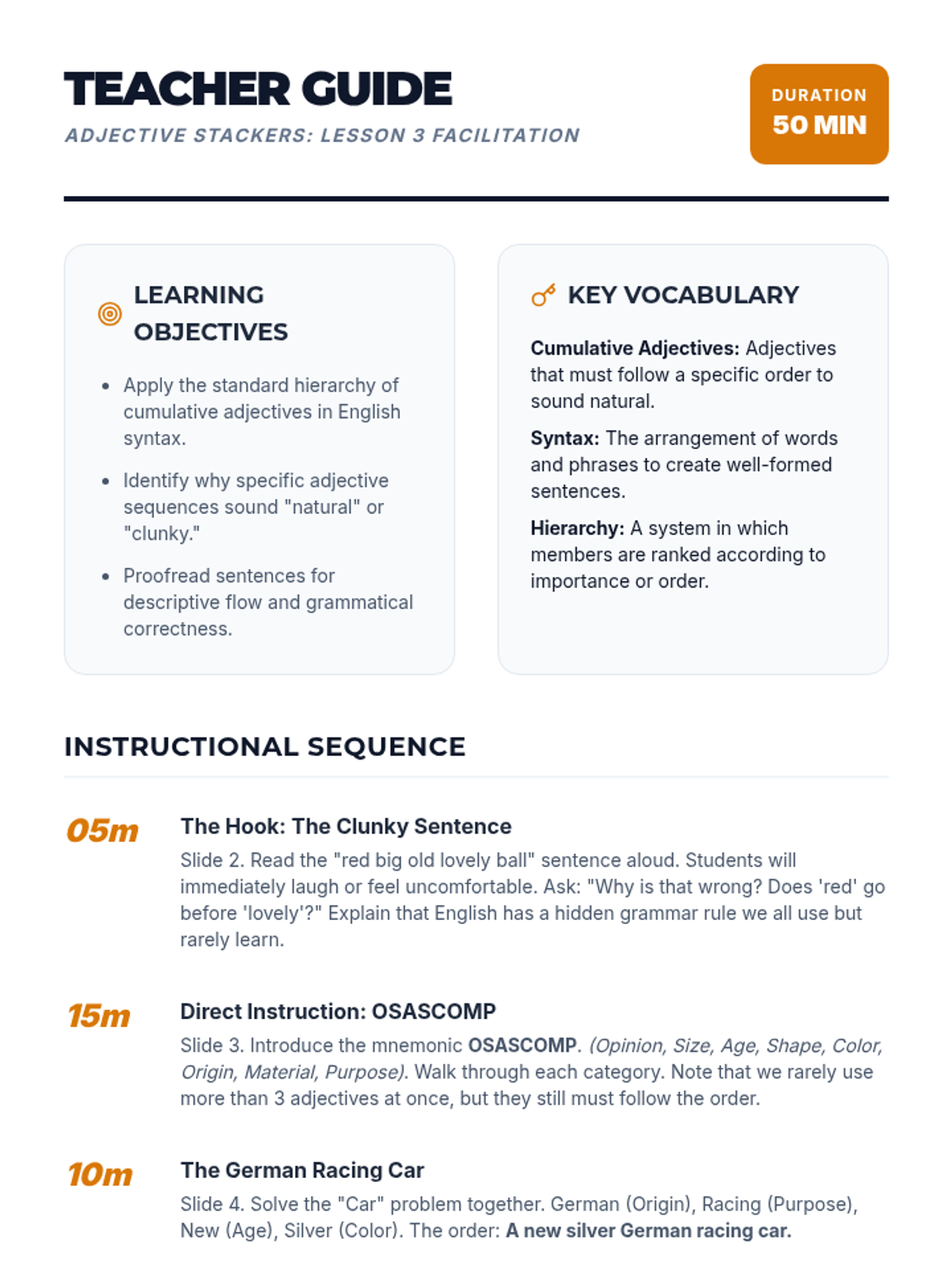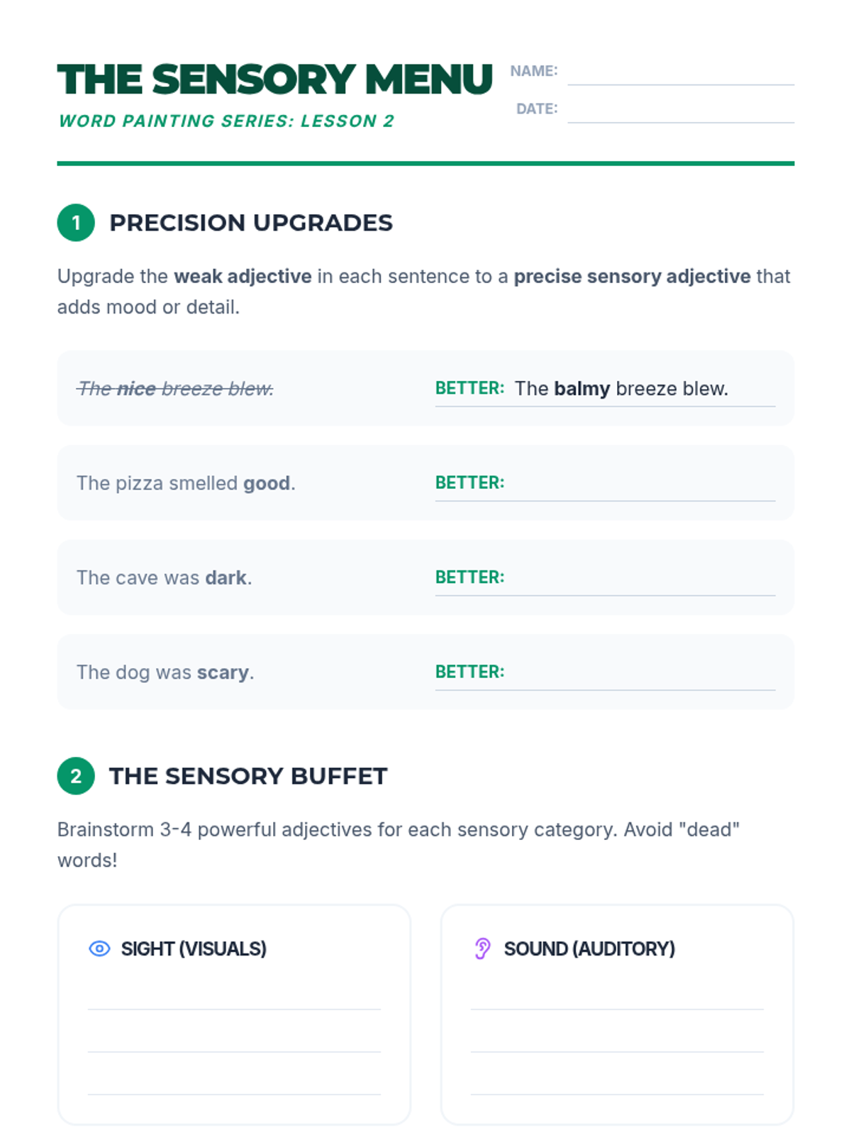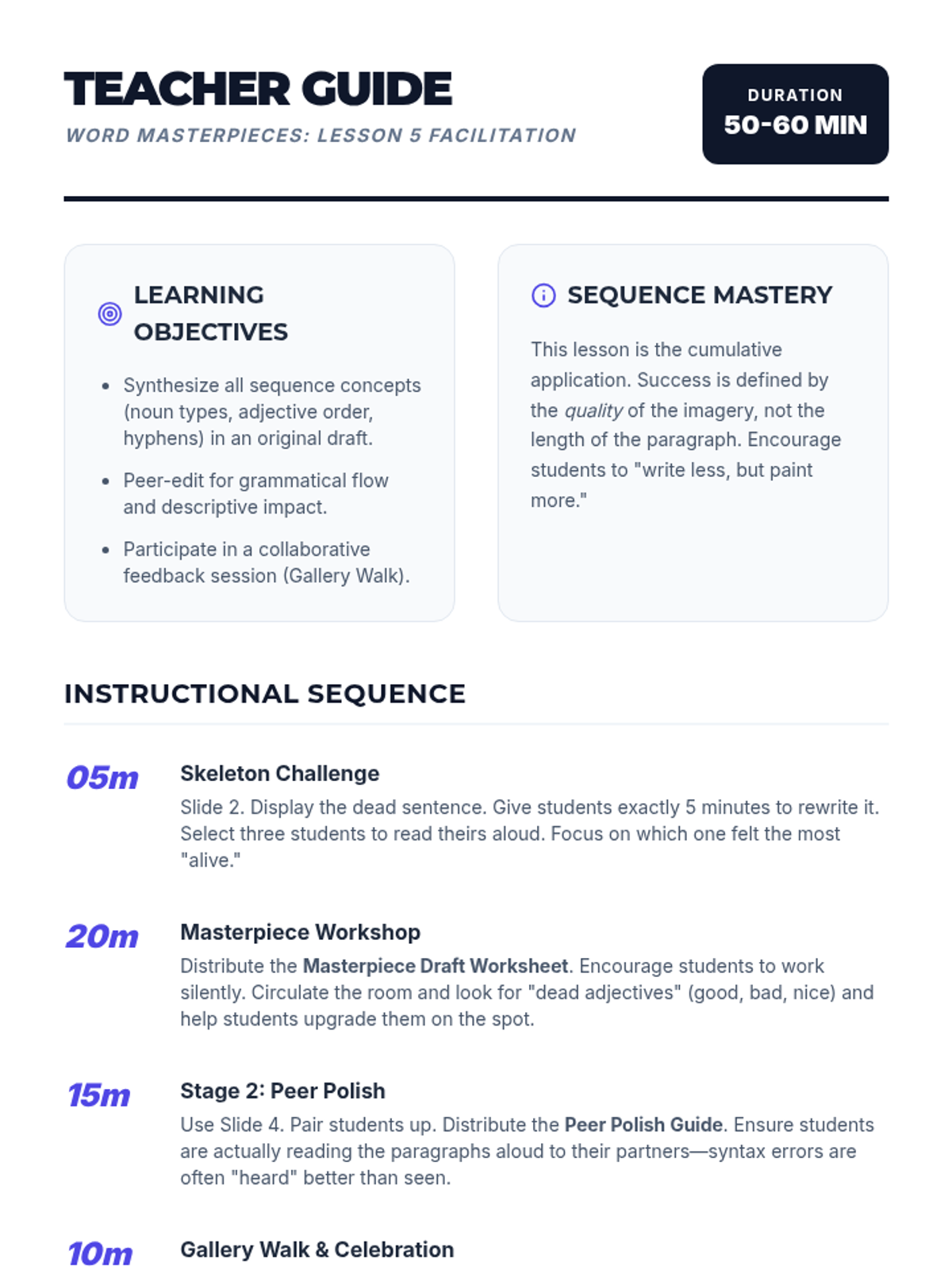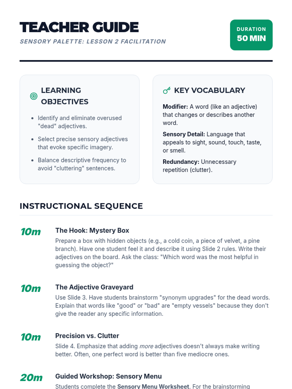 This sequence guides 7th-grade students from using generic vocabulary to crafting high-definition descriptive writing through the precise use of nouns and adjectives. Students explore concrete vs. abstract nouns, sensory adjectives, the royal order of adjectives, and hyphenated modifiers.
